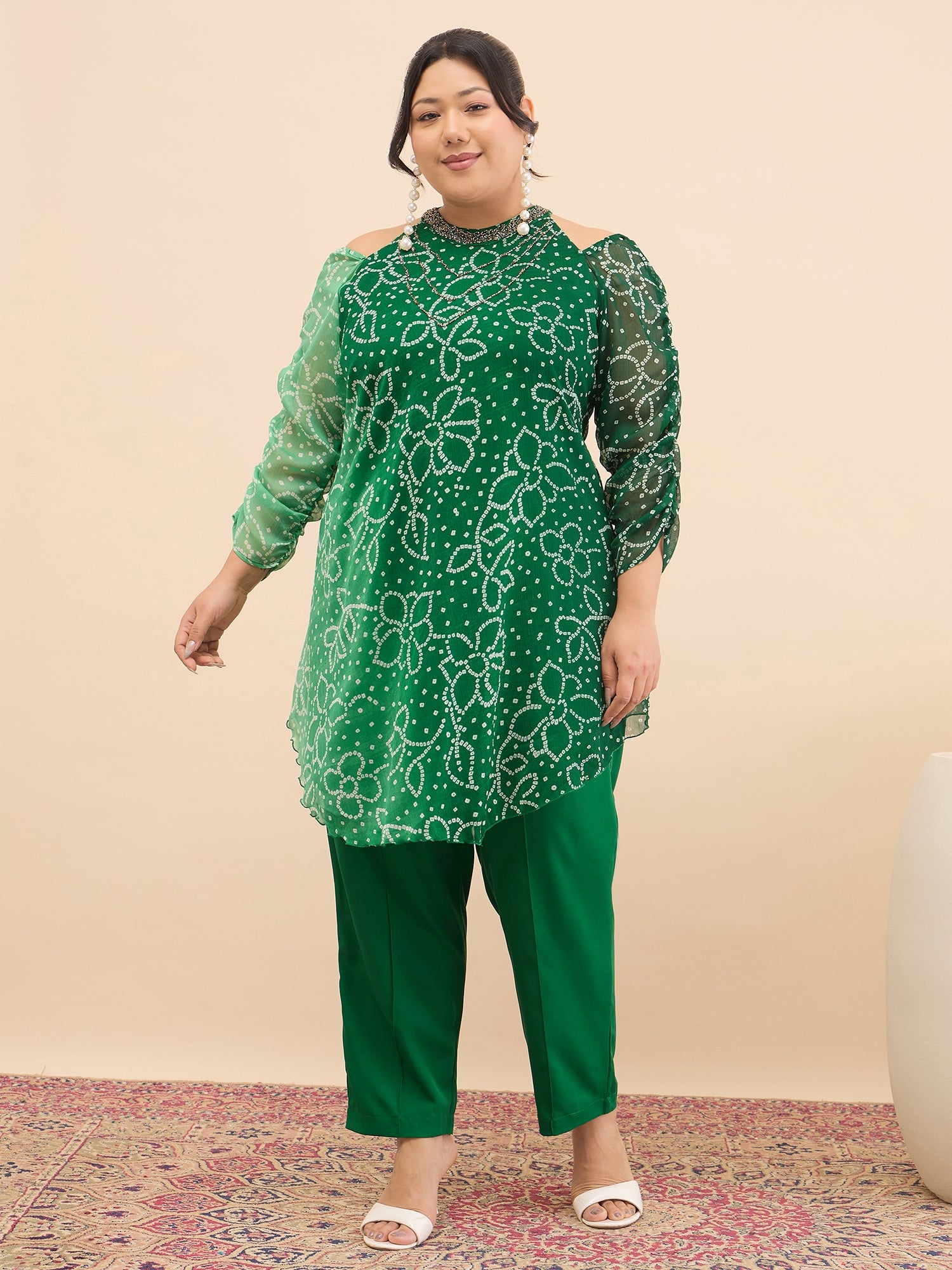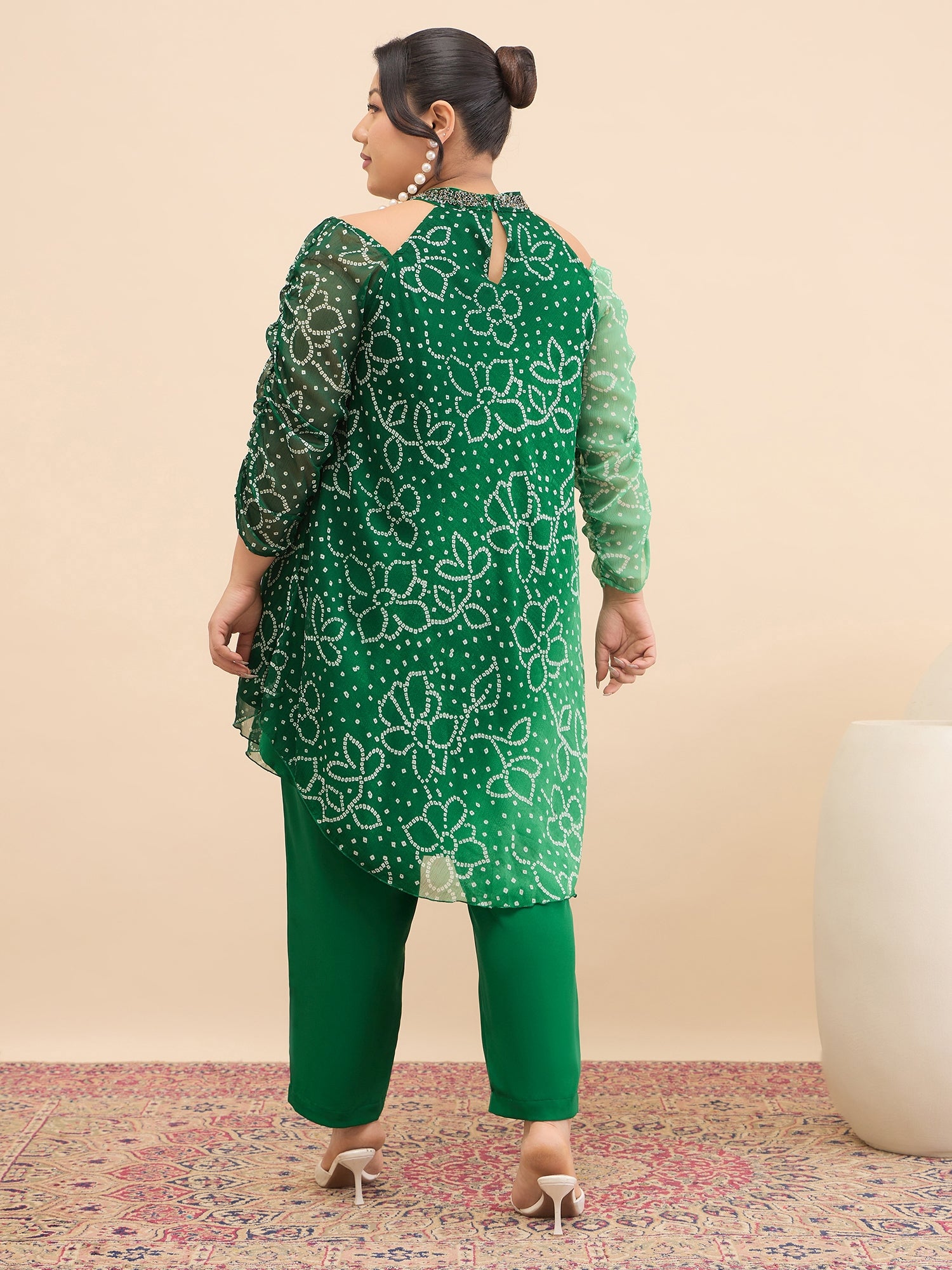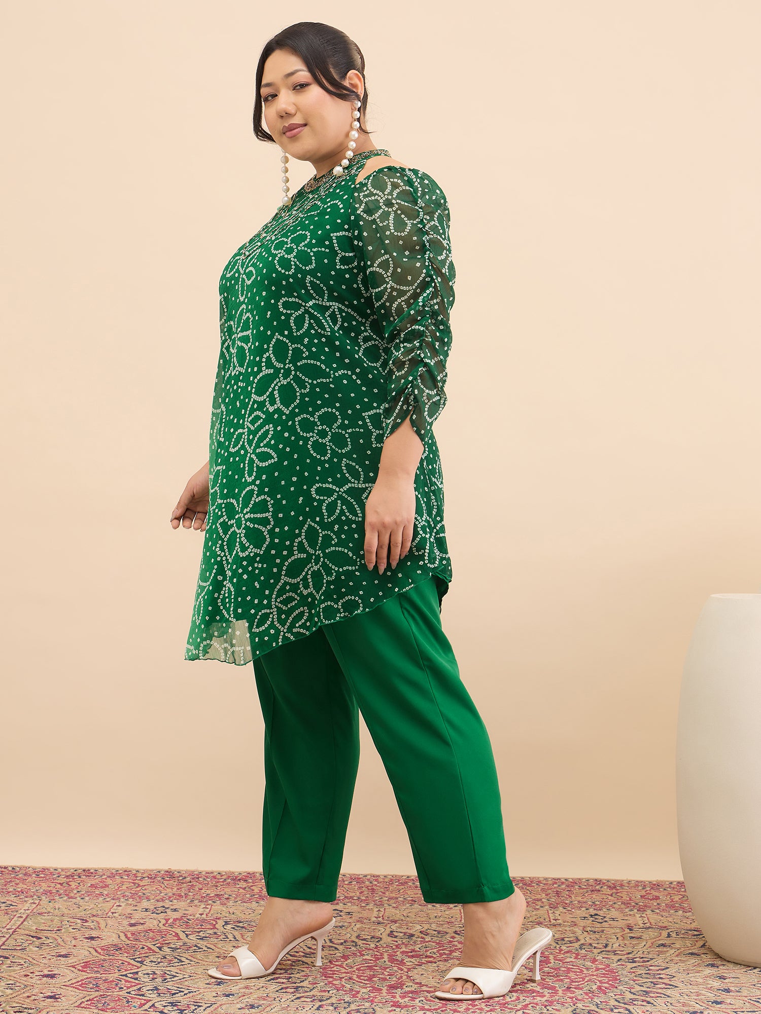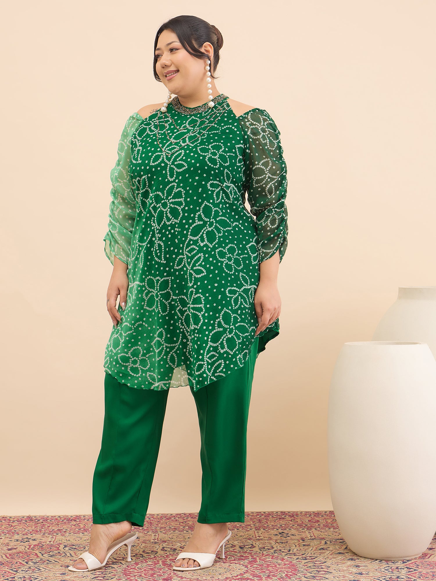 Antheaa Curve Embellished & Printed Mandarin Collar Top & Trousers Co-Ords