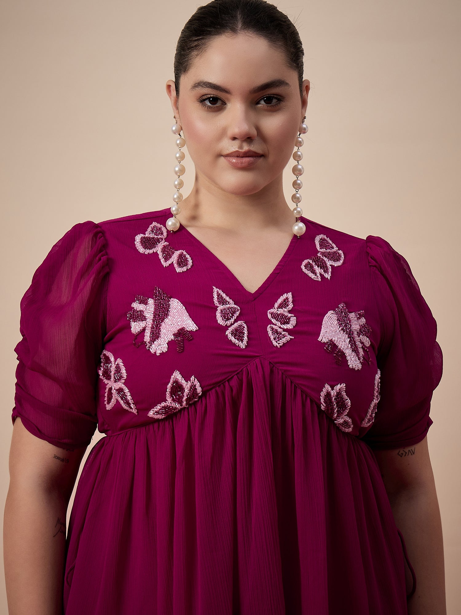 Violet & pink embellished top, has v neck, has short sleeves, has straight hemline