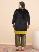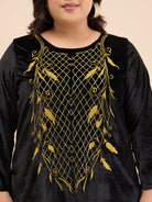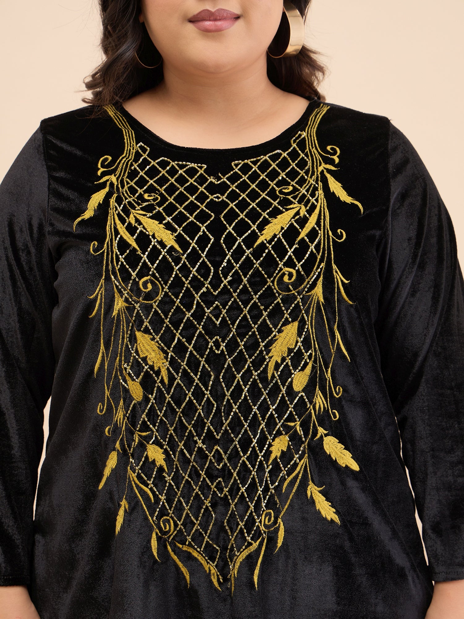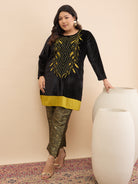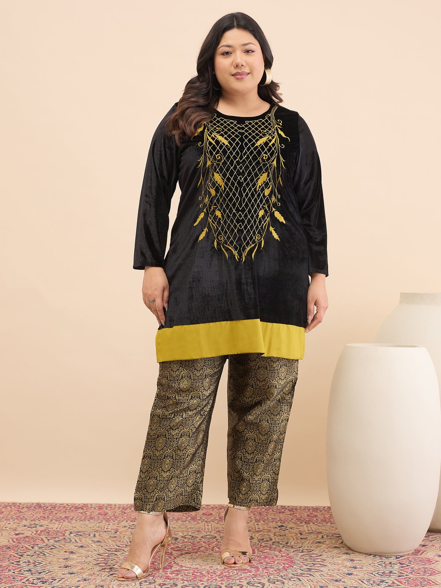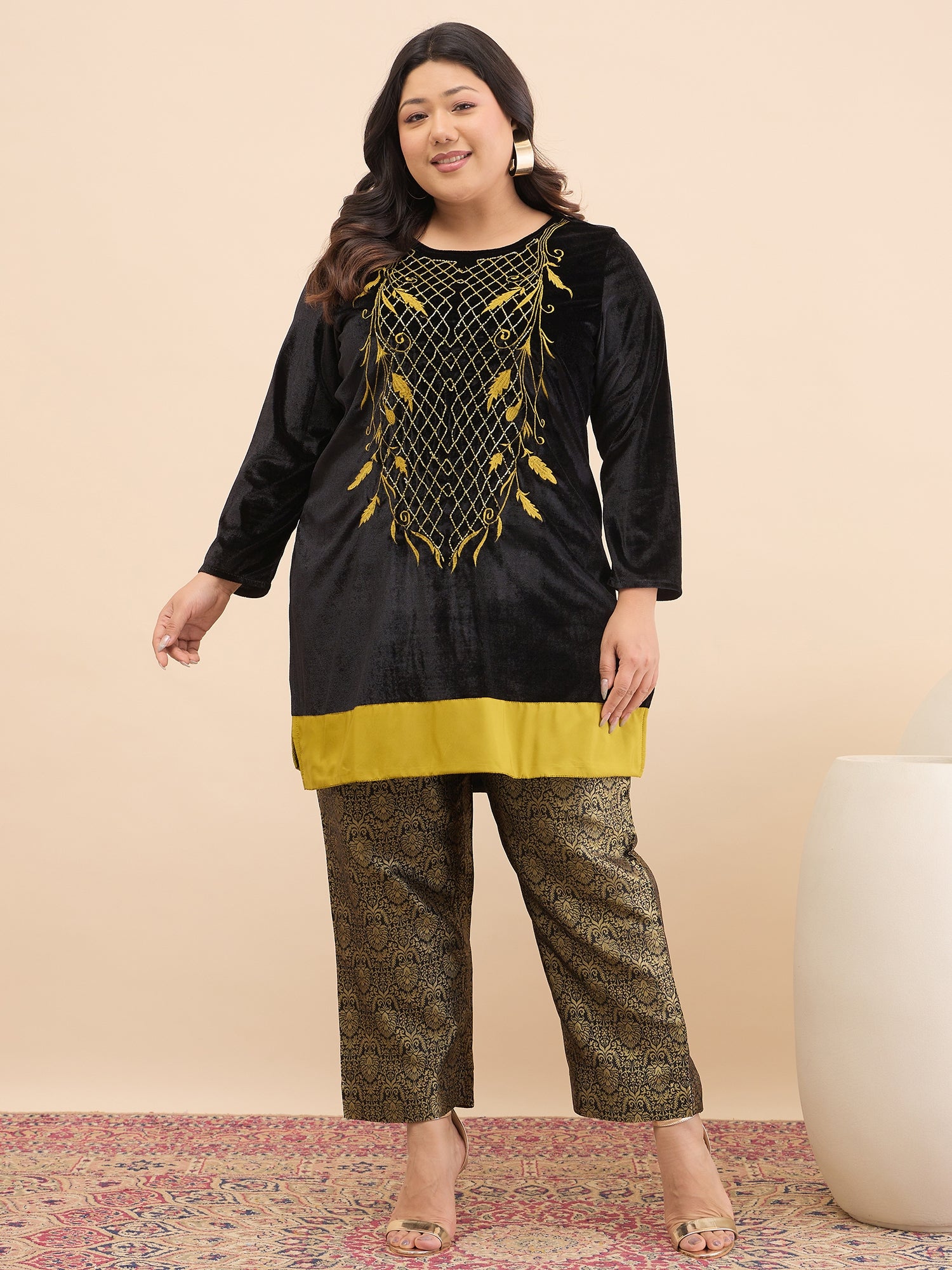 Black & yellow embroidered top, has a round neck and long sleeves, secured with slip-on closure