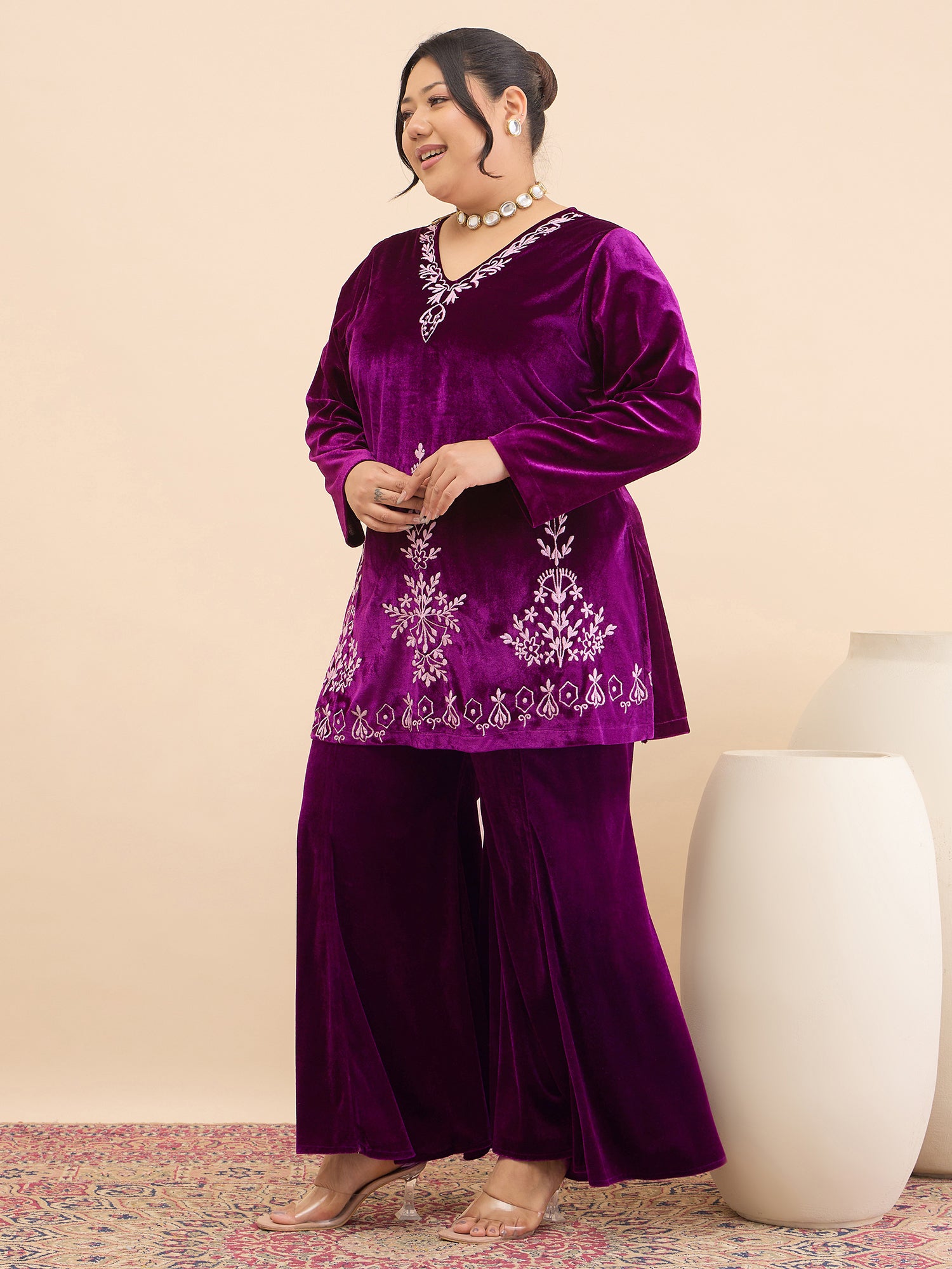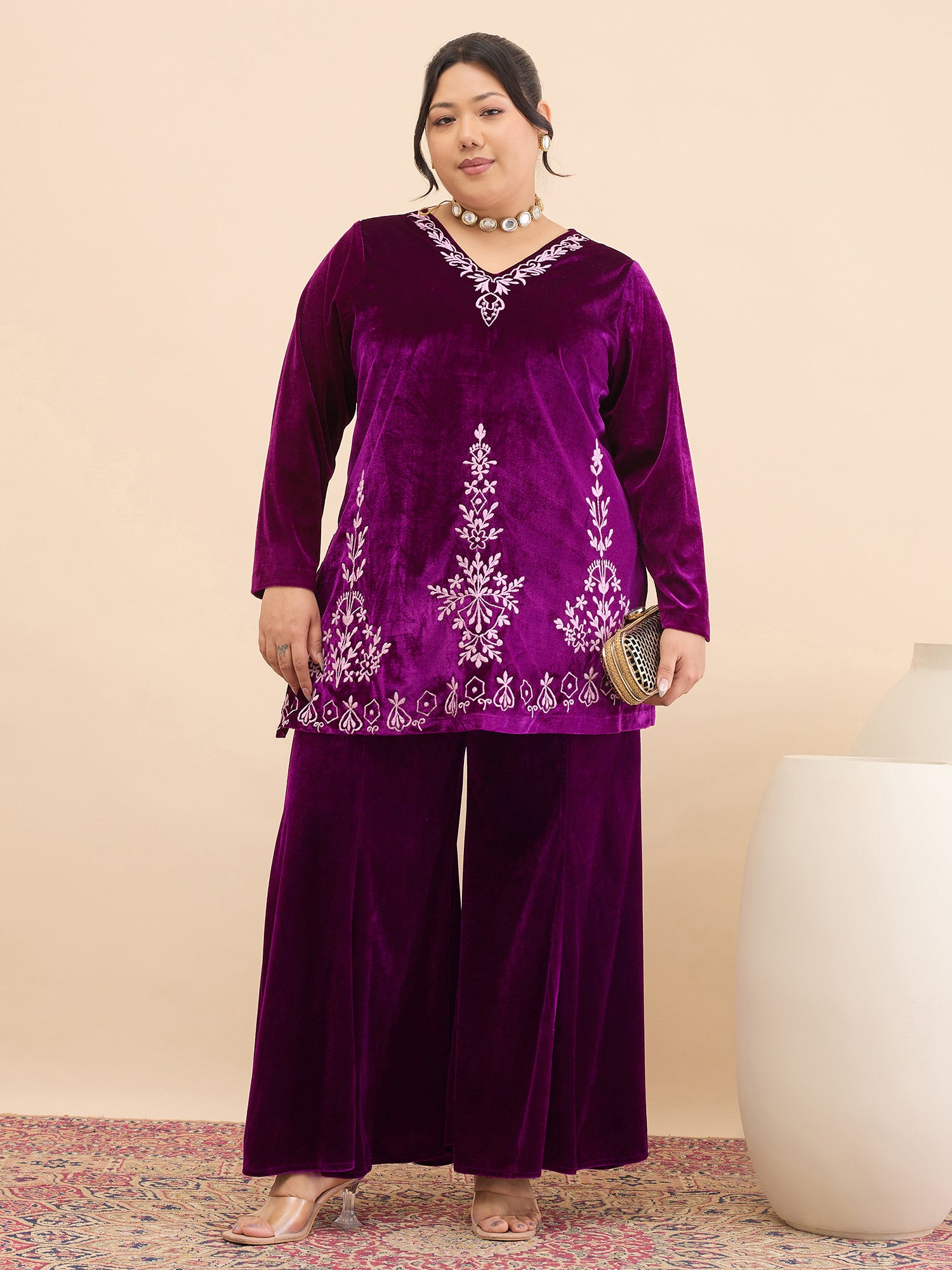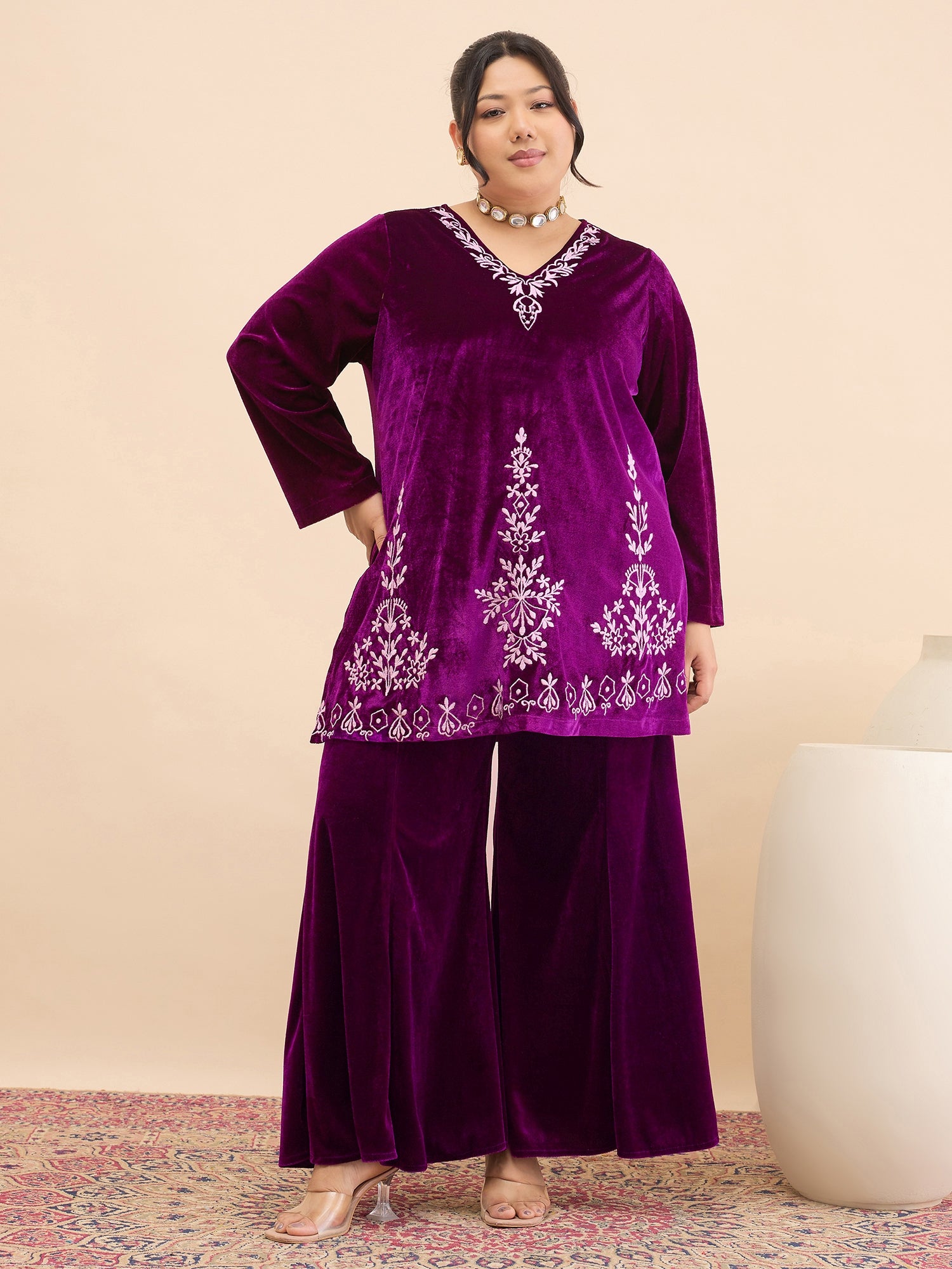 Antheaa Curve Embroidered V-Neck Top & Palazzos Co-Ords