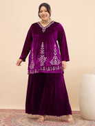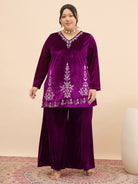 Purple Embroidered top, has a v- neck and long sleeves, secured with slip-on closure
