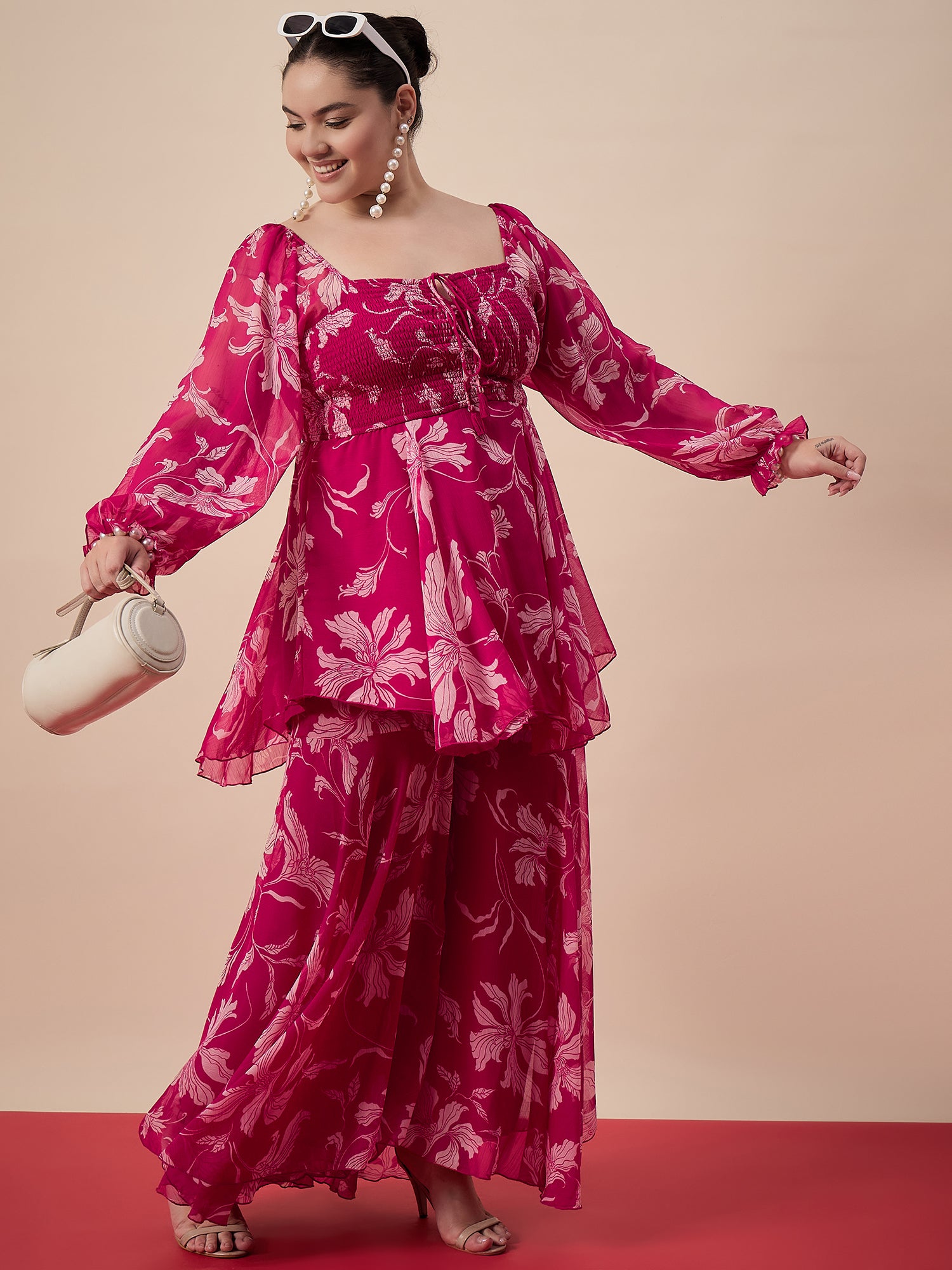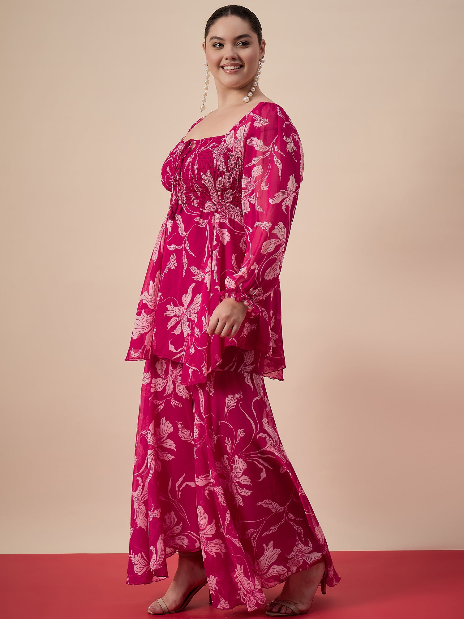 Pink and white floral printed top, has square neck, has long sleeves, has flared hemline