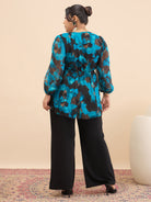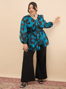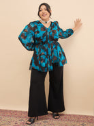 Blue & black printed top, has a v- neck and long sleeves, secured with slip-on closure