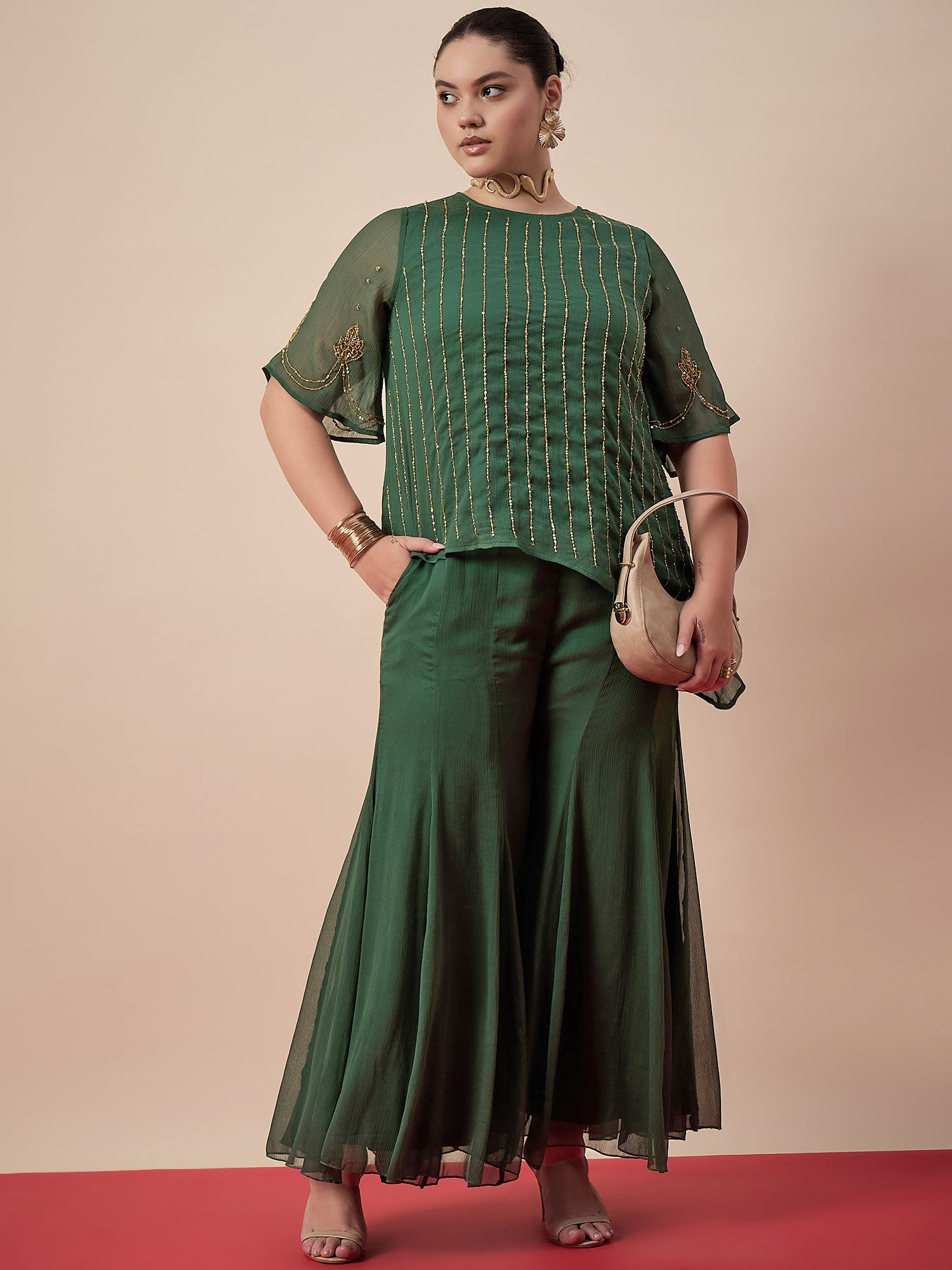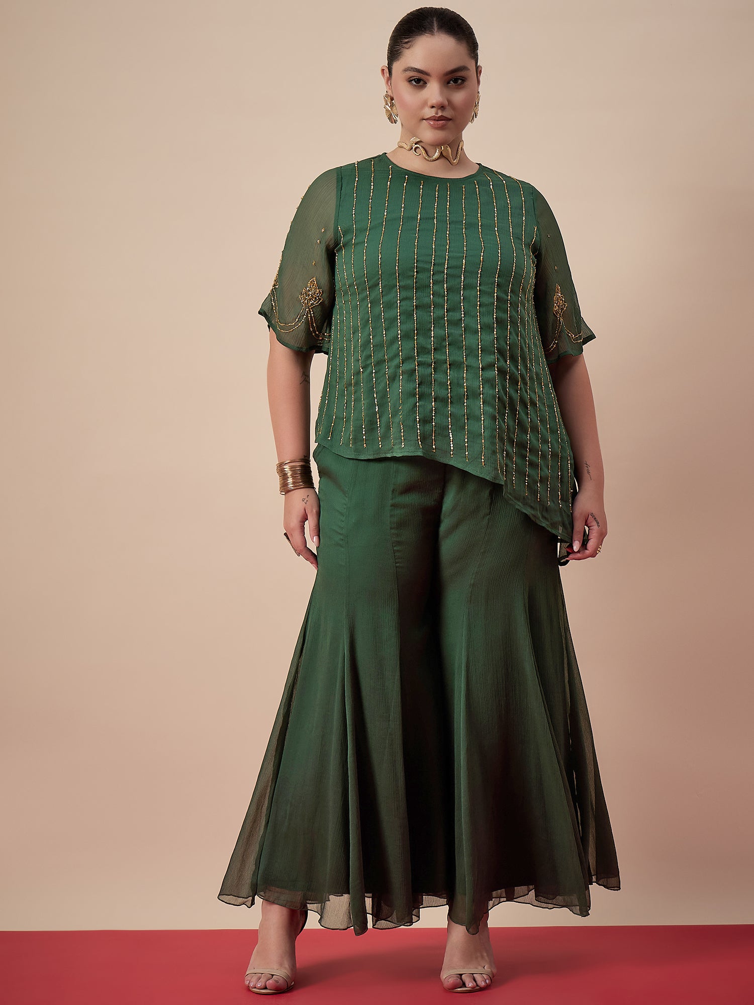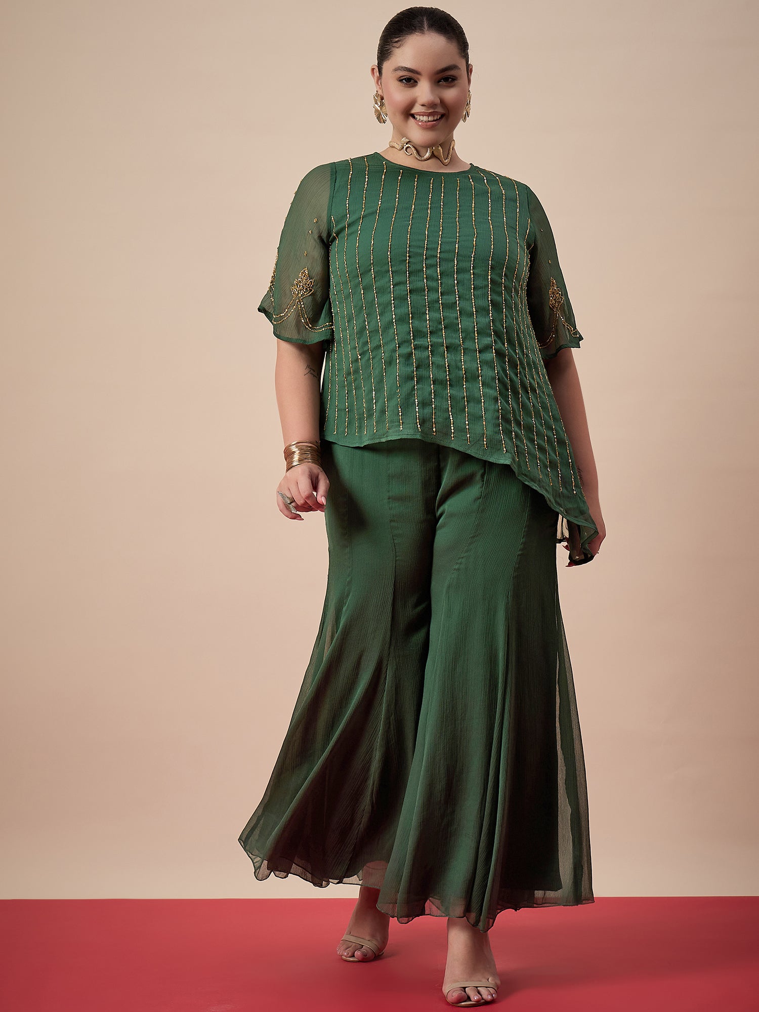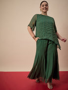Green solid Palazzos, has an elasticated waistband with slip-on closure
