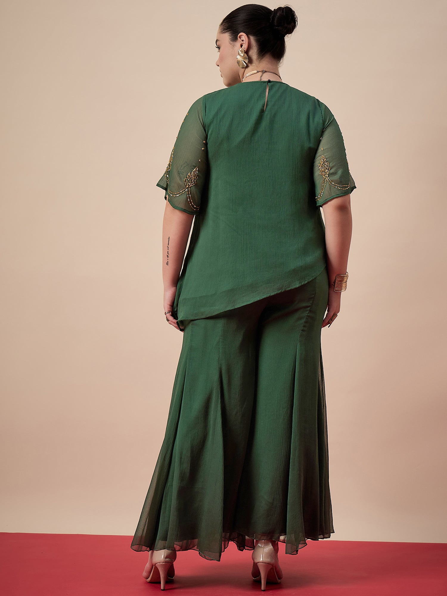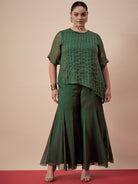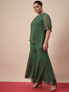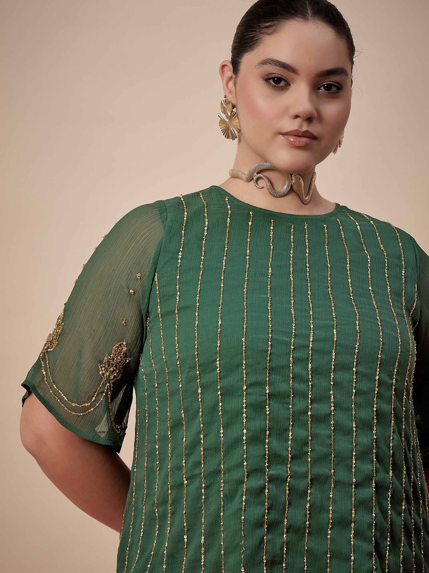 Green embellished top , has a round neck and short sleeves