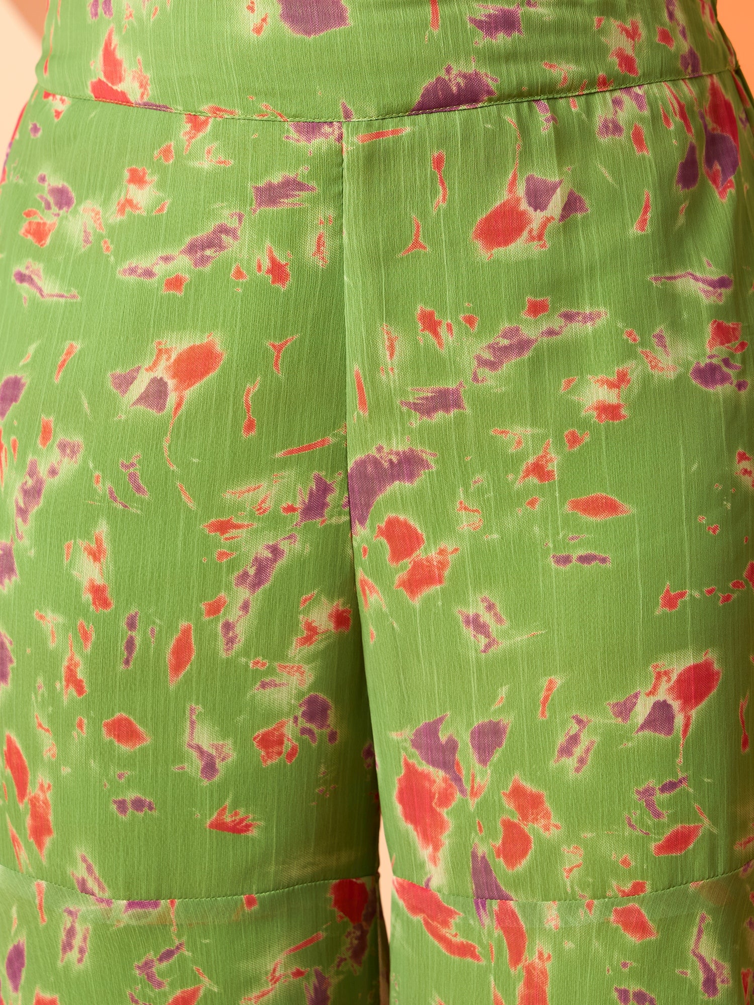 Green printed trousers, has an elasticated waistband with slip-on closure
