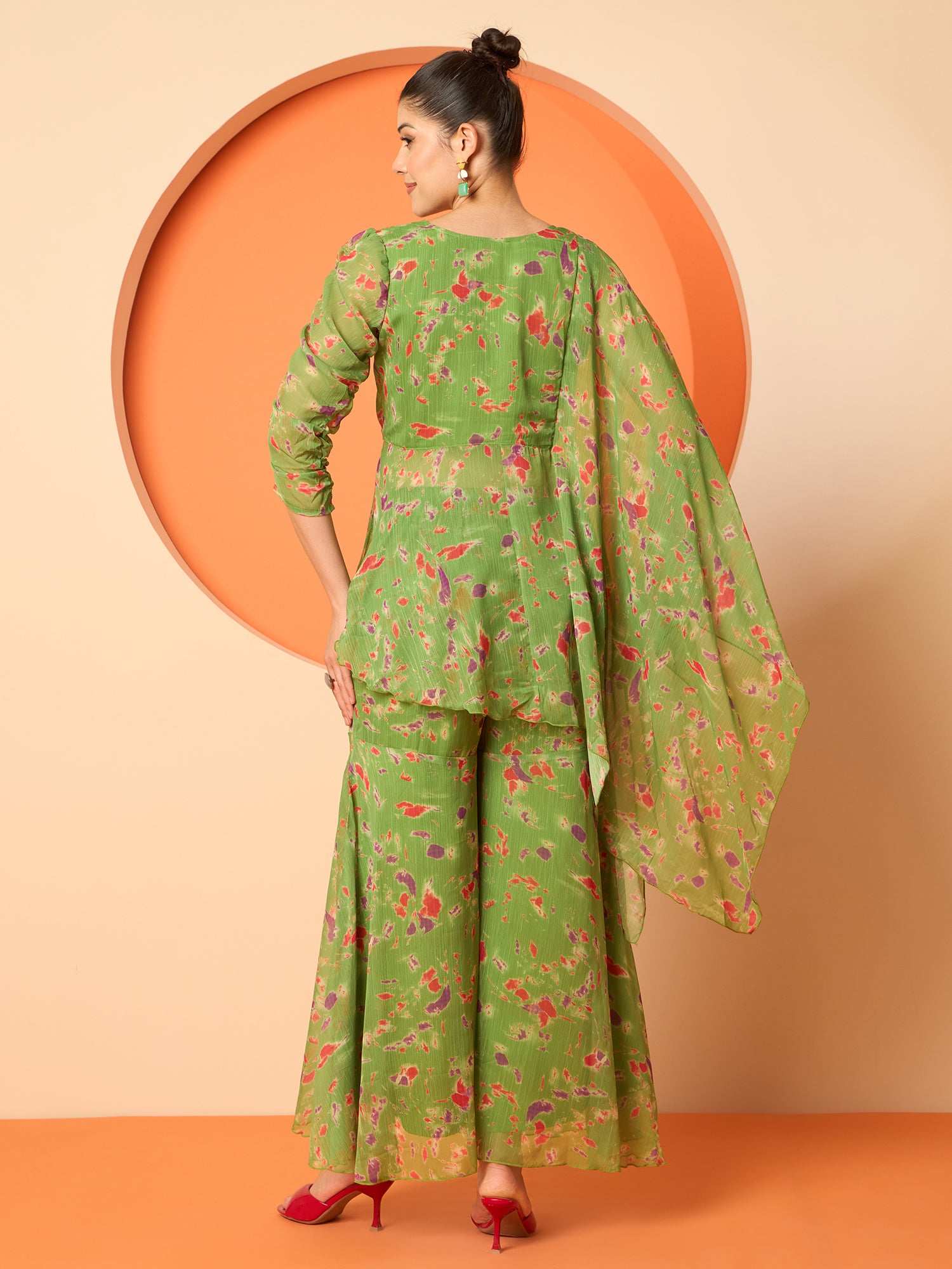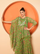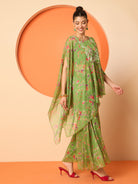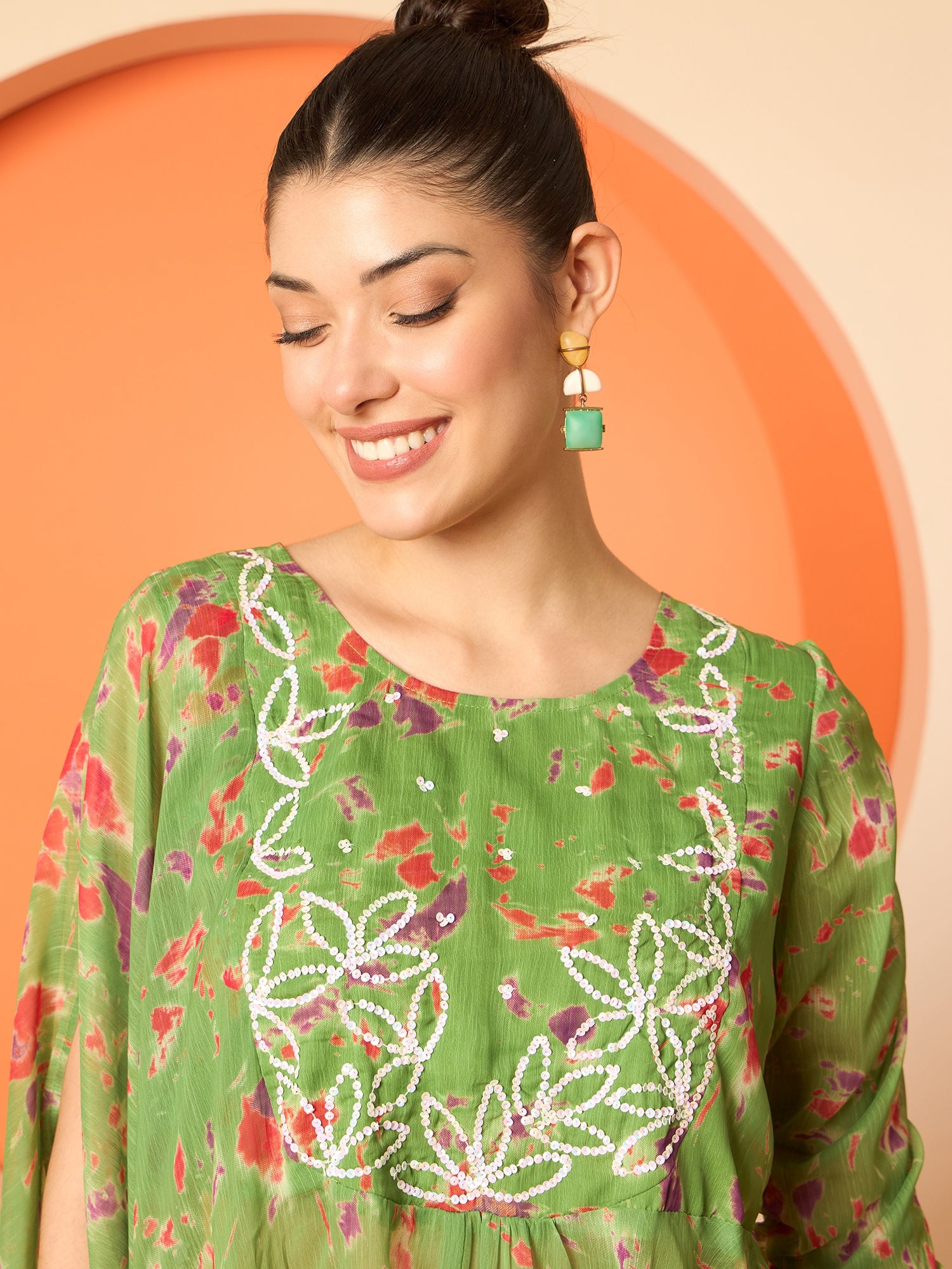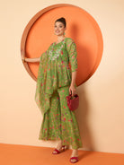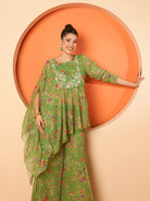 Green printed tunic, has a round neck and three fourth sleeves, secured with slip on closure