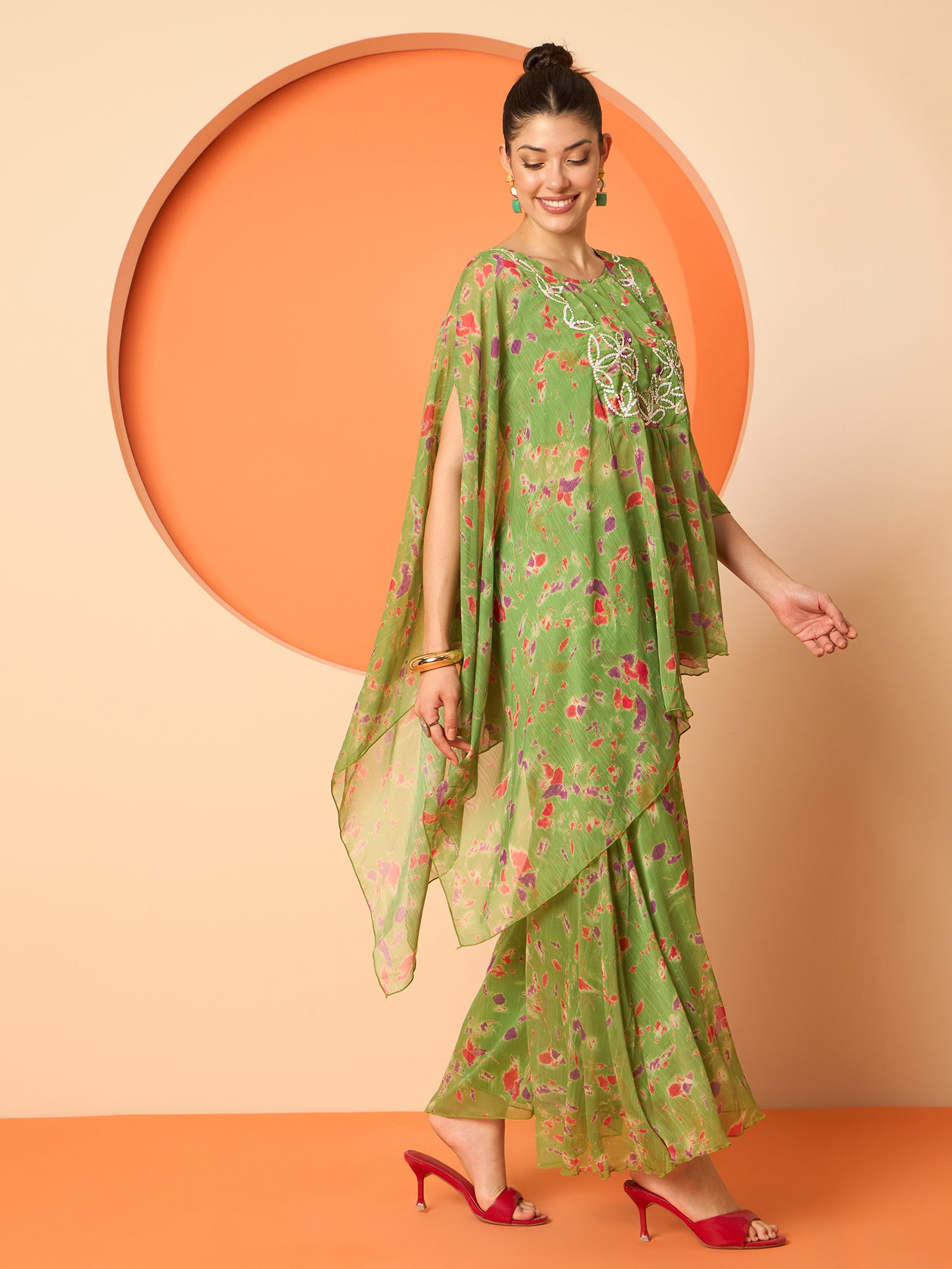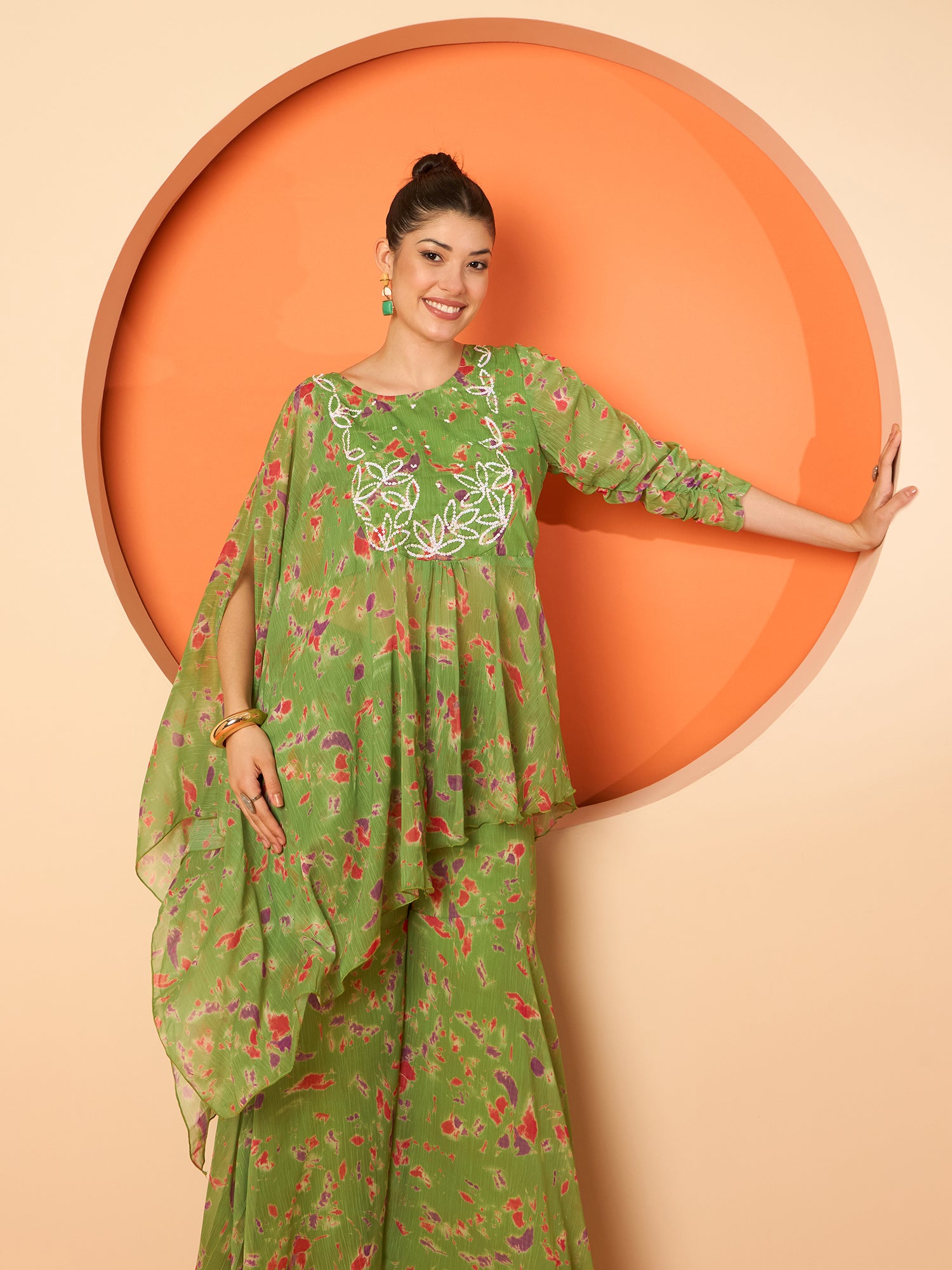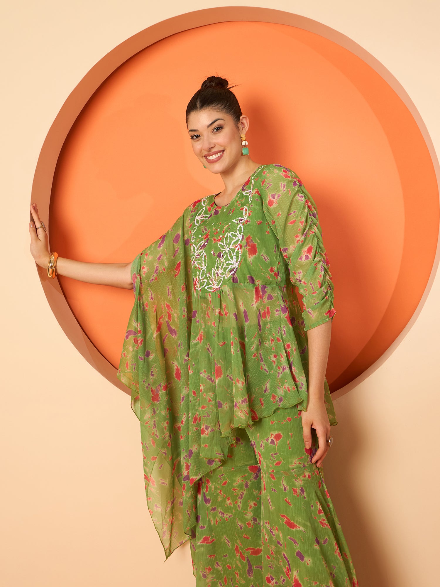 Antheaa Embellished and Printed Round Neck Three Fourth Sleeve Tunic With Trouser Co-Ords