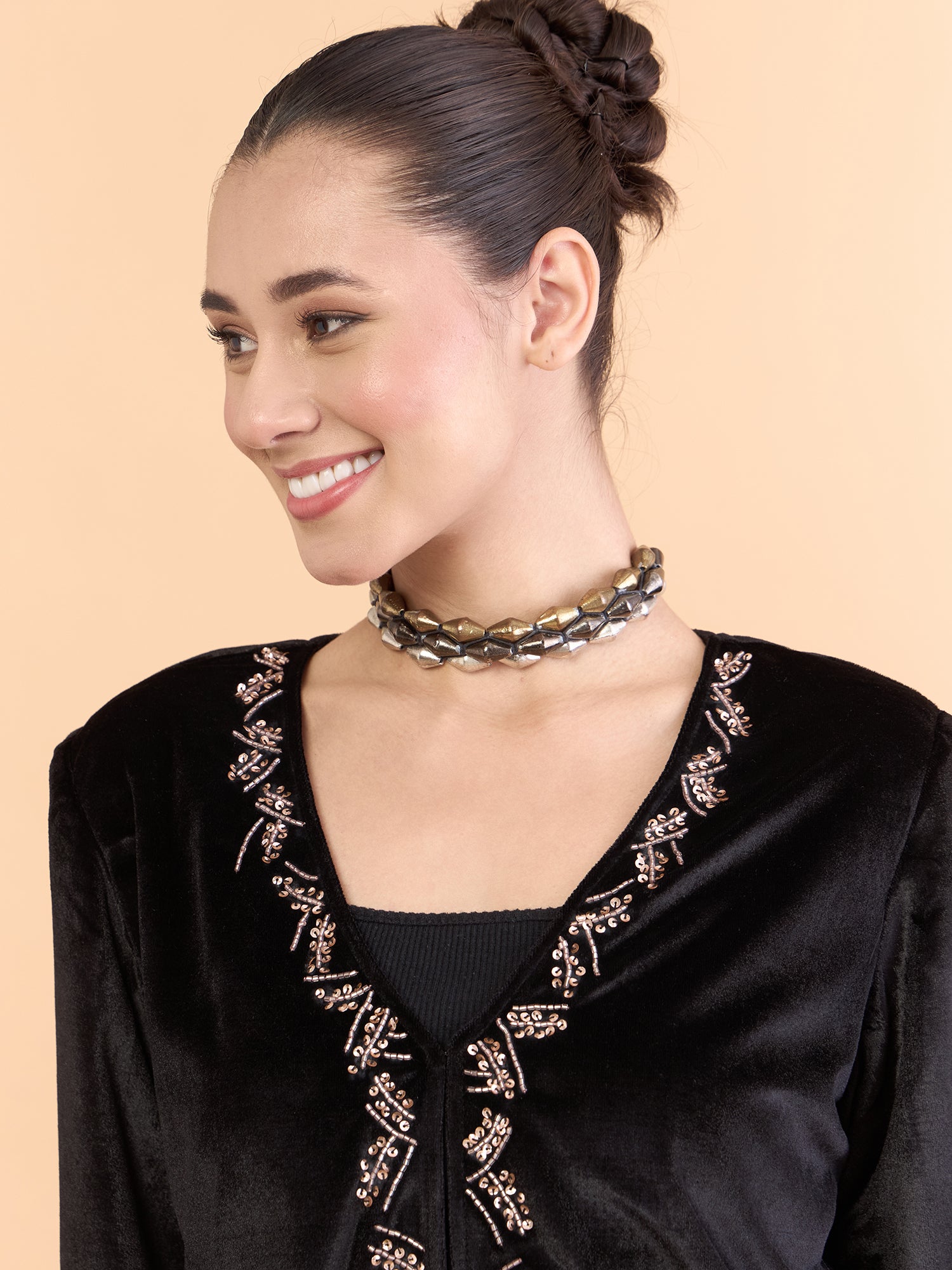 Black and brown embellished jacket, has a v neck and long sleeves, secured with sip on closure
