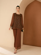 Brown Embroidered top, has a round neck and long sleeves