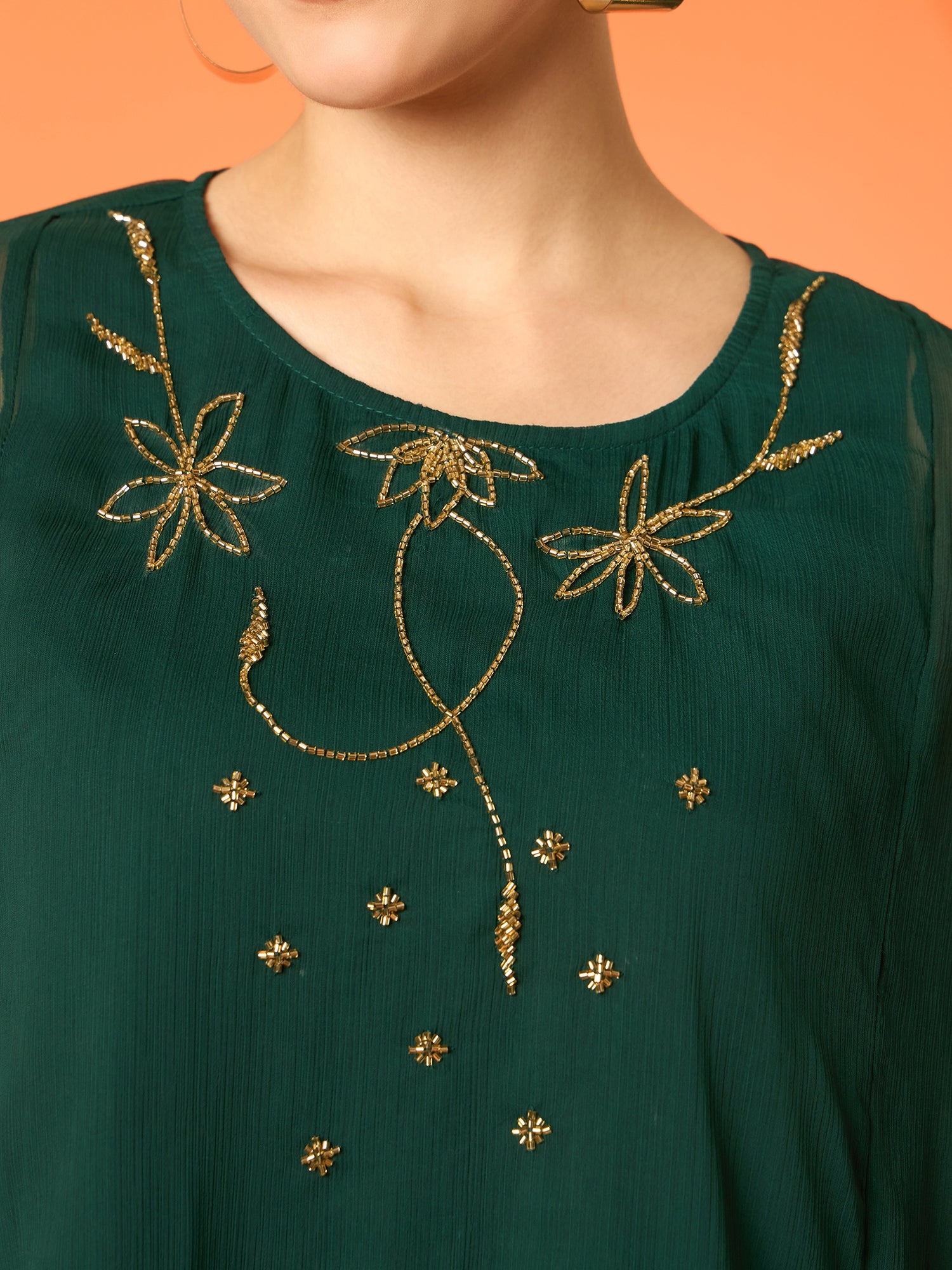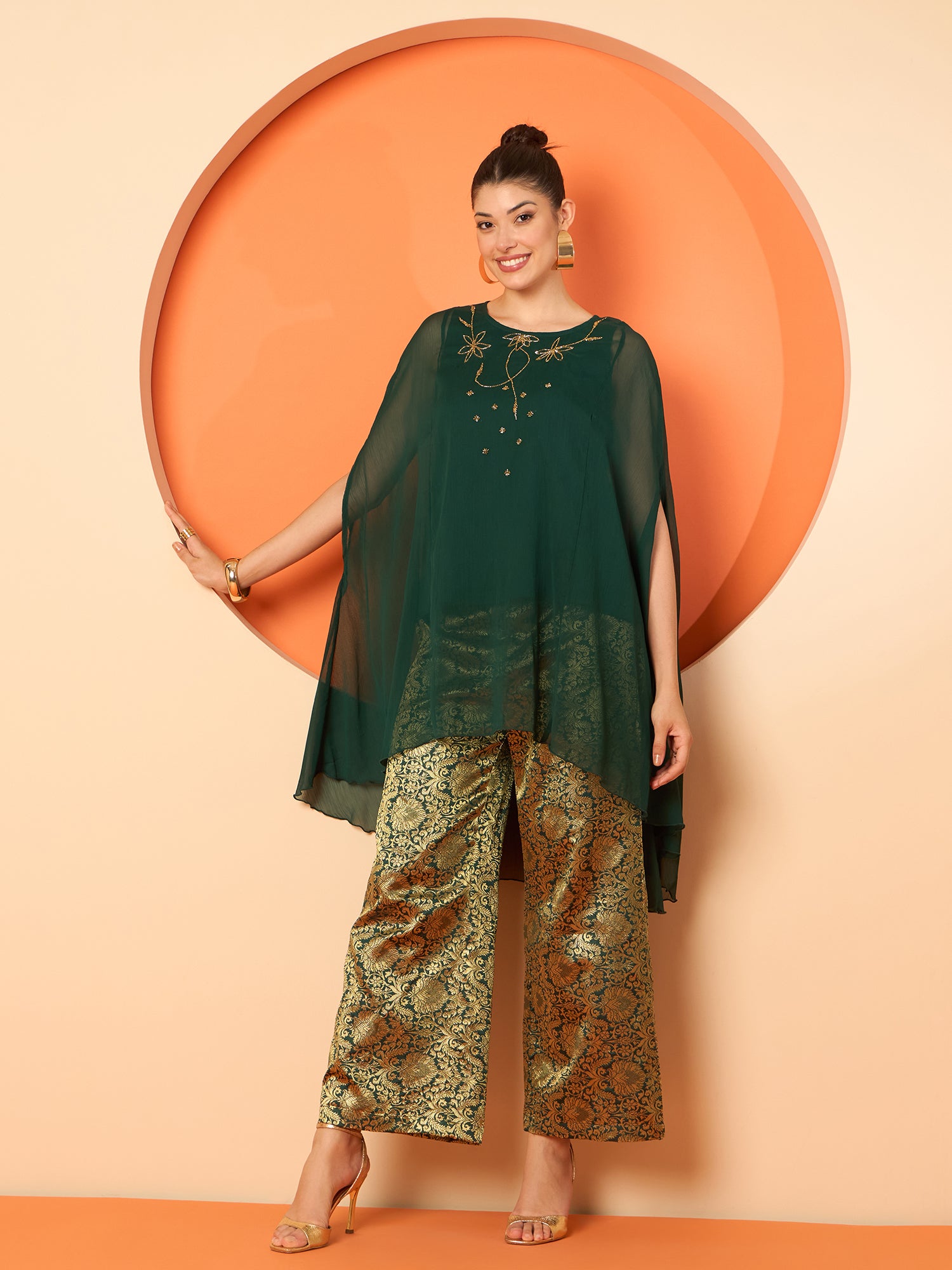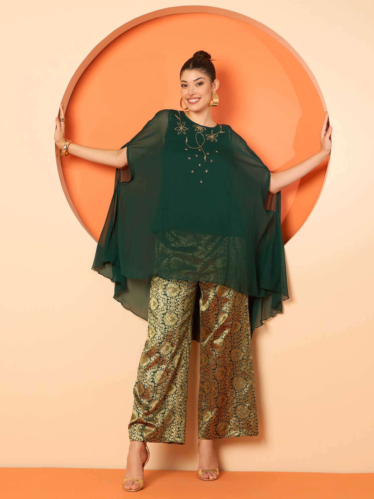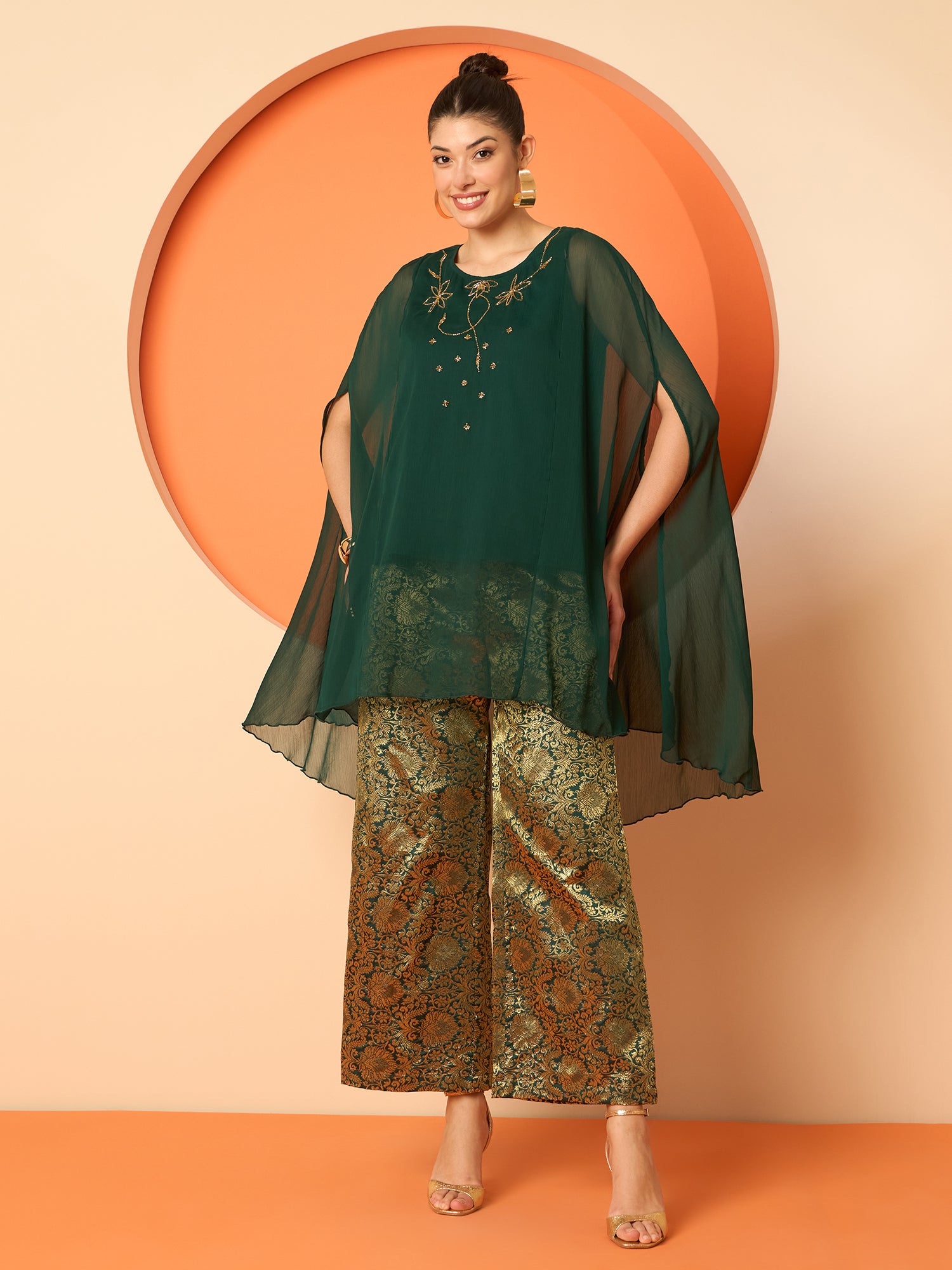 Green embellished regular-fit cape top, has round neck, three quarter sleeves, flared hem and slip-on closure