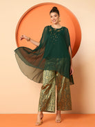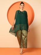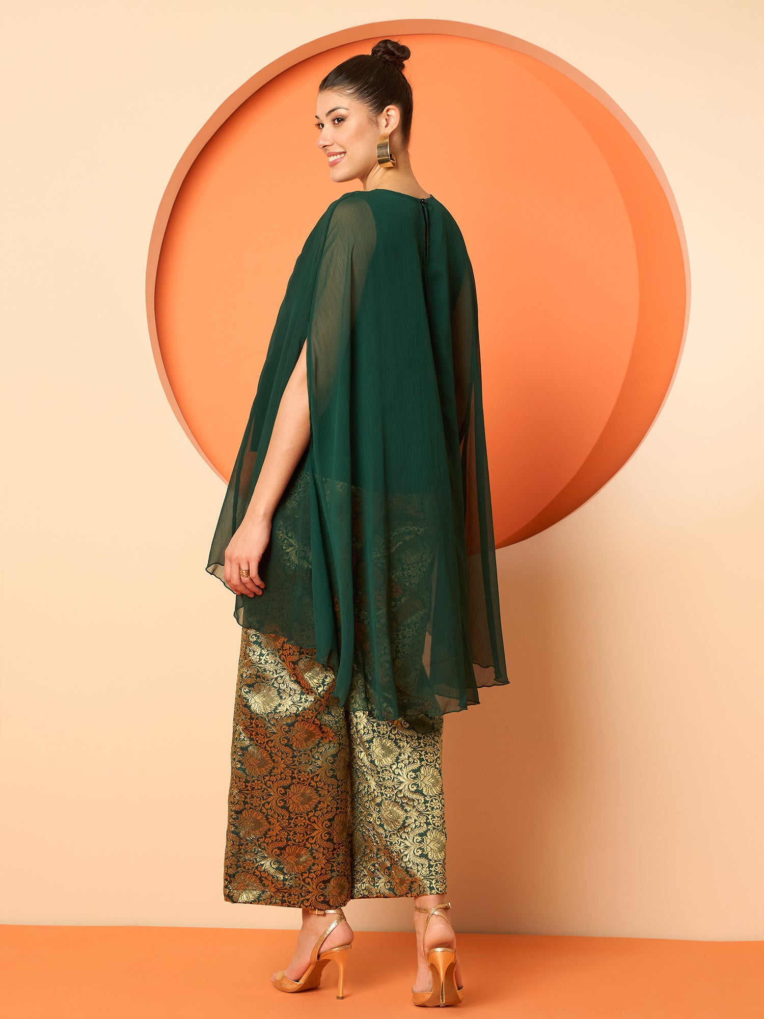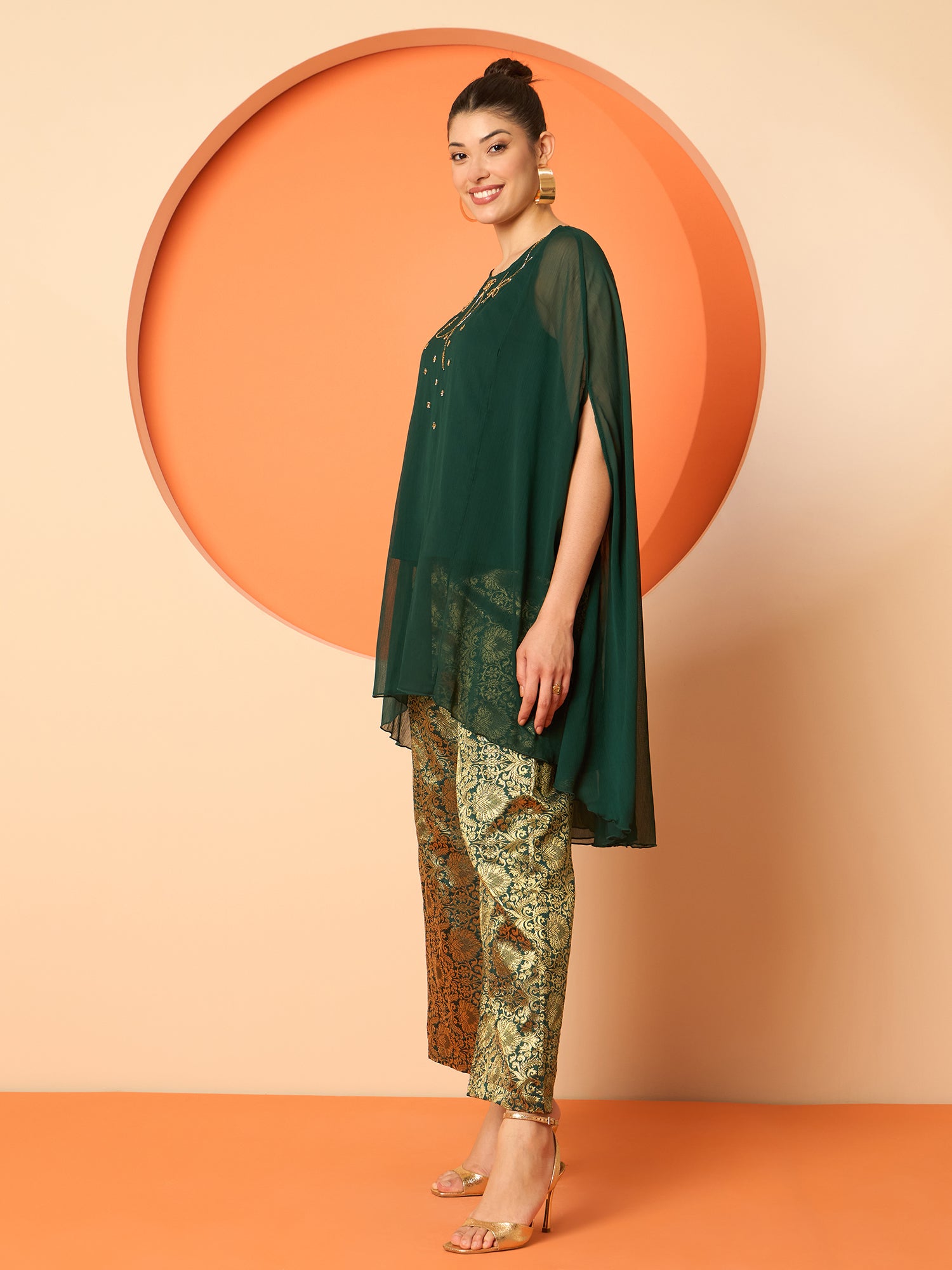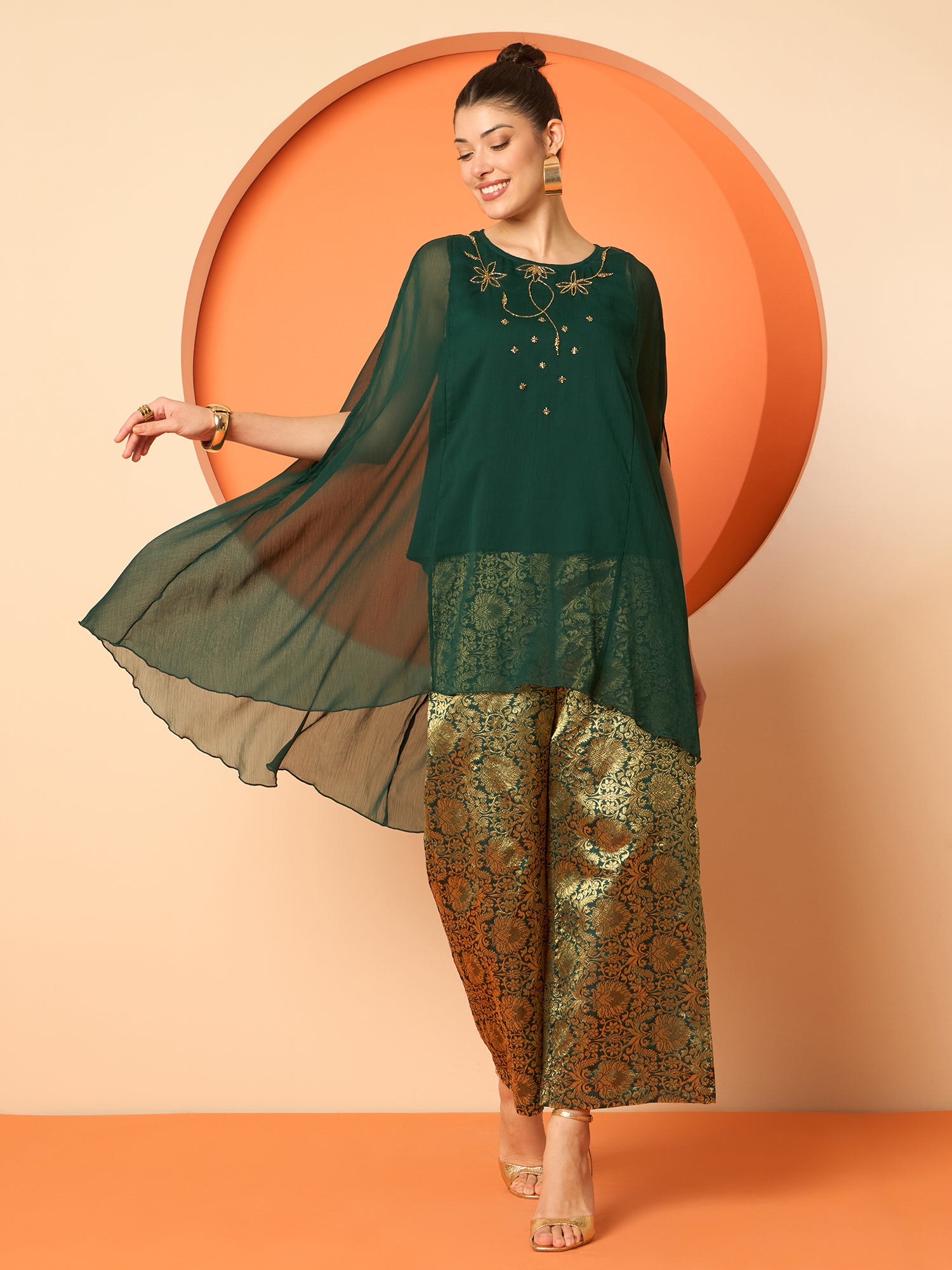 Green embellished regular-fit cape top, has round neck, three quarter sleeves, flared hem and slip-on closure