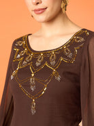 Brown & gold toned embellished top, has a round-neck and short sleeves, secured with slip-on closure