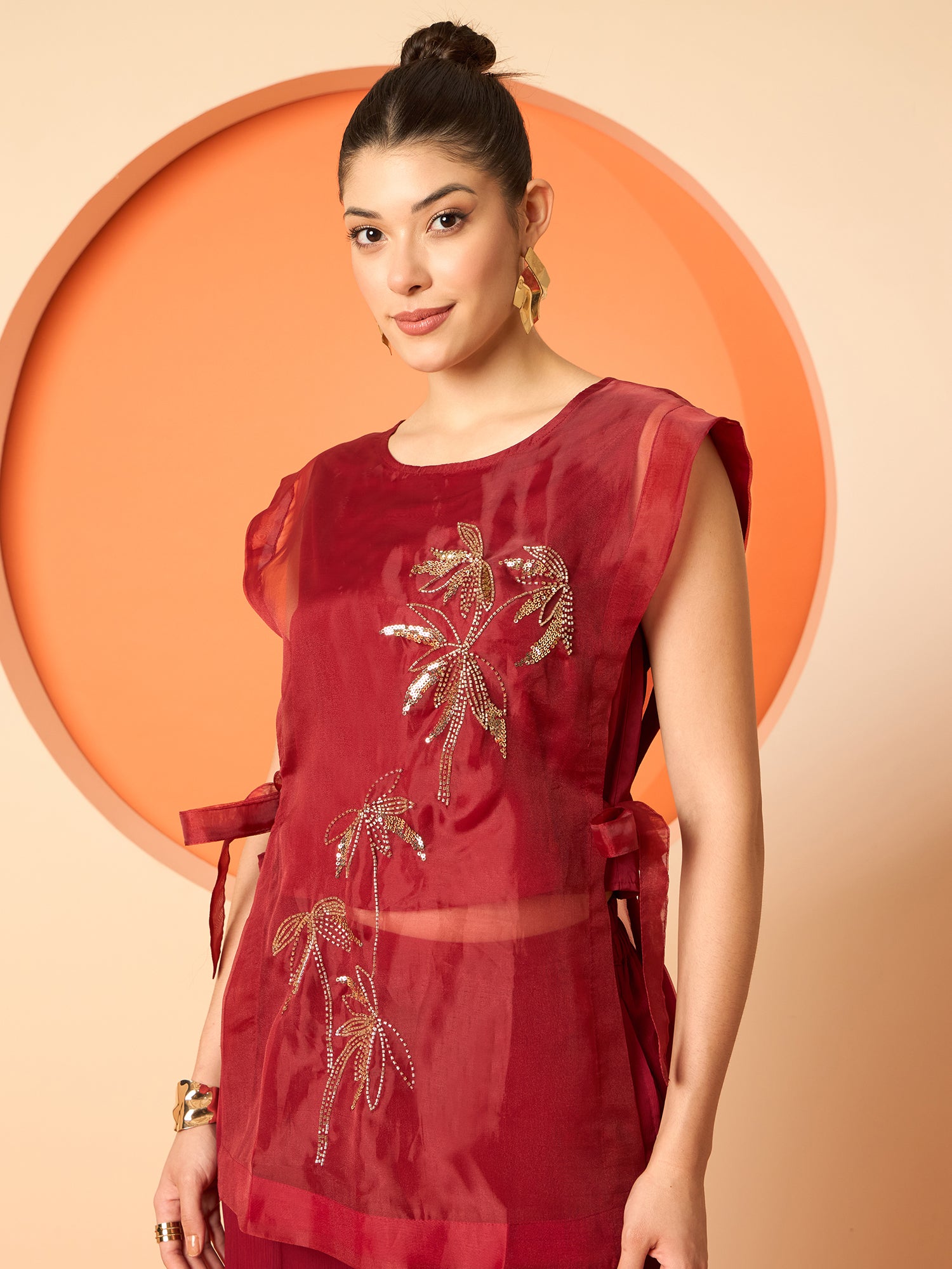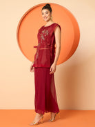 Maroon and gold-toned embellished tunic ,has a round neck and sleeveless, secured with button closure