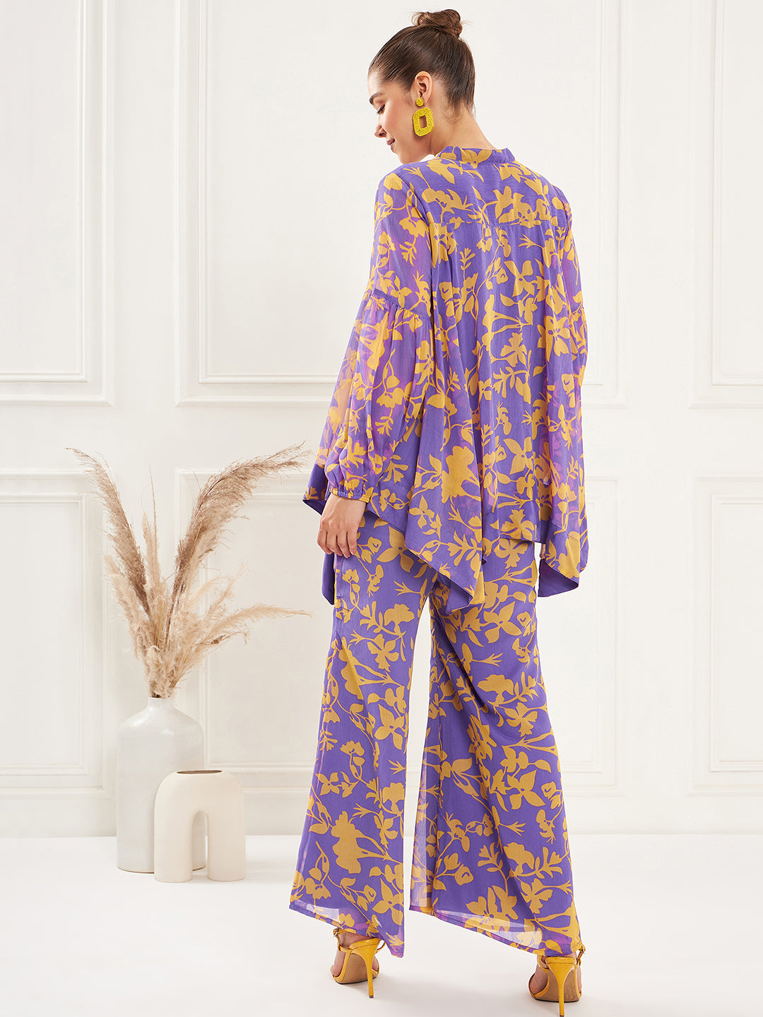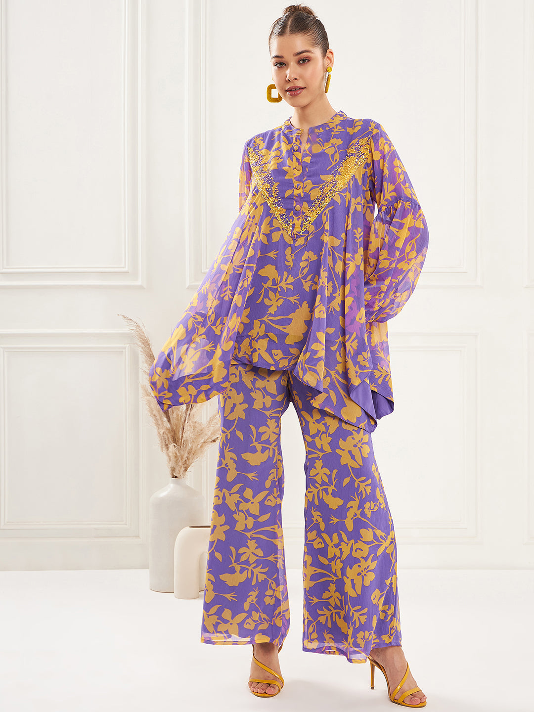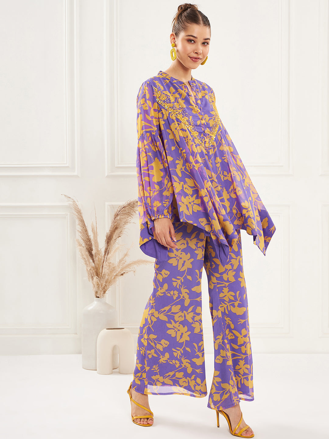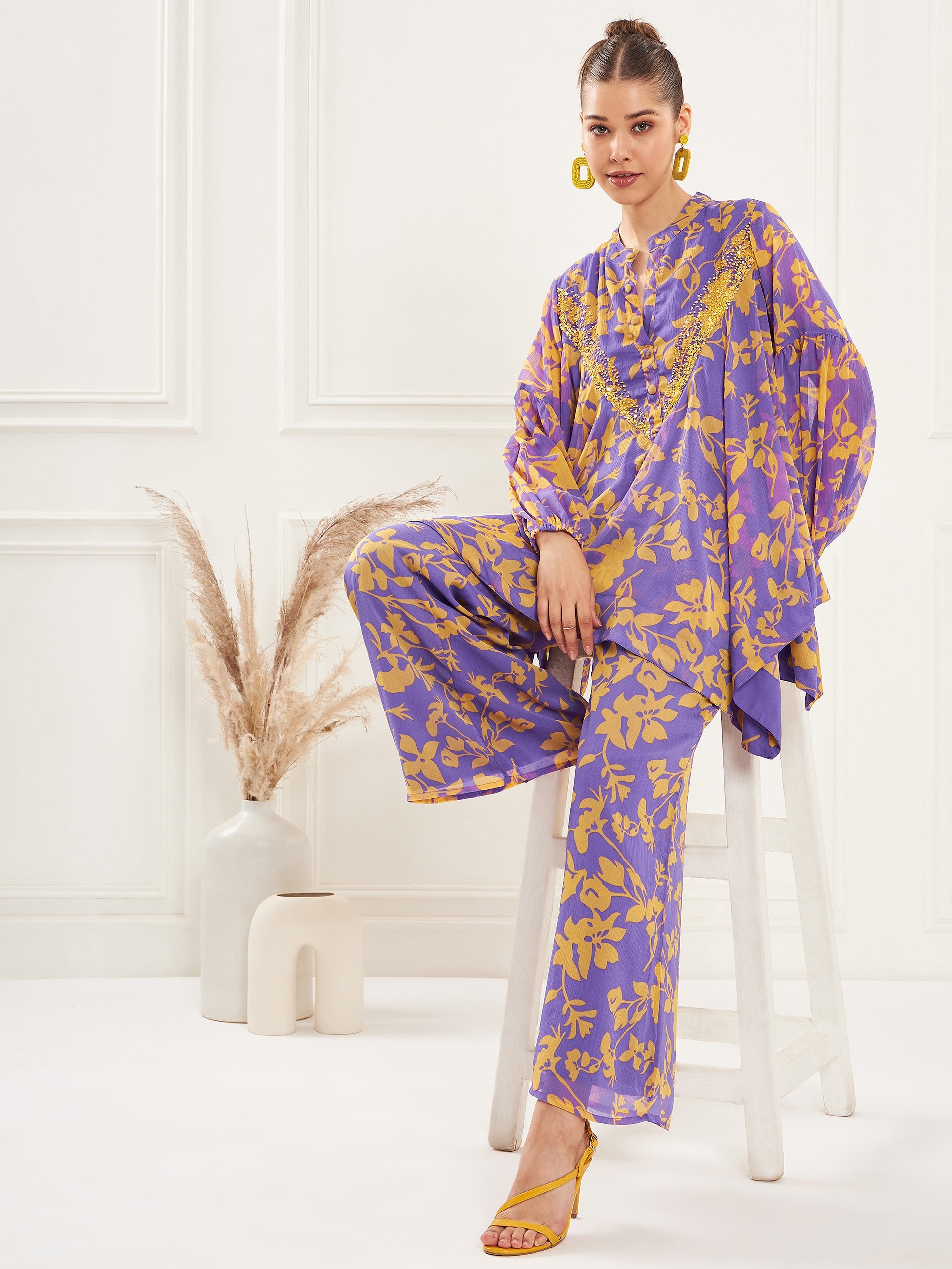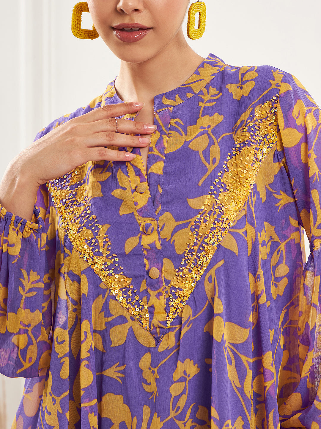 Purple and mustard embellished and printed tunic, has a mandarin collar, button closure, Long bishop sleeves and asymmetrical hem