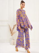 Purple and mustard printed palazzo has a partially elasticated waistband with a slip-on closure