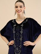 Blue embellished Tunic , has round neck, short kimono sleeves, asymmetric hem