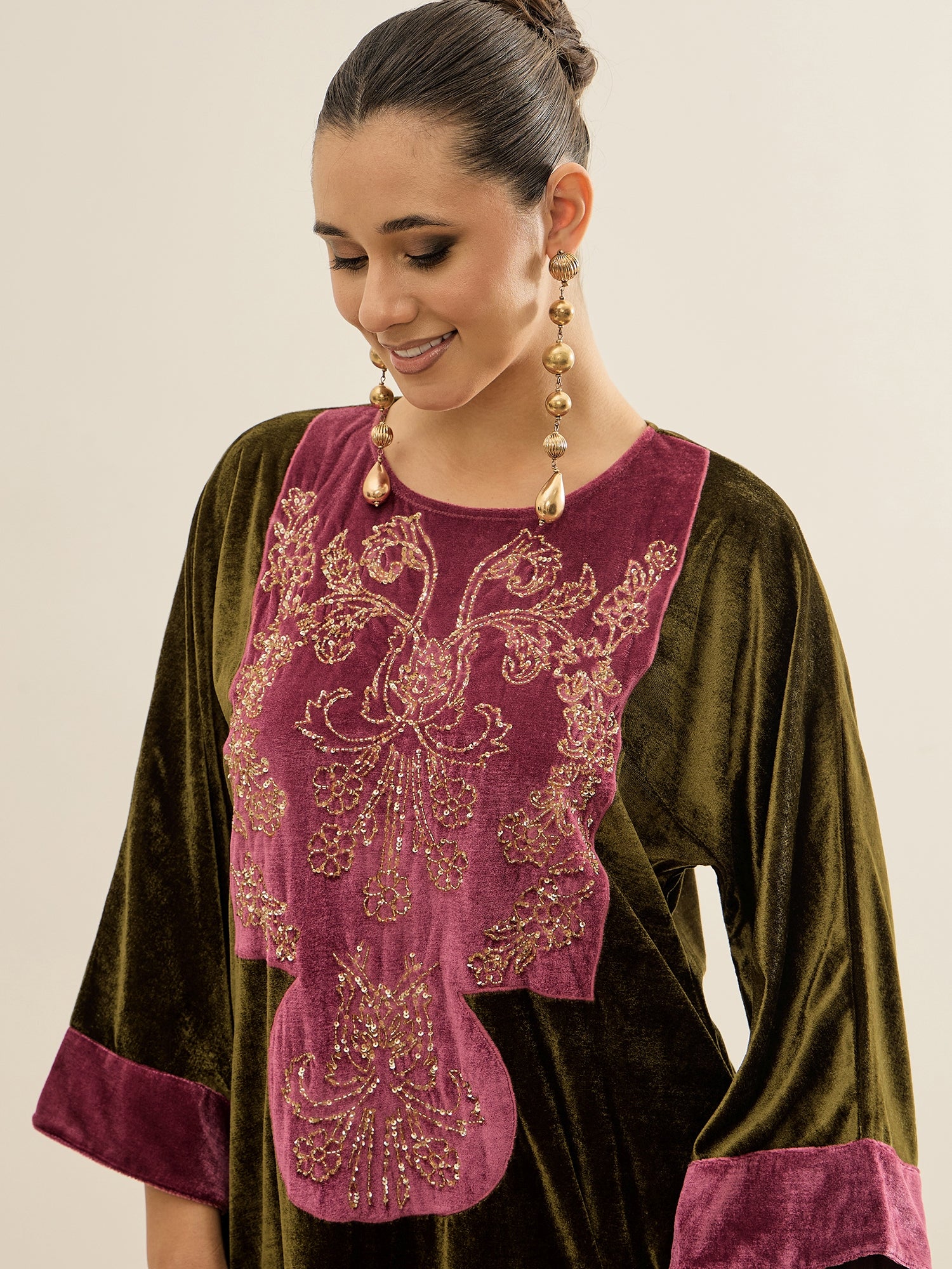 Olive Embellished tunic has a mandarin collar and three quarters sleeves, secured with button-on closure