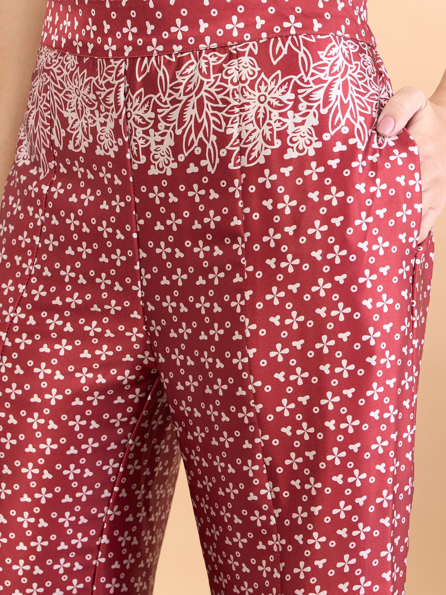 Maroon and white floral printed palazzos, has an elasticated waistband with slip-on closure and has 1 pocket