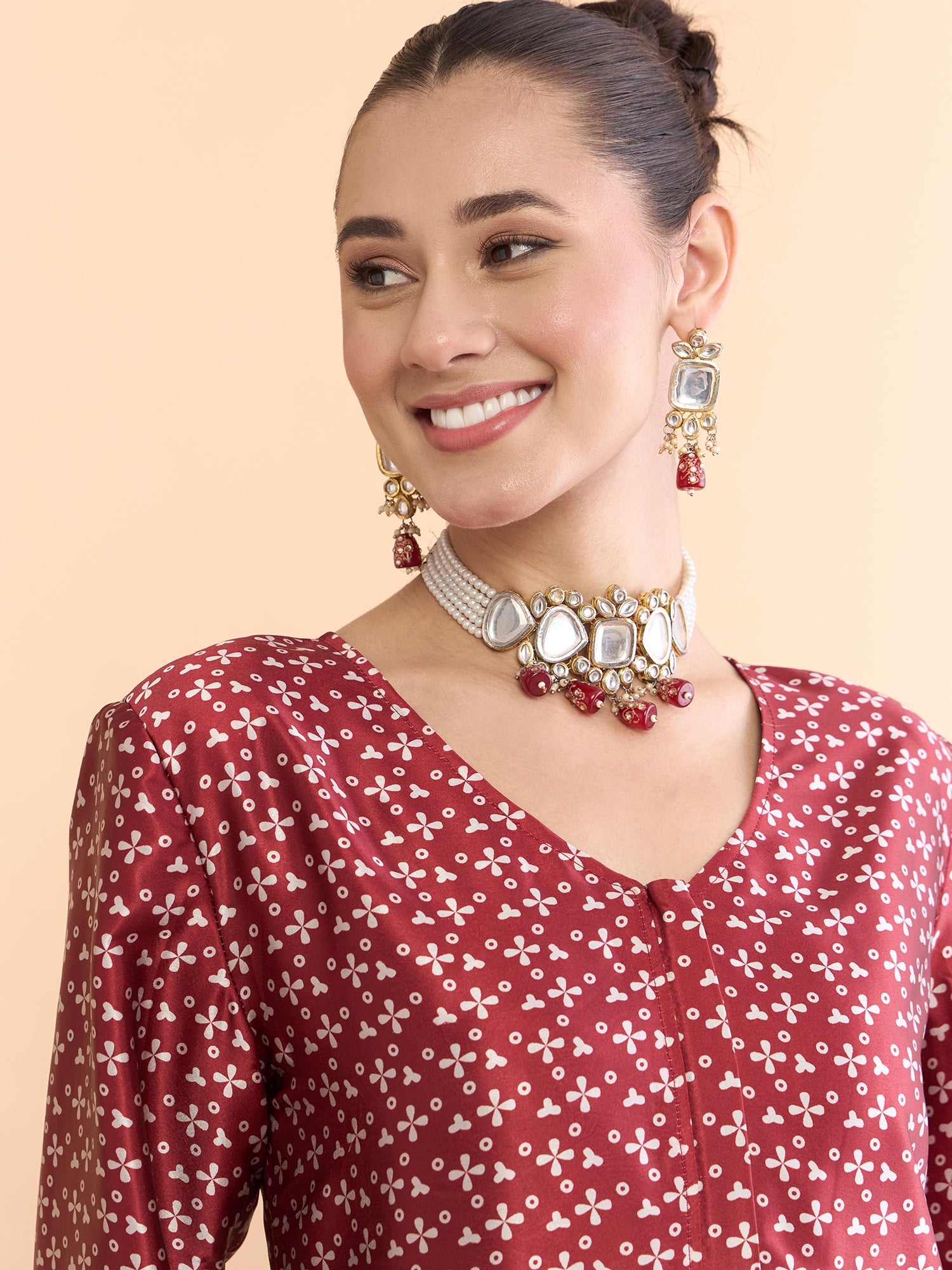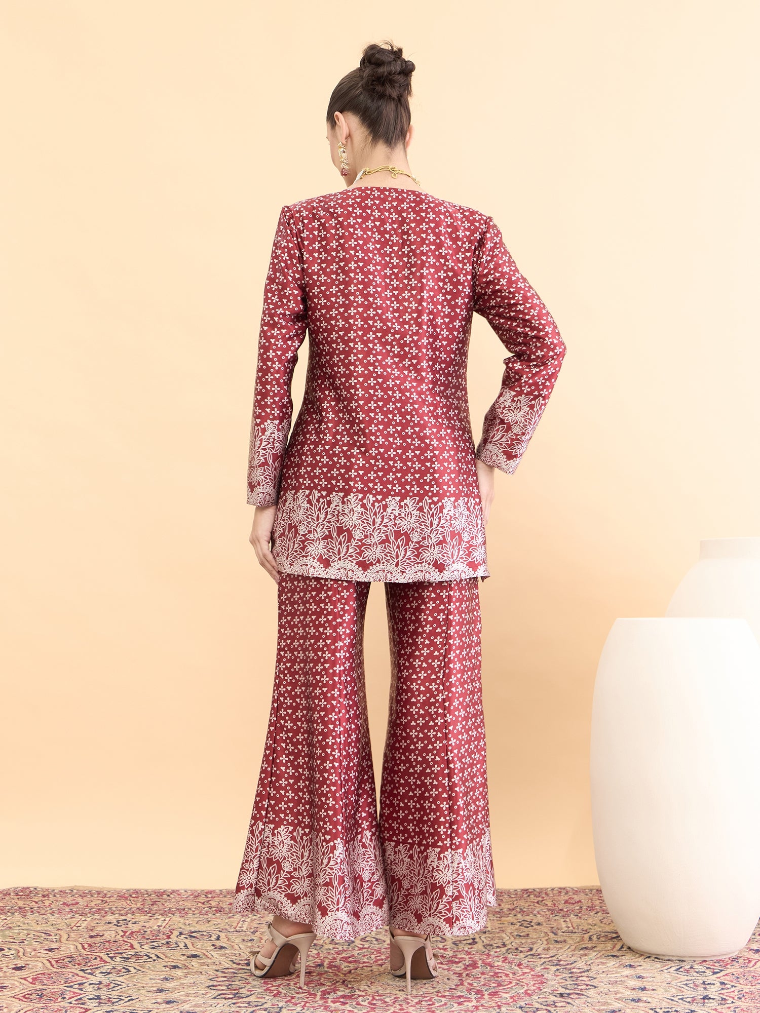Maroon and White floral printed tunic , has a V-neck and long sleeves, secured with snap button closure