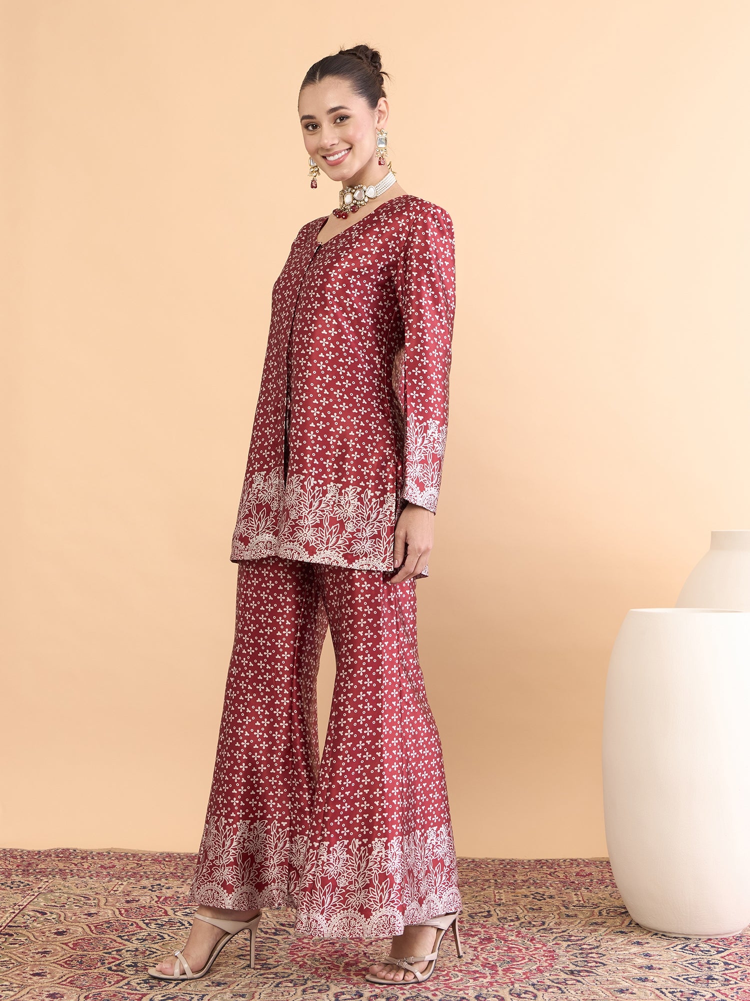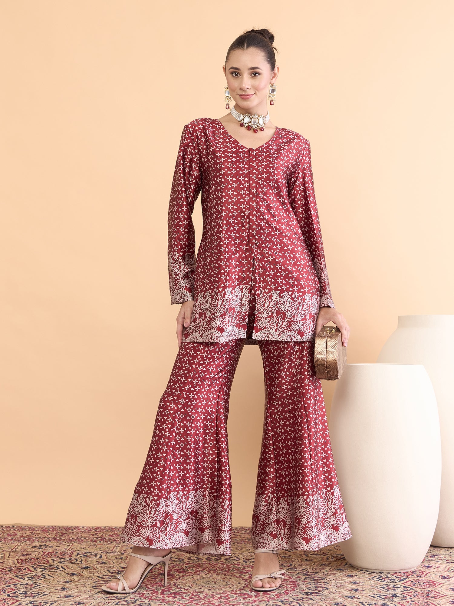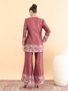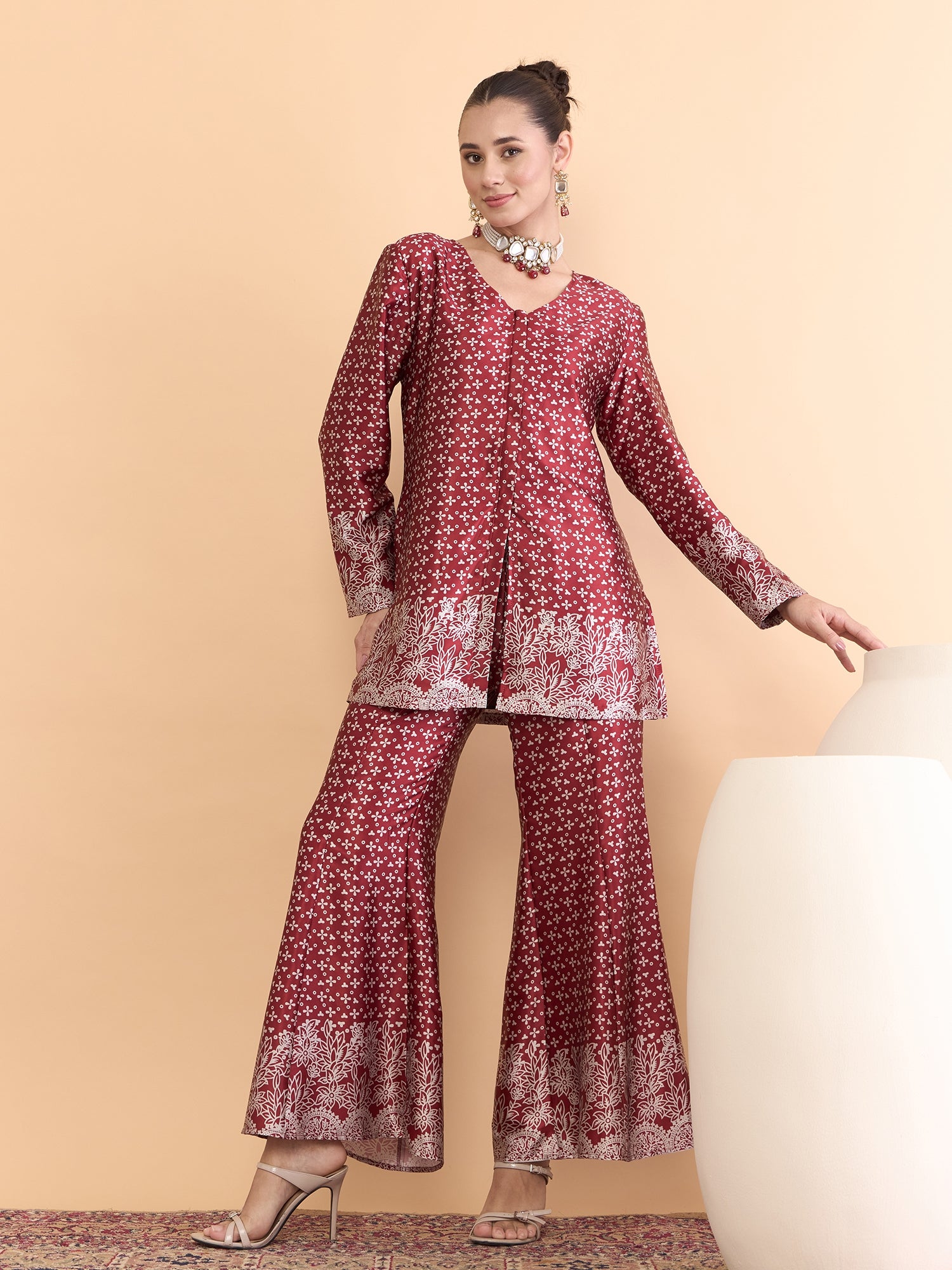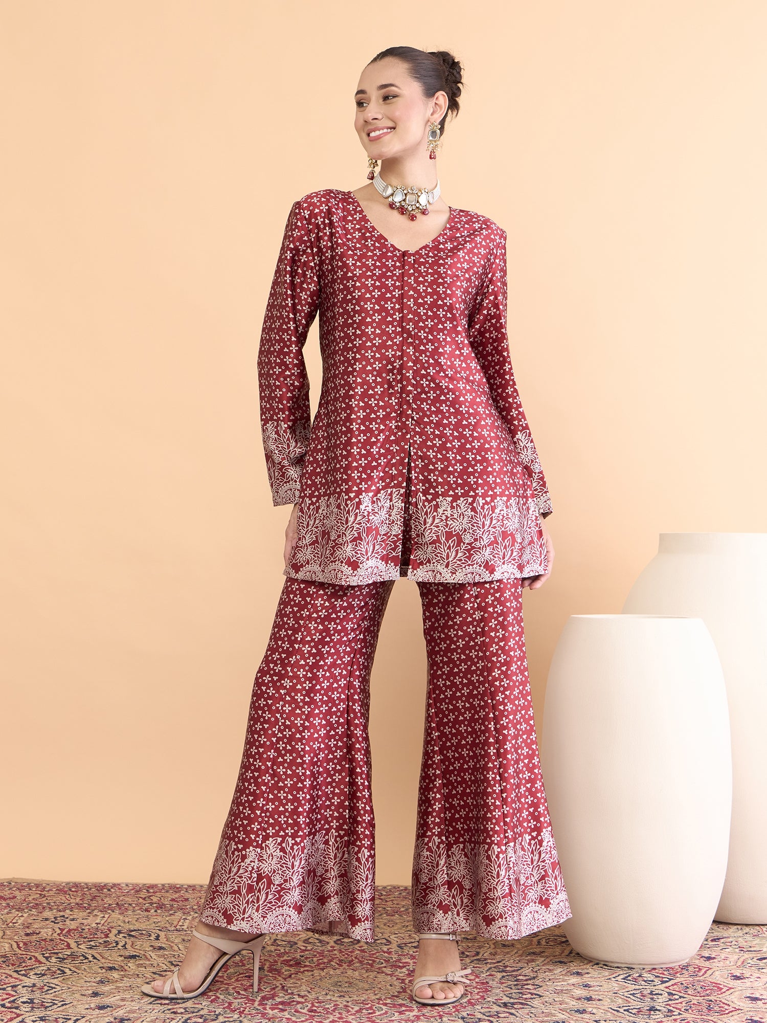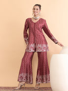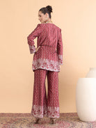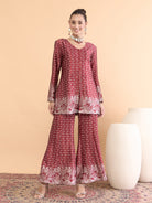 Antheaa Floral Printed V-Neck Satin Tunic With Palazzos