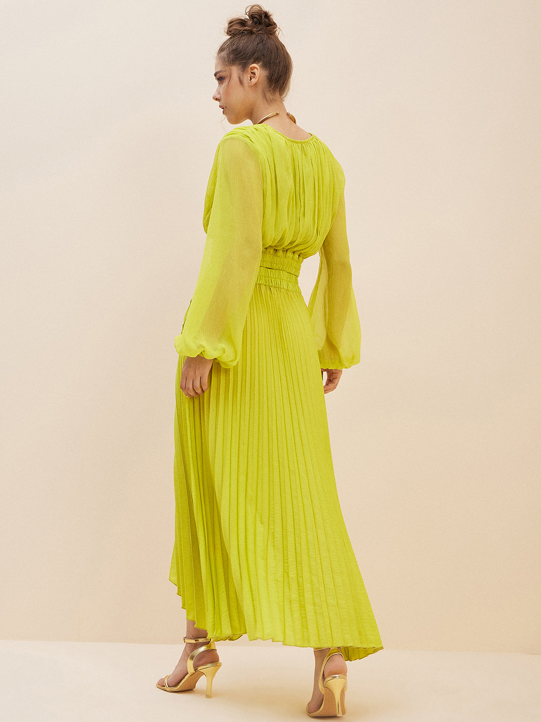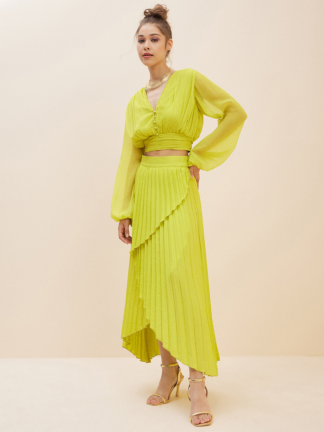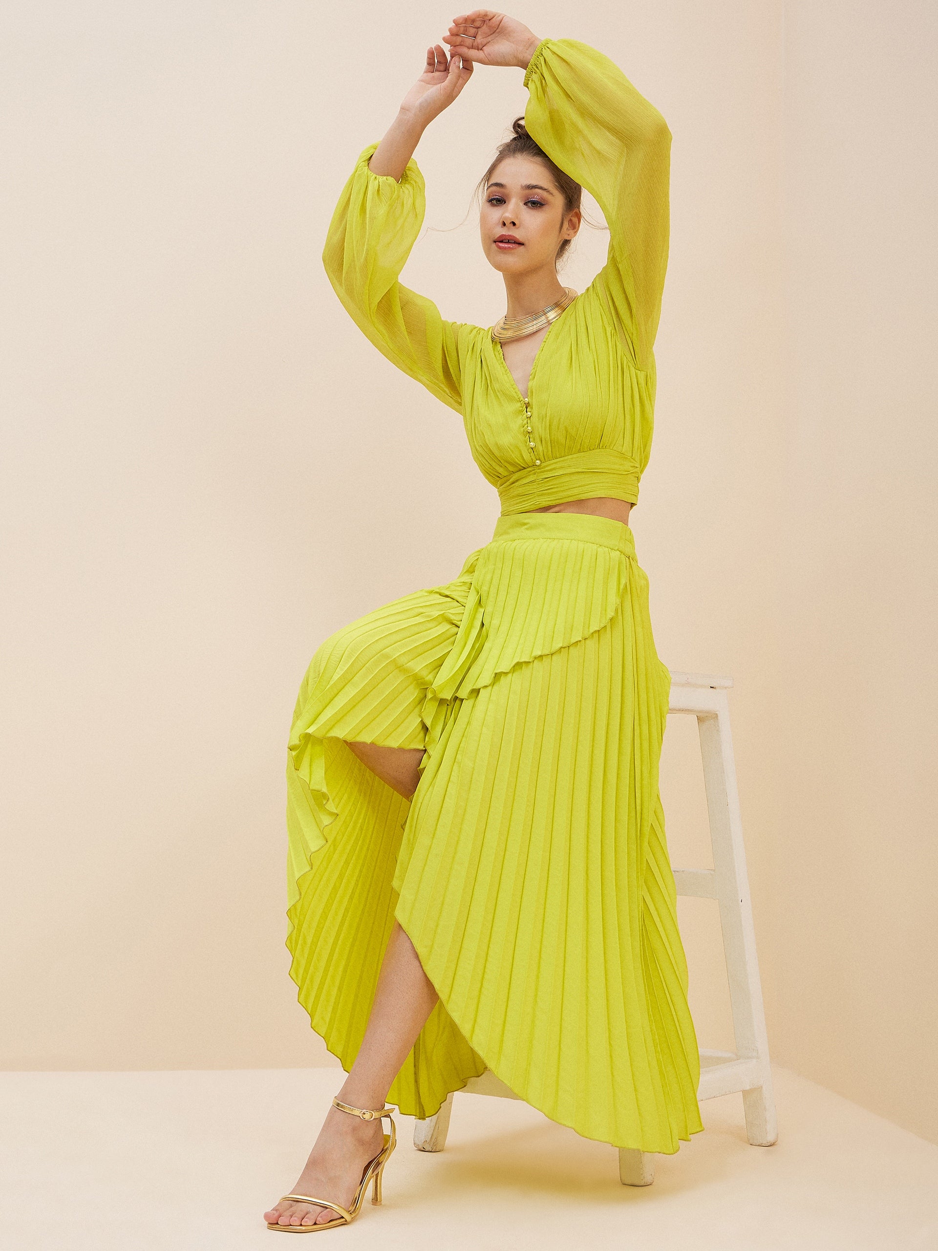 Antheaa Lime Green Crop Top With Accordion Pleated Overlap Asymmetric Skirt
