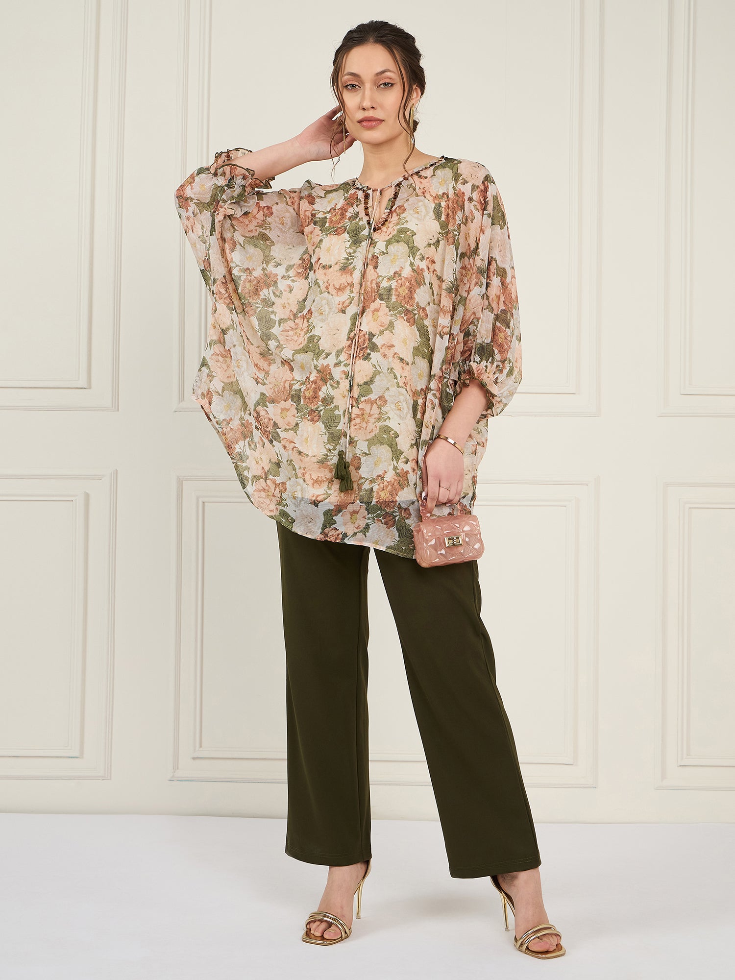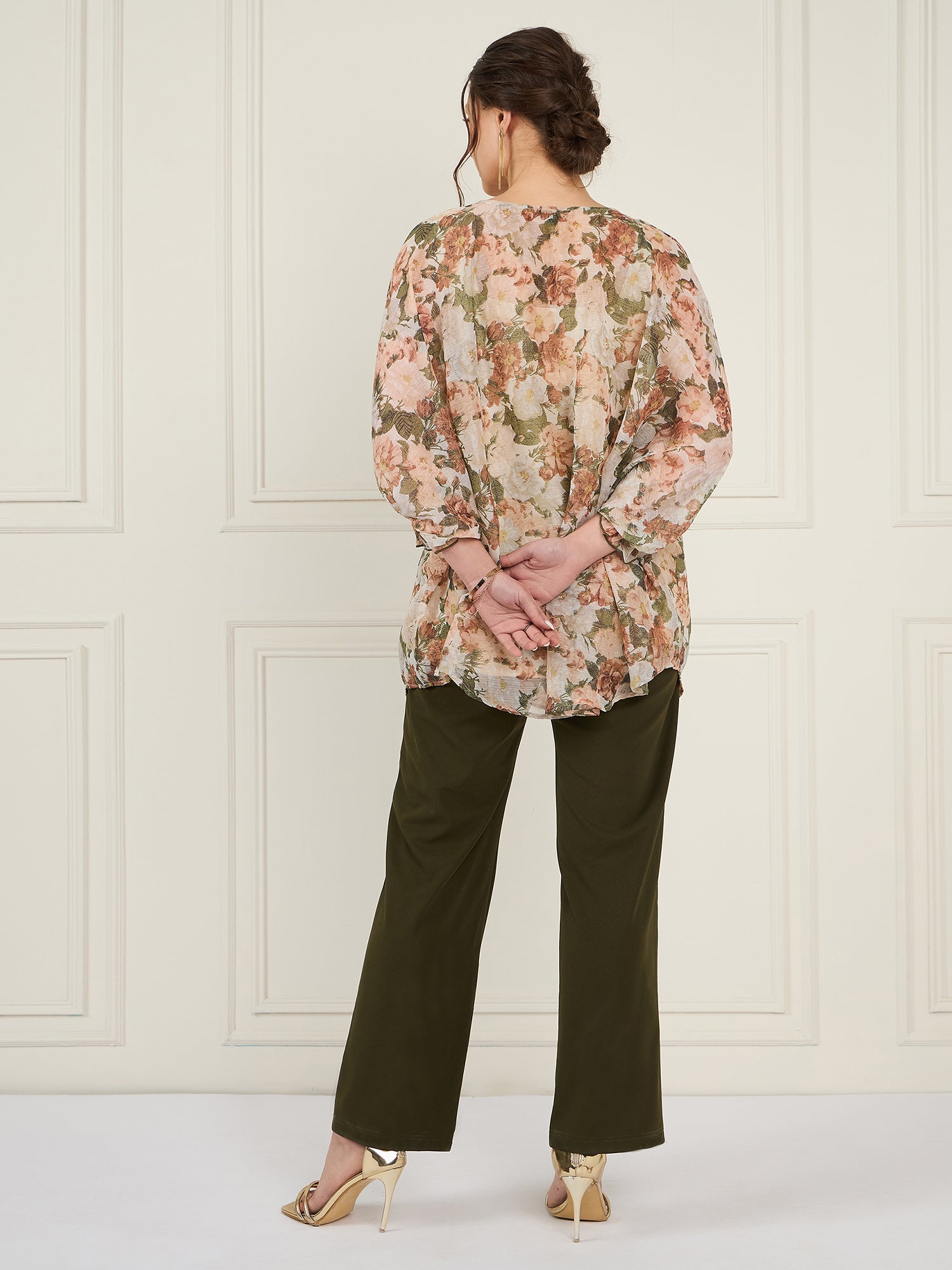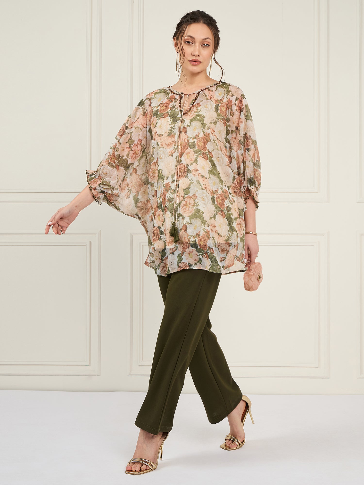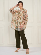 Off white and olive green floral printed top, tie up neck has long puff sleeves, slip-on closure and regular waist hem