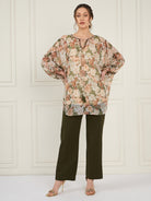 Antheaa Off White Floral Printed Tie Up Puff Sleeves Sequined Tunic With Trouser
