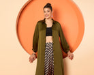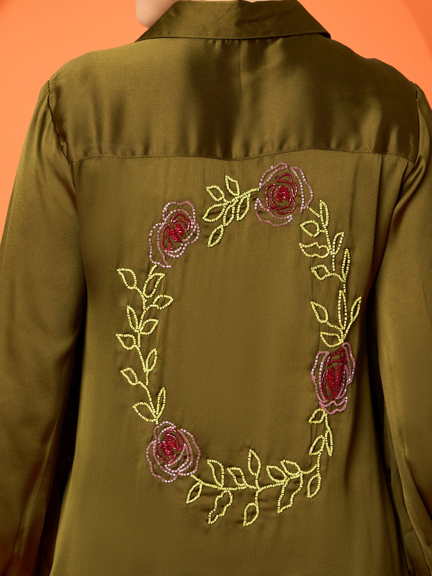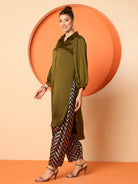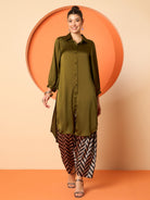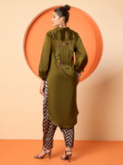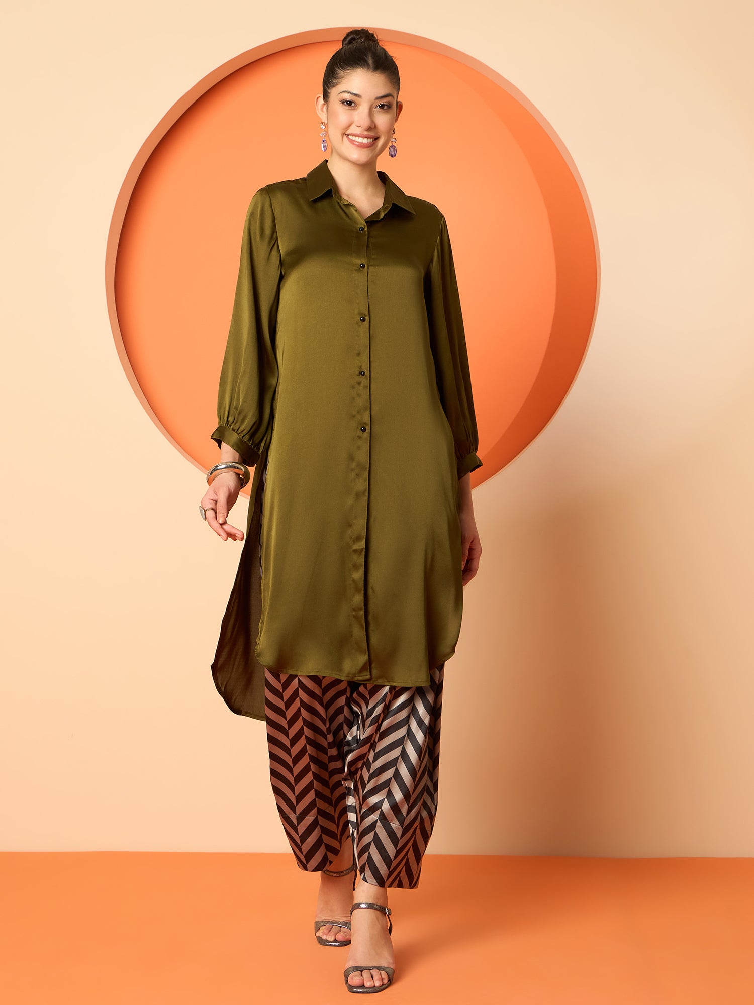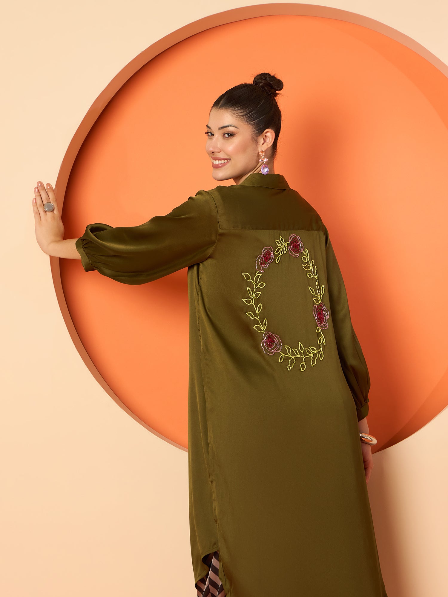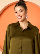 Green solid tunic, has a mandarin collar and long sleeves, secured with slip on closure