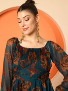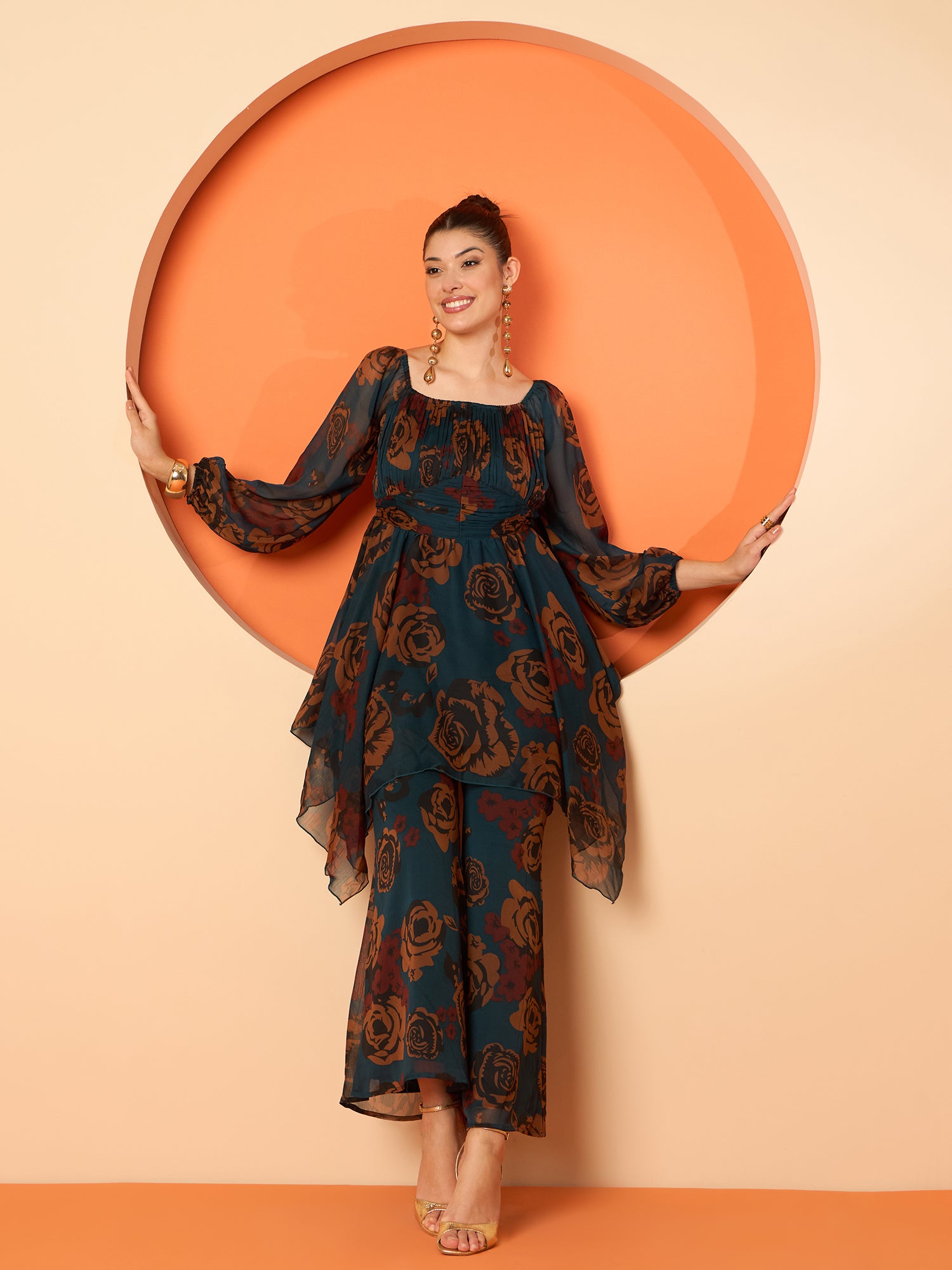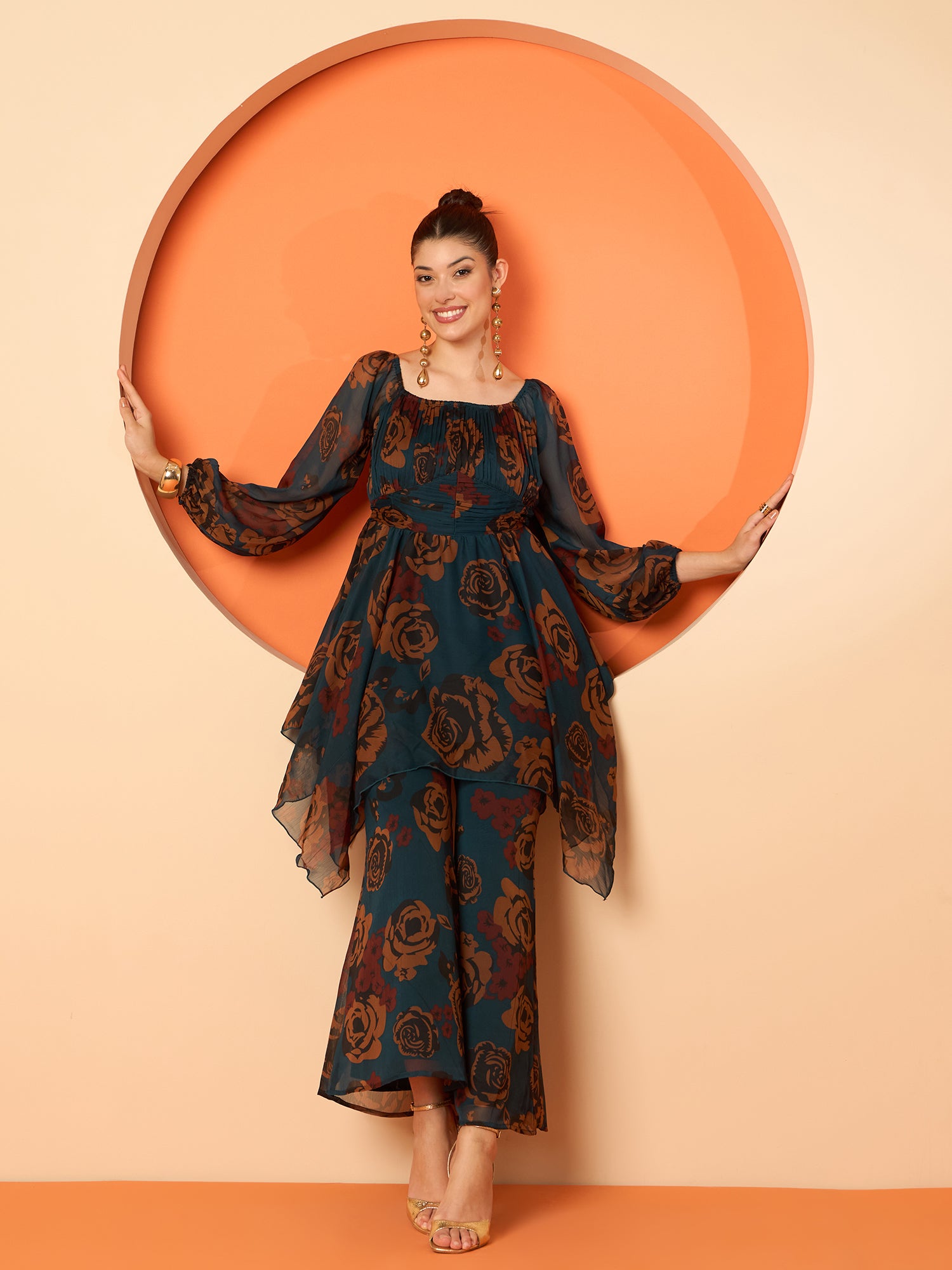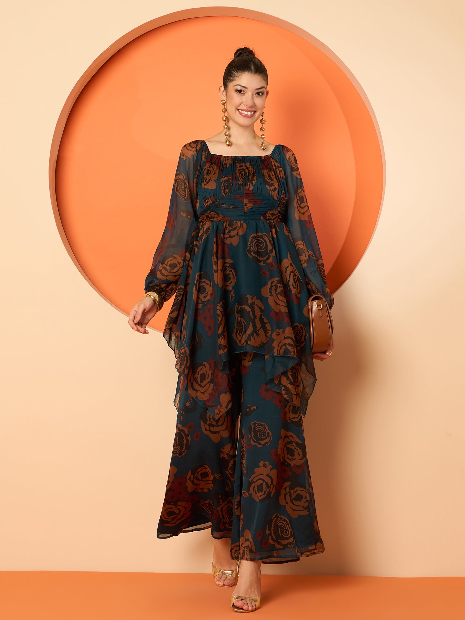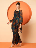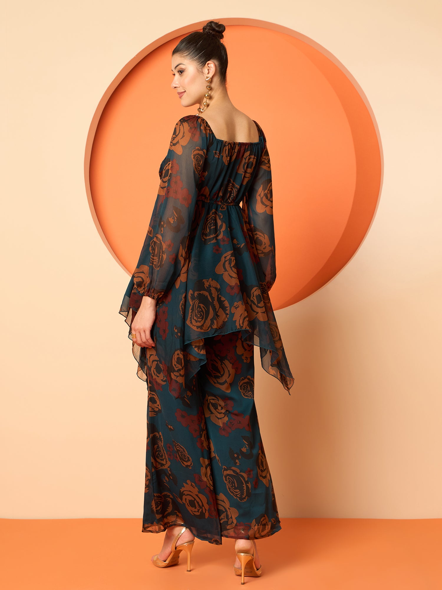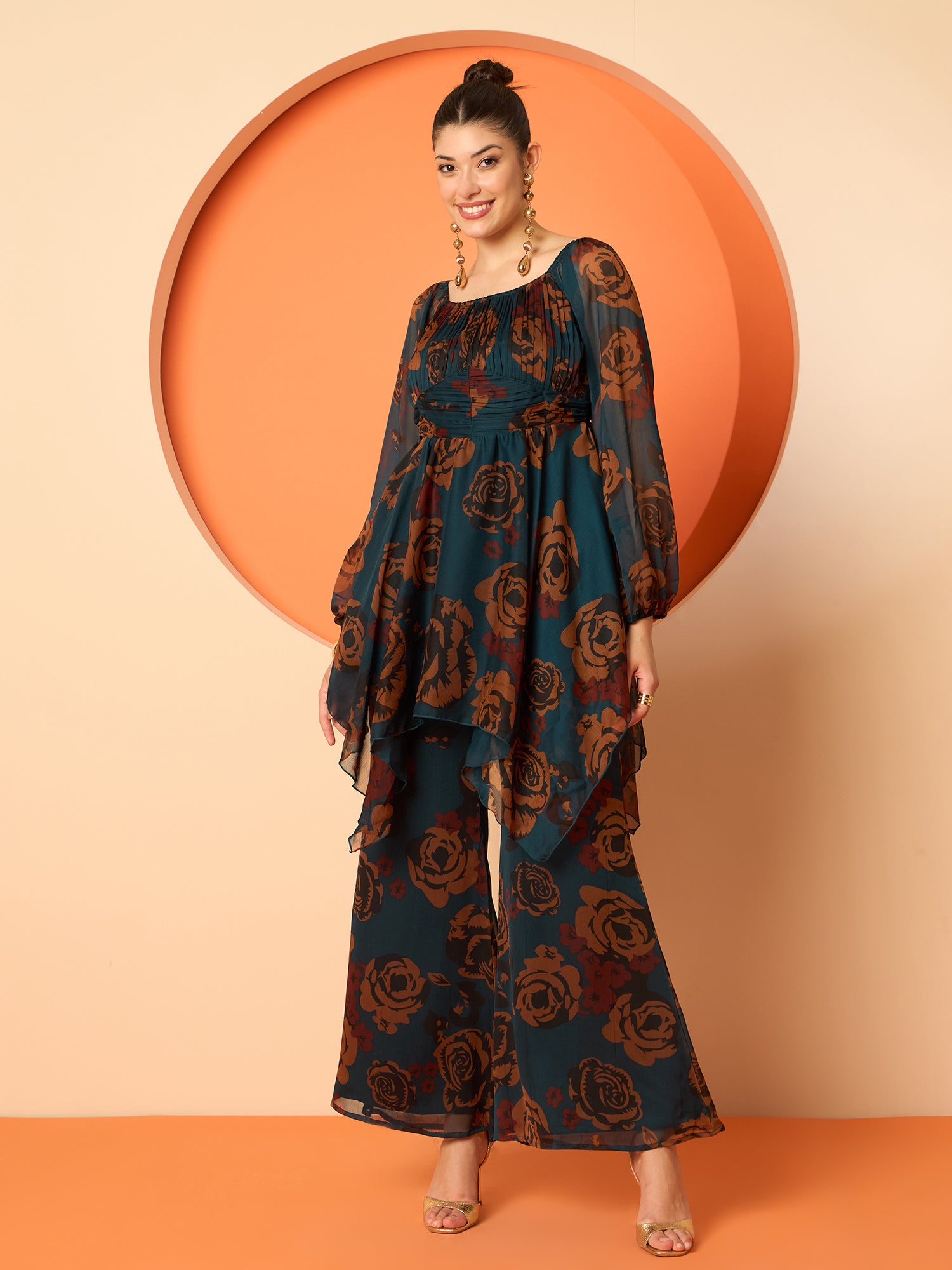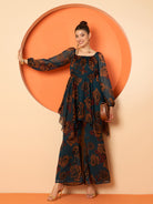 Teal-blue and brown printed palazzos, has an elasticated waistband with slip-on closure with 1 pocket