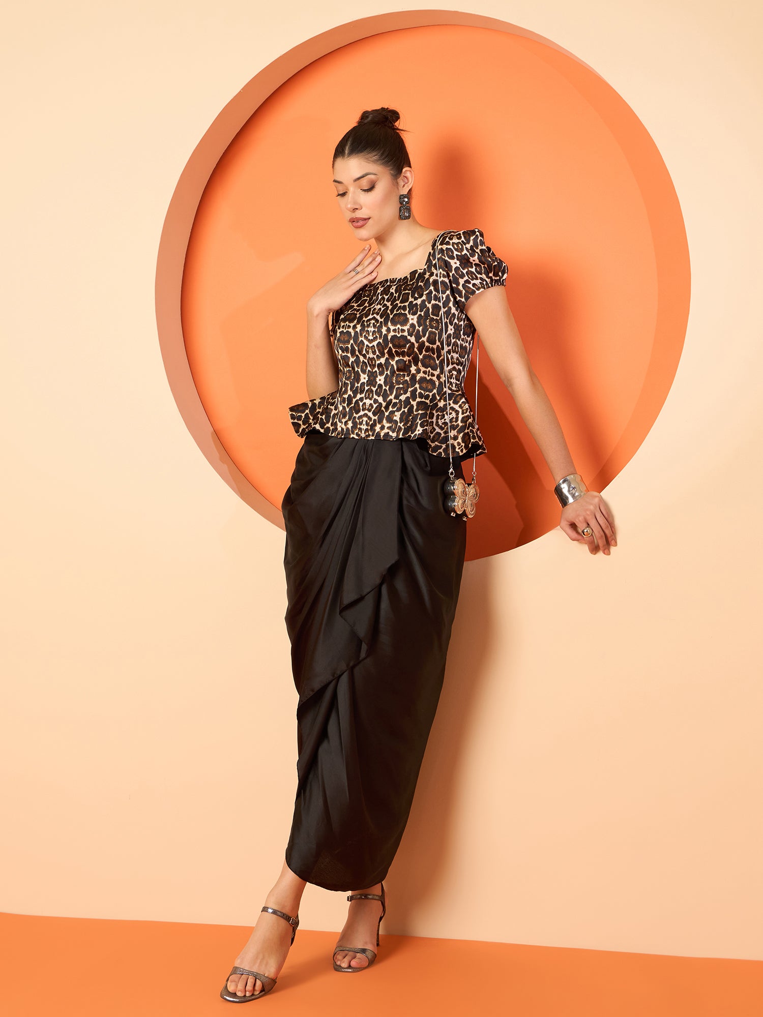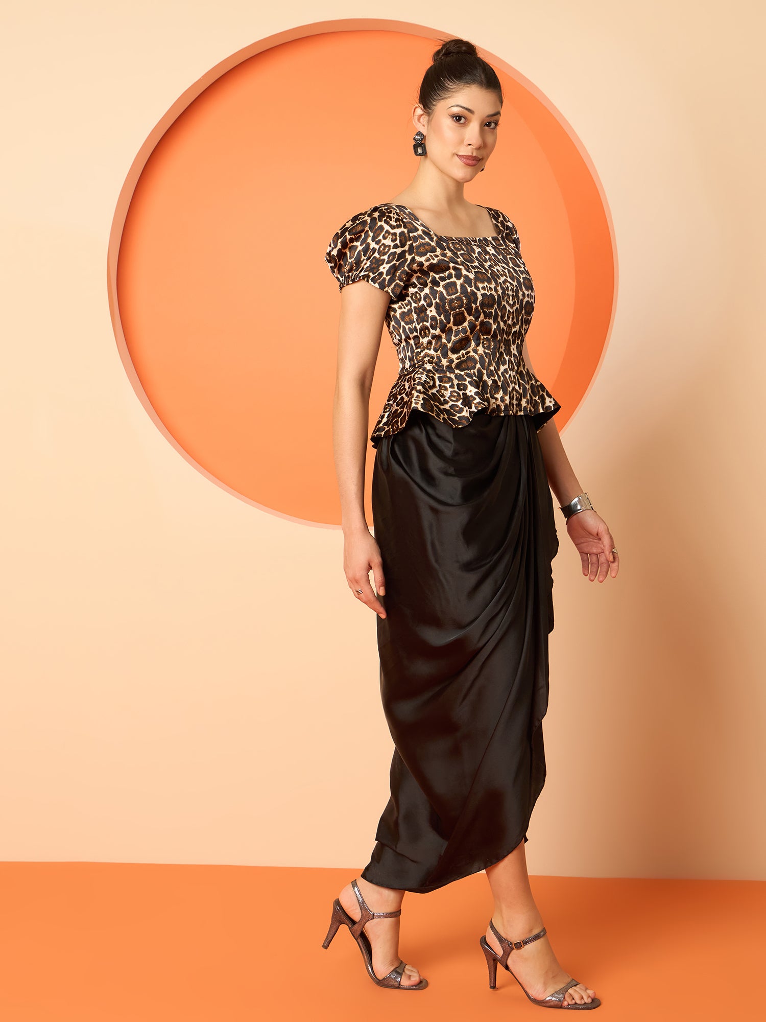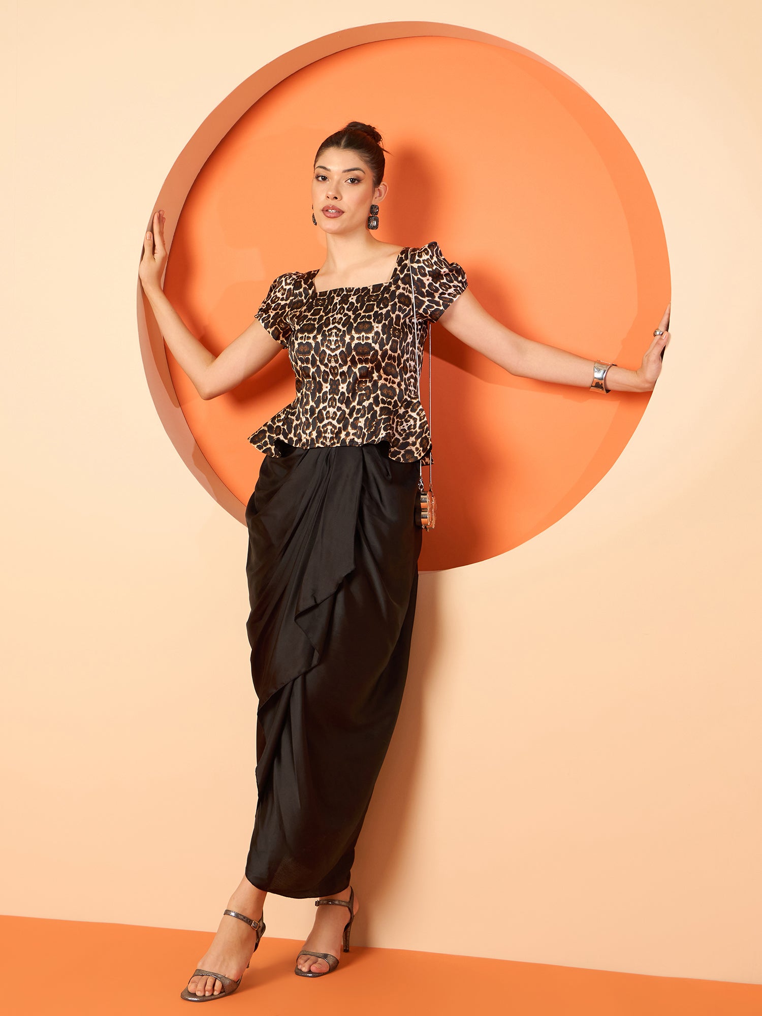 Antheaa Printed Square-Neck Peplum Top With Drapped Satin Skirt