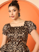 Brown and black printed top, has a square-neck and short sleeves, secured with slip-on closure