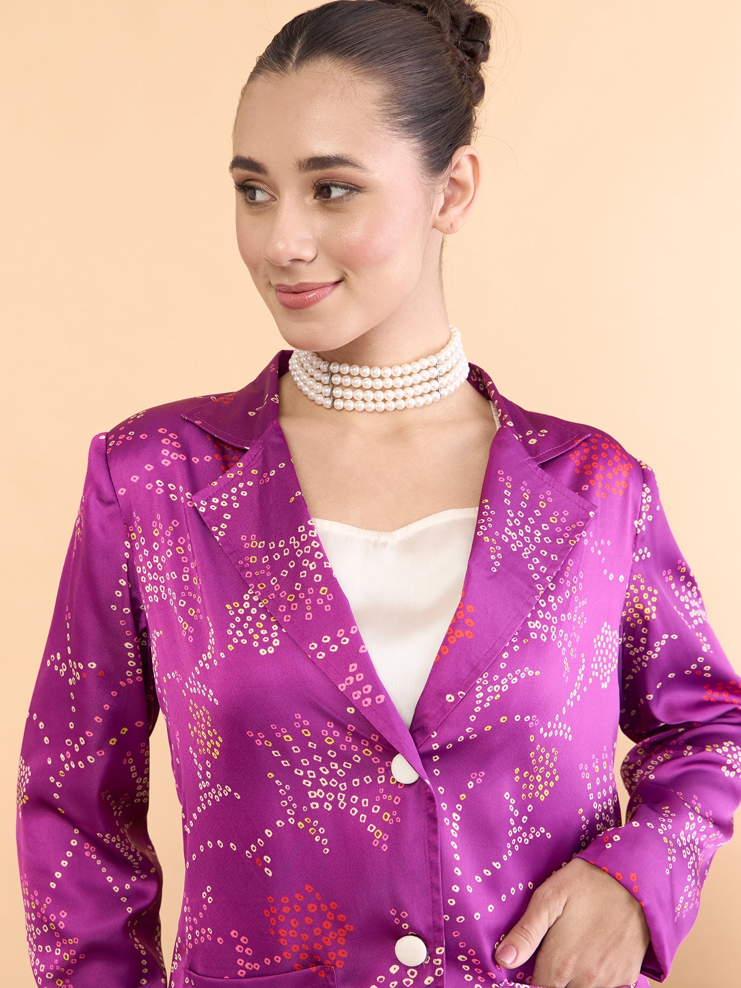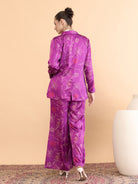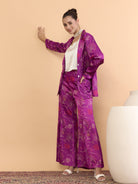 Purple, white and red printed jacket has Knotched lapel collar,long sleeves and button closure