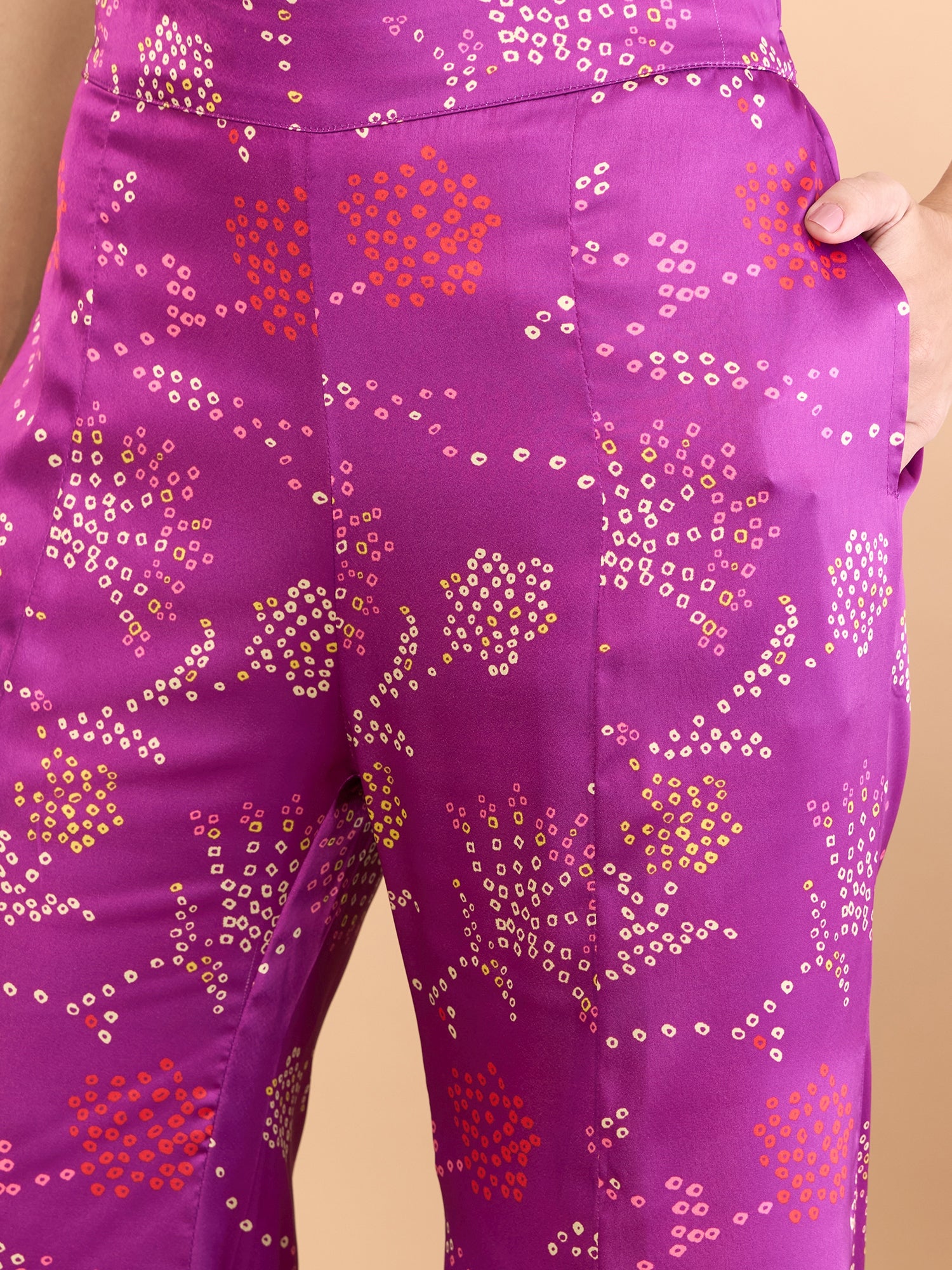 Purple, white and red printed palazzos, has an elasticated waistband with slip-on closure