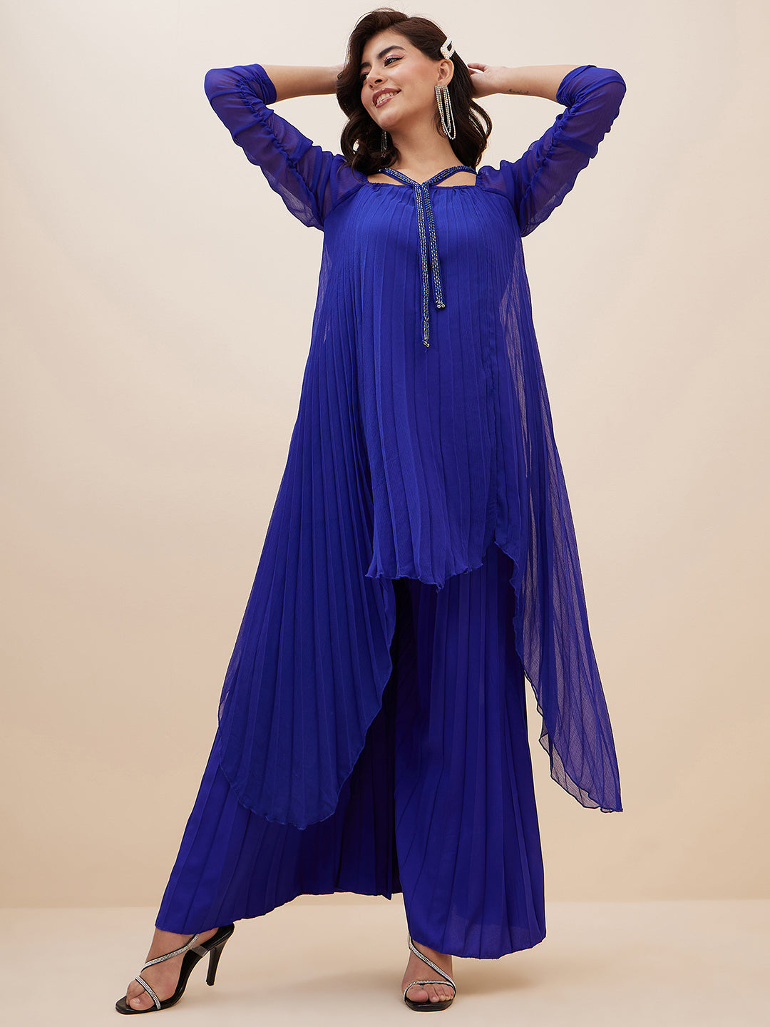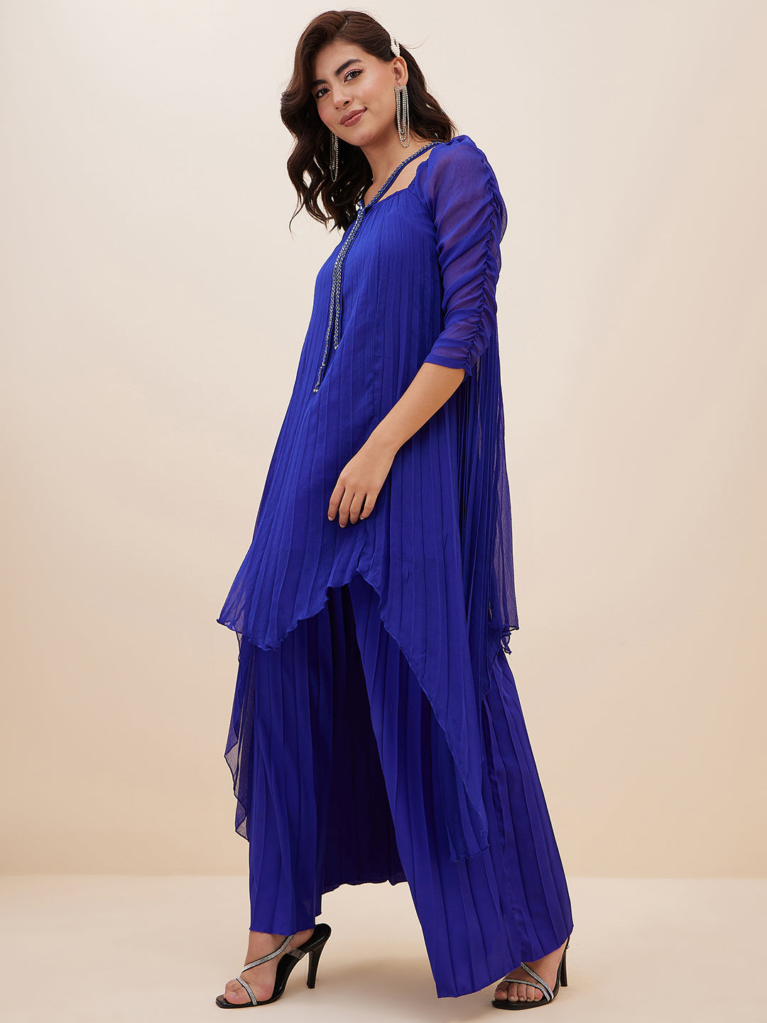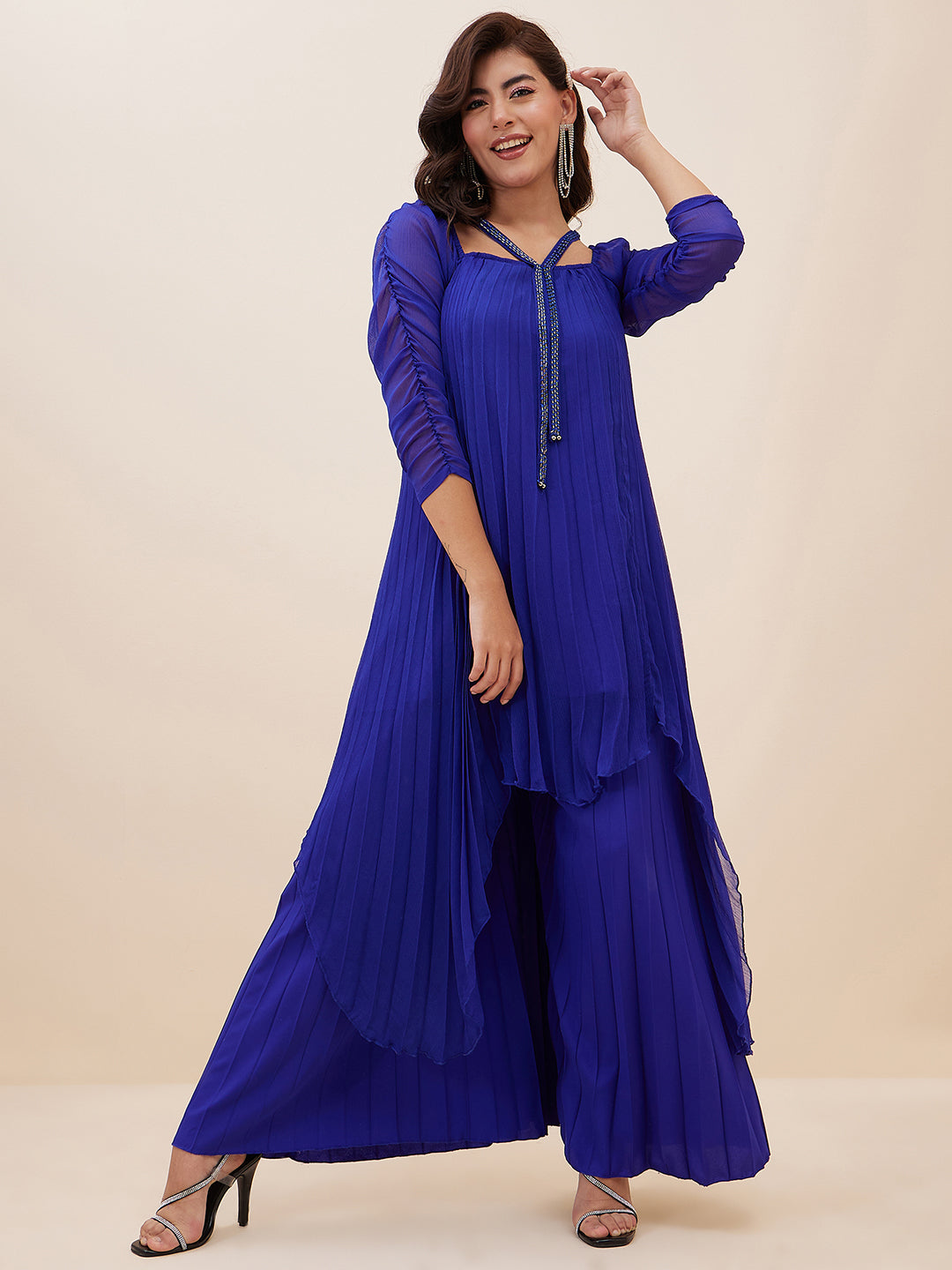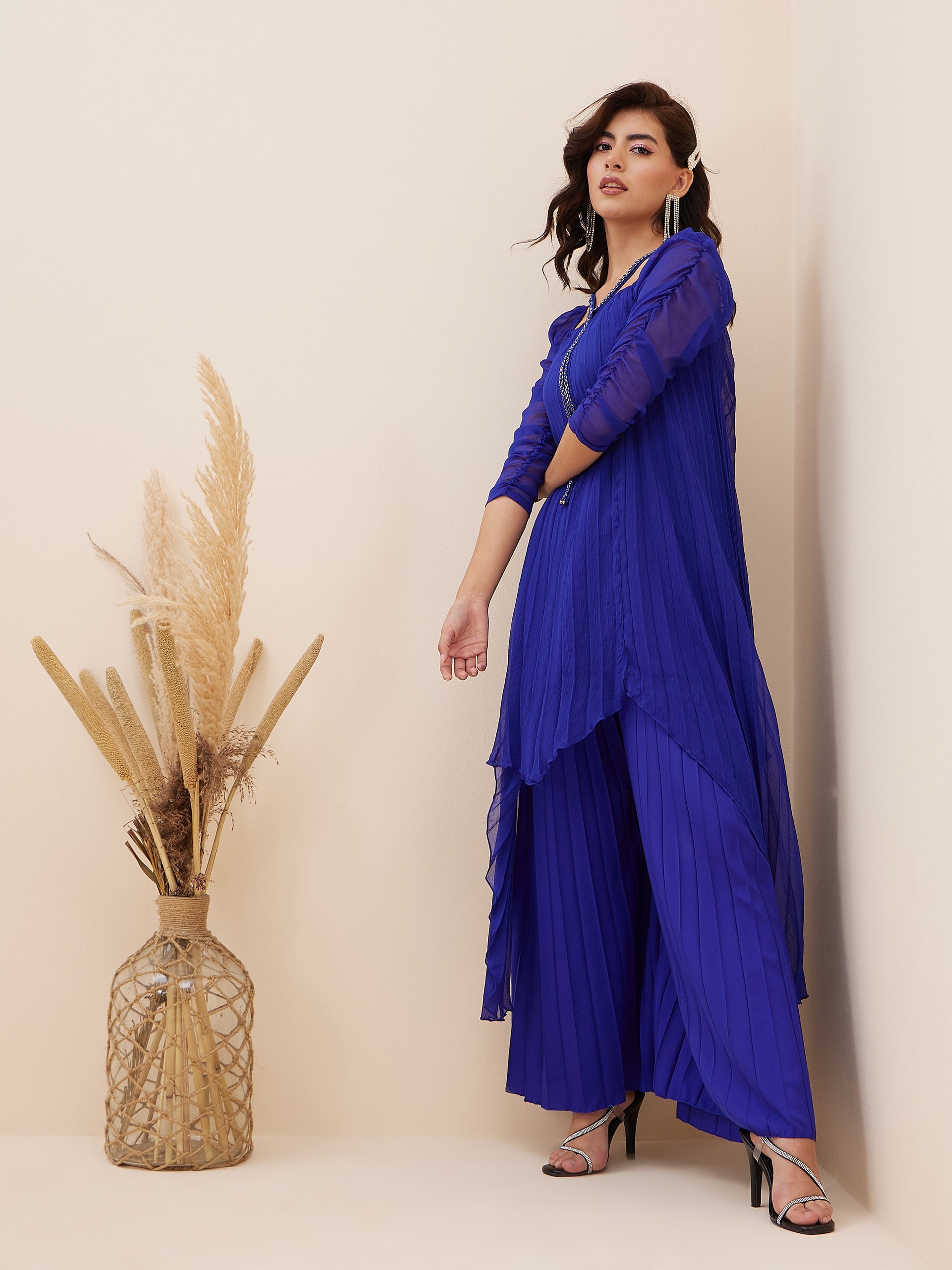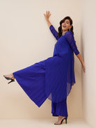 This ethnic co-ord set consists of Blue solid Top with palazzos