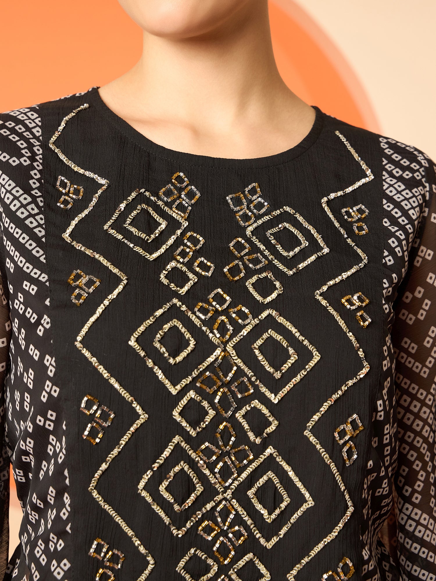 Black printed top, has a round neck and long sleeves