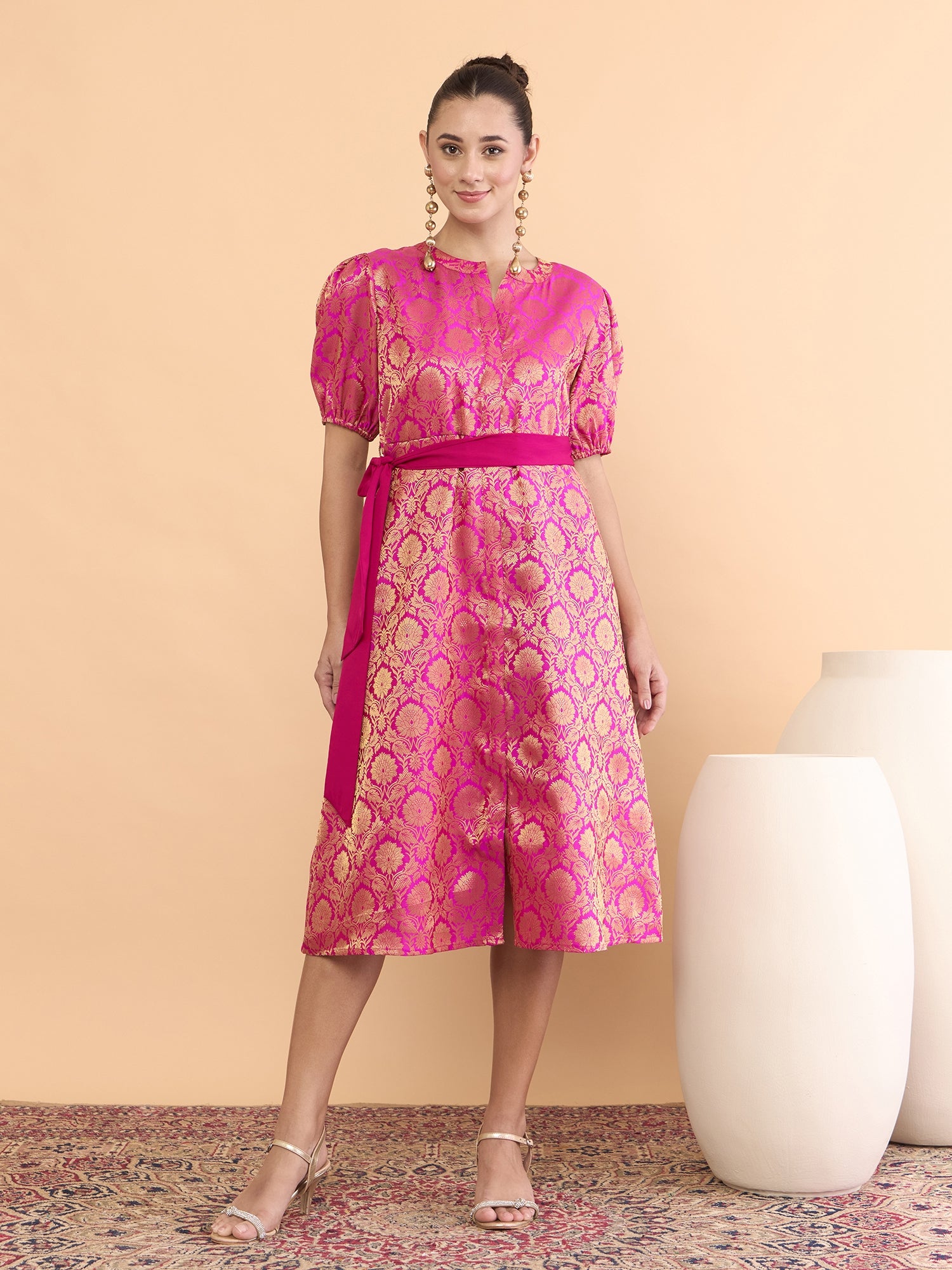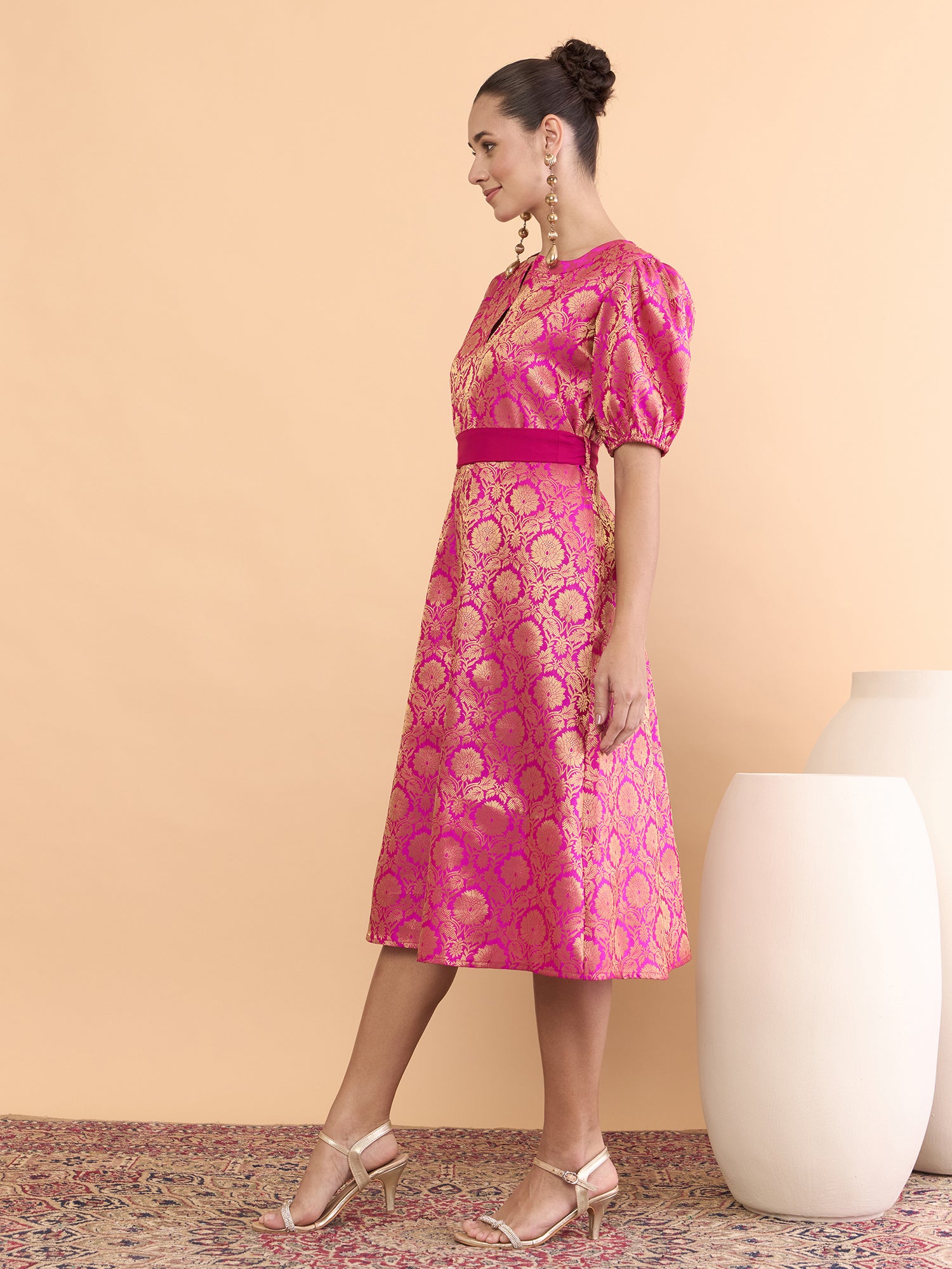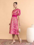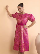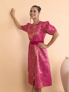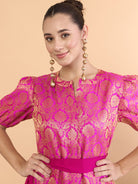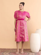 Antheaa Brocade Mandarin Collar Fit and Flare Midi Dress