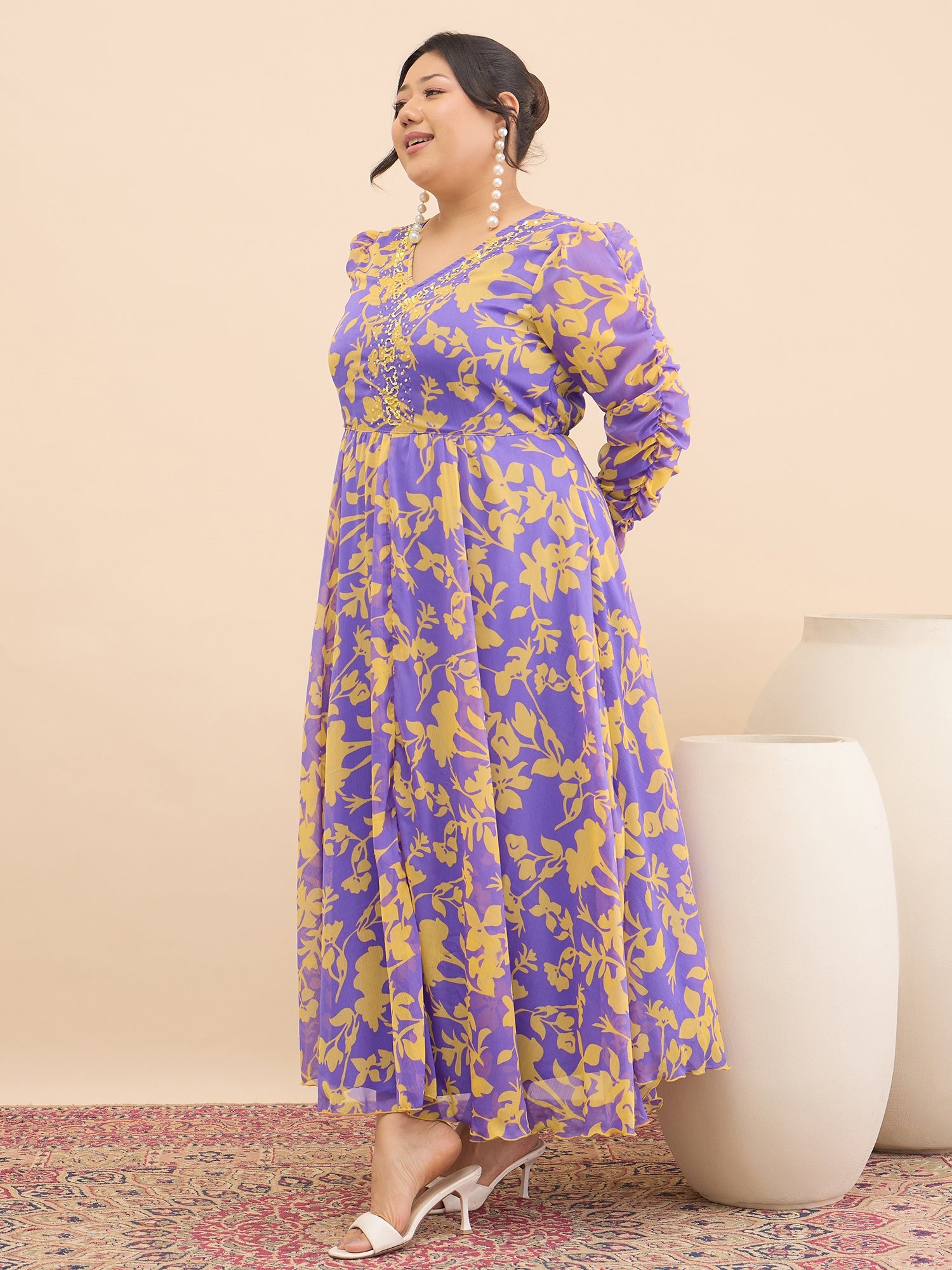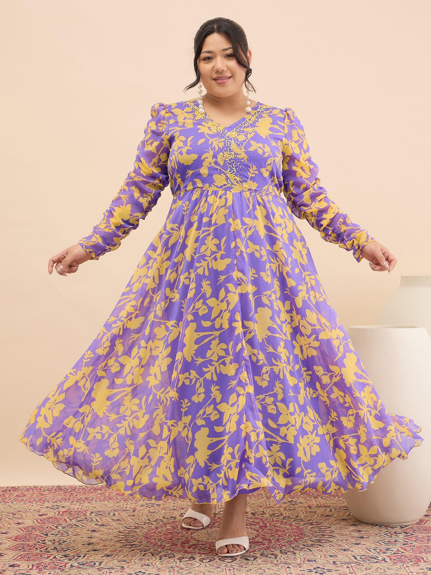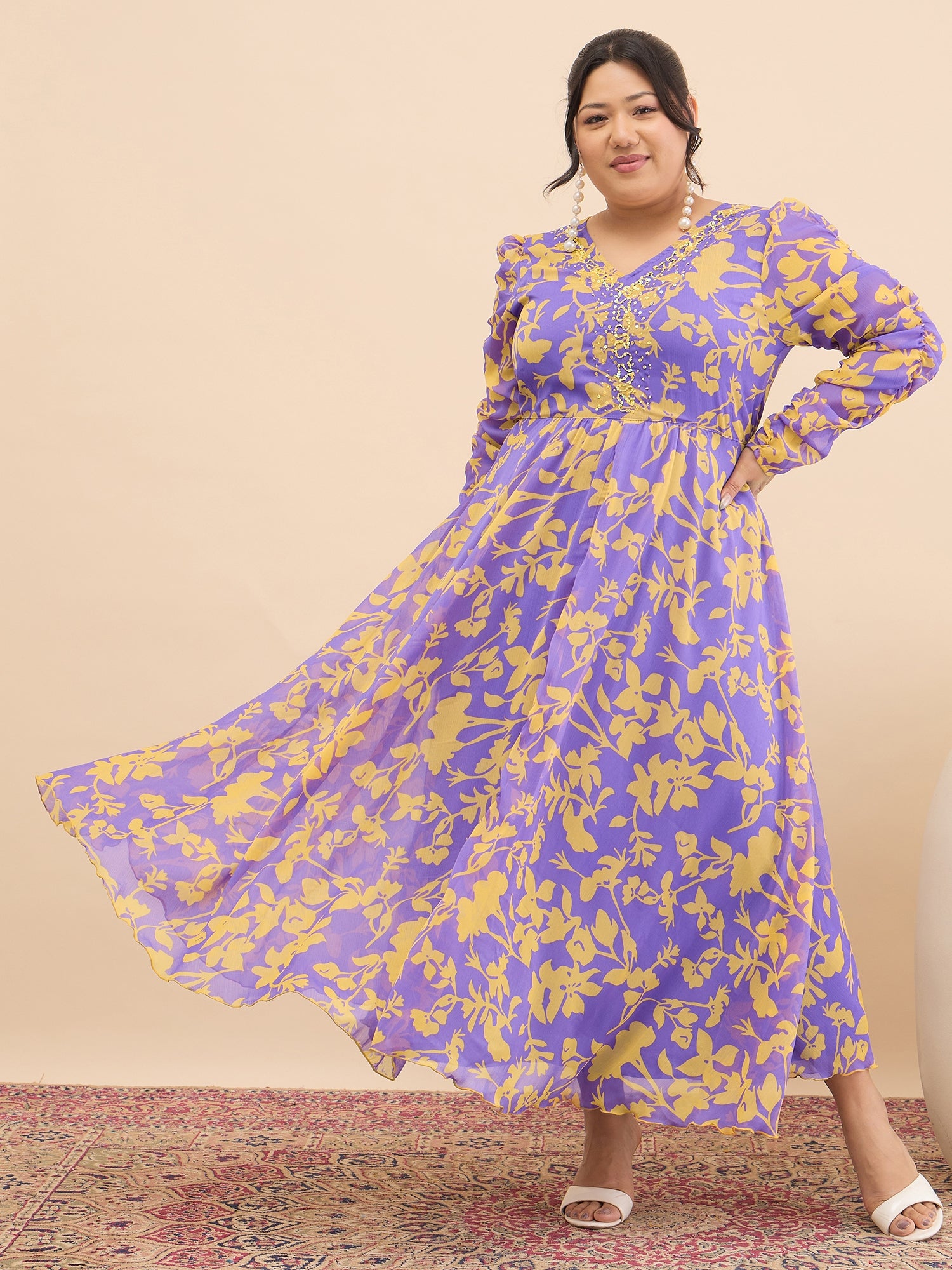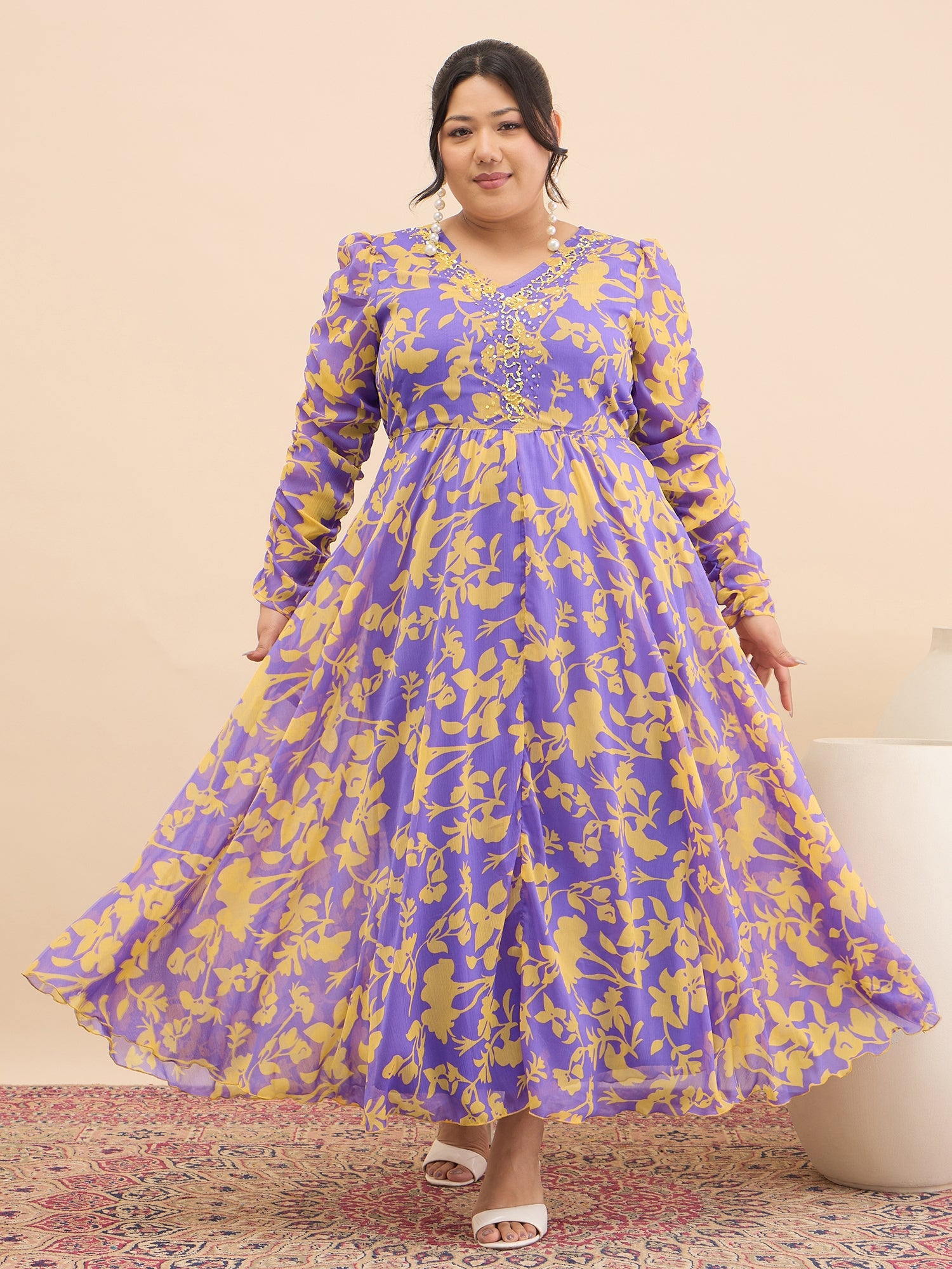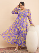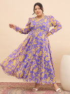 Antheaa Curve Embellished Floral Print A-Line Maxi Dress