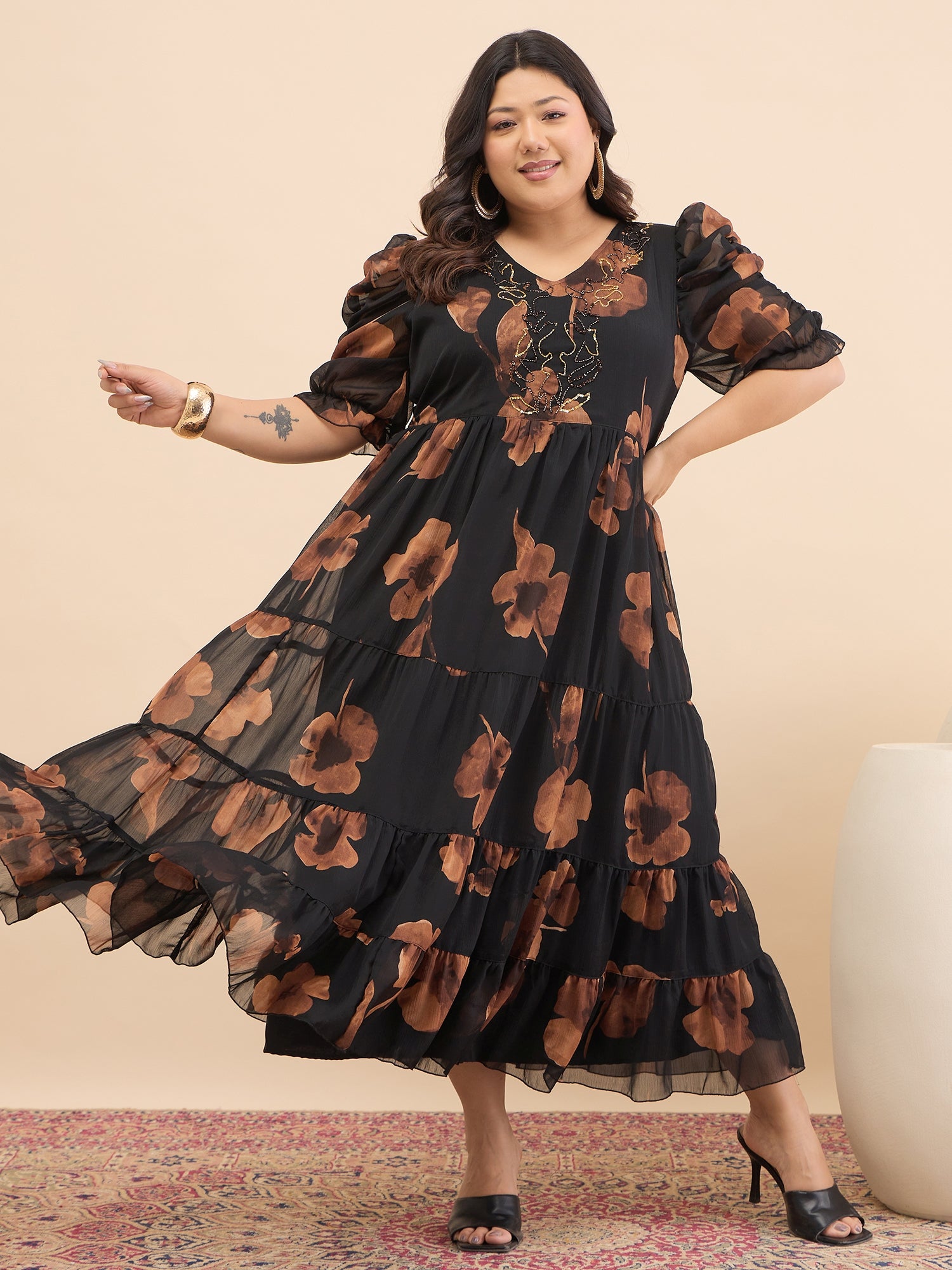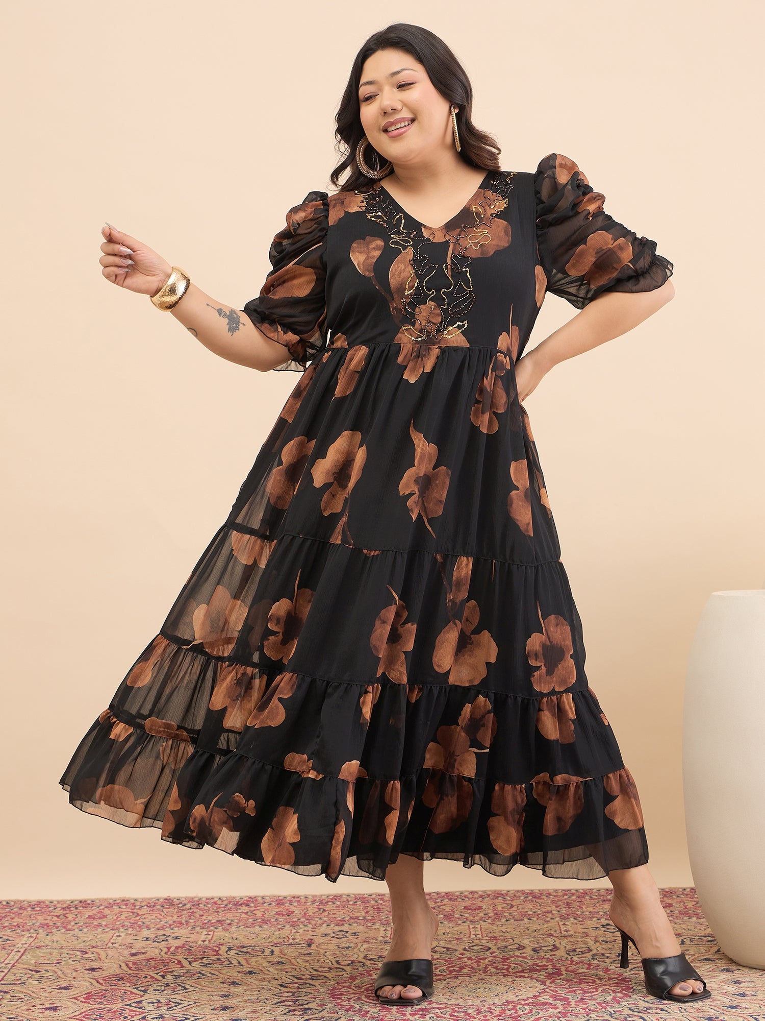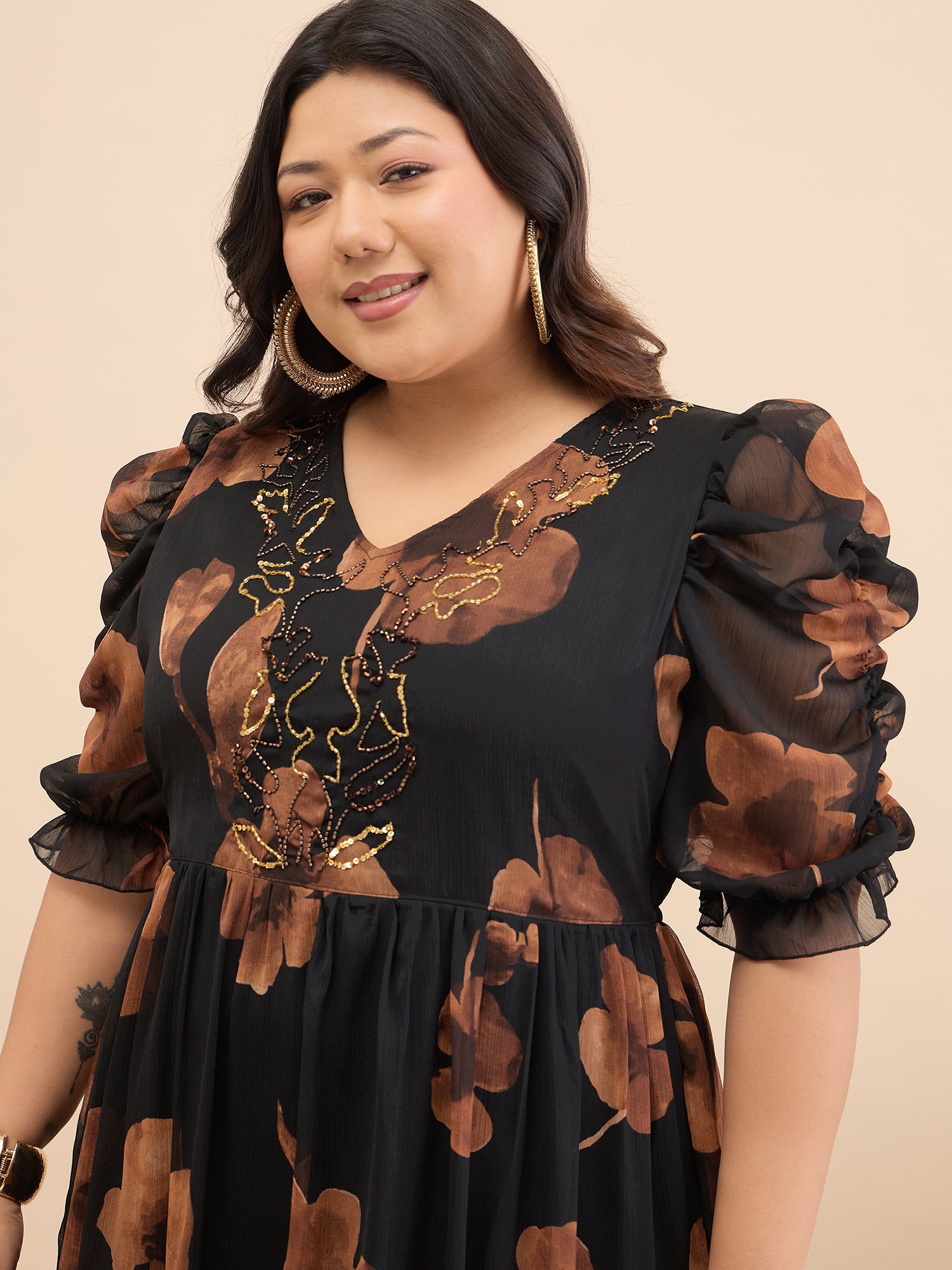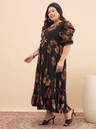 Antheaa Curve Embellished Floral Print Puff Sleeve A-Line Midi Dress