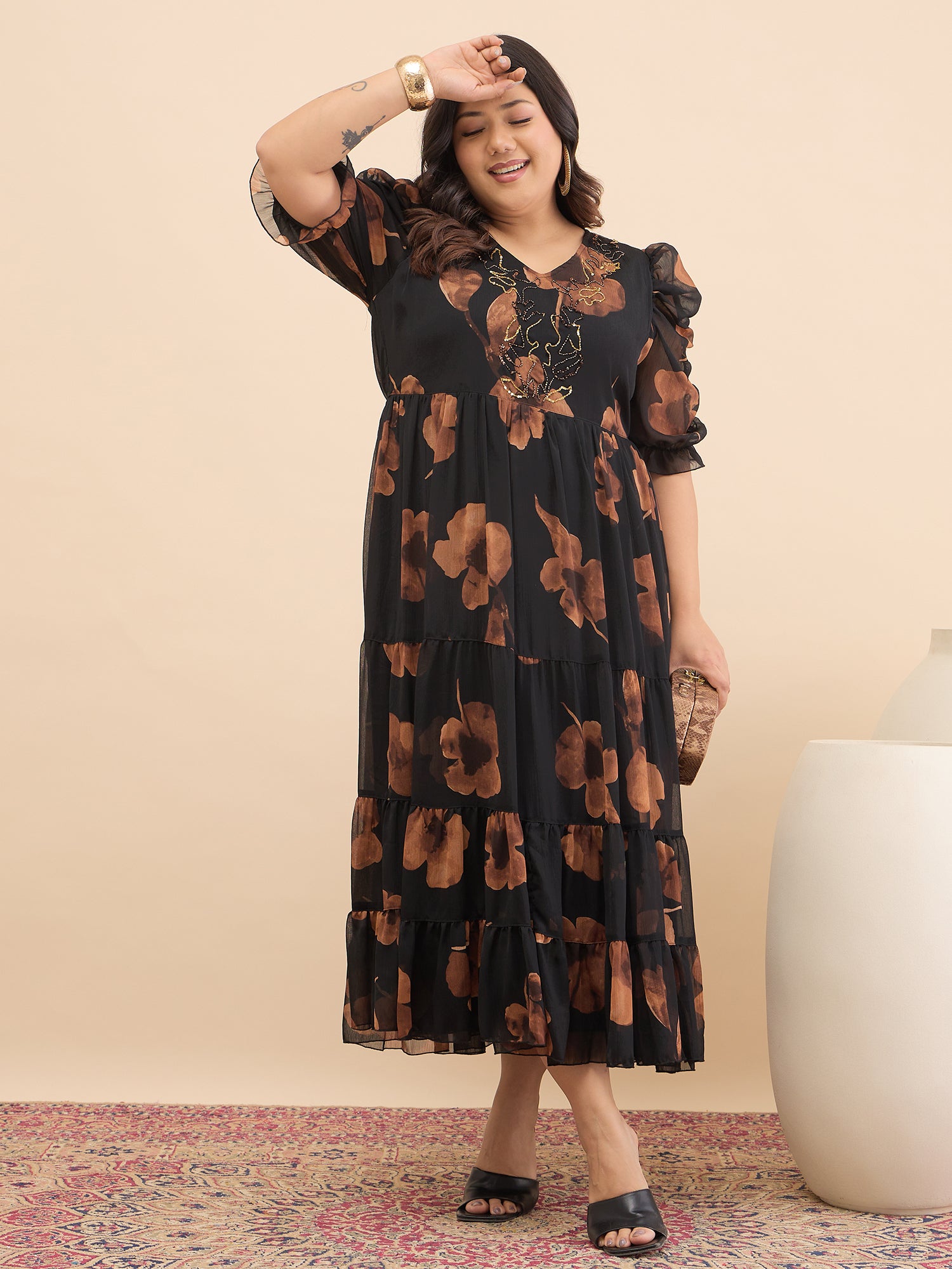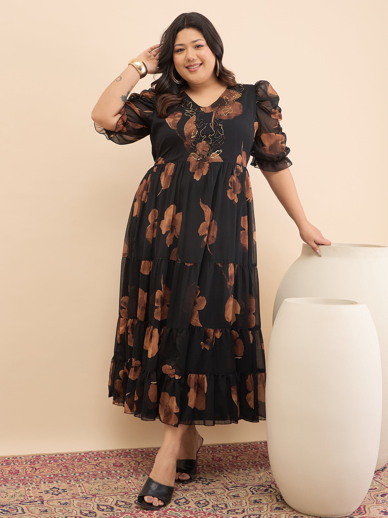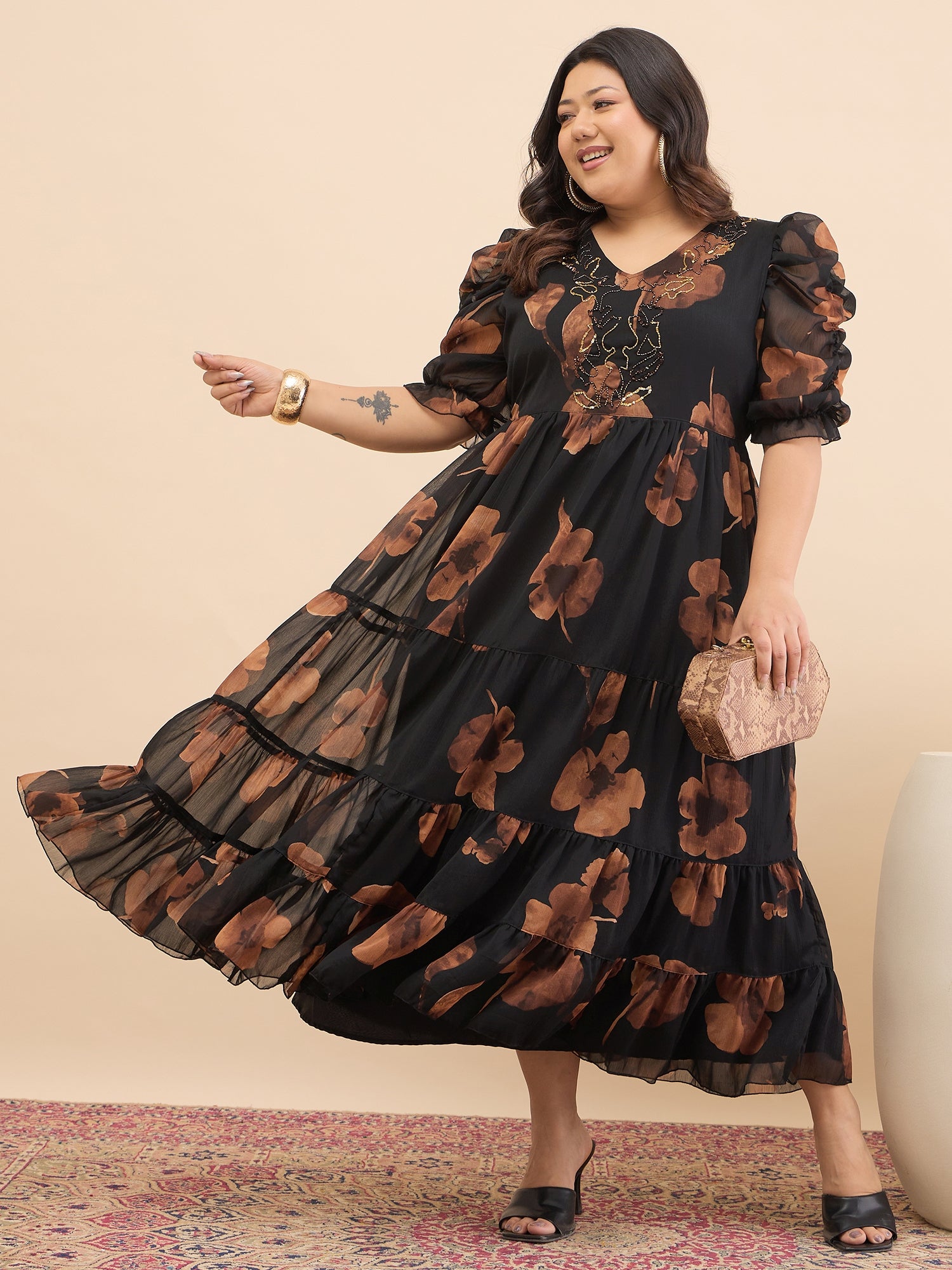 Antheaa Curve Embellished Floral Print Puff Sleeve A-Line Midi Dress