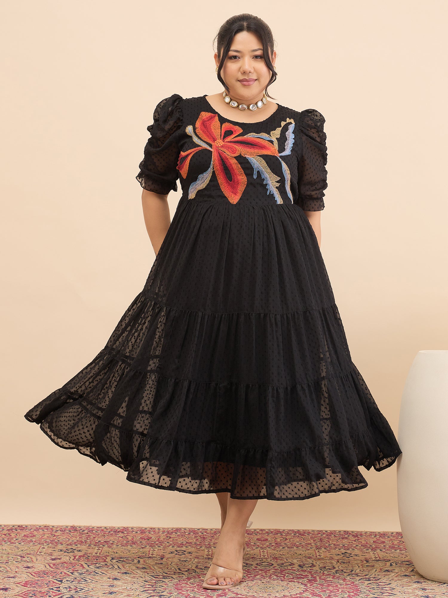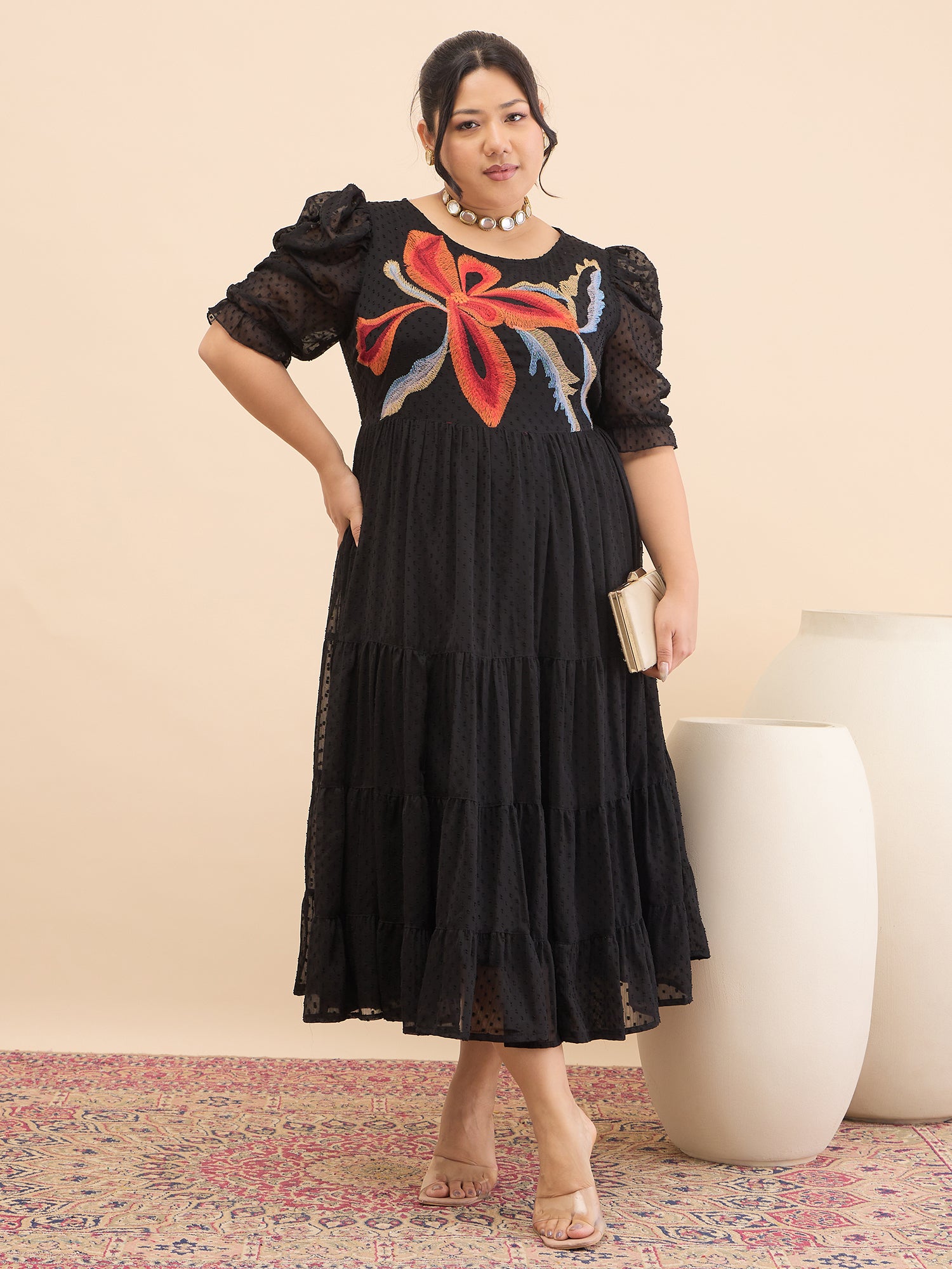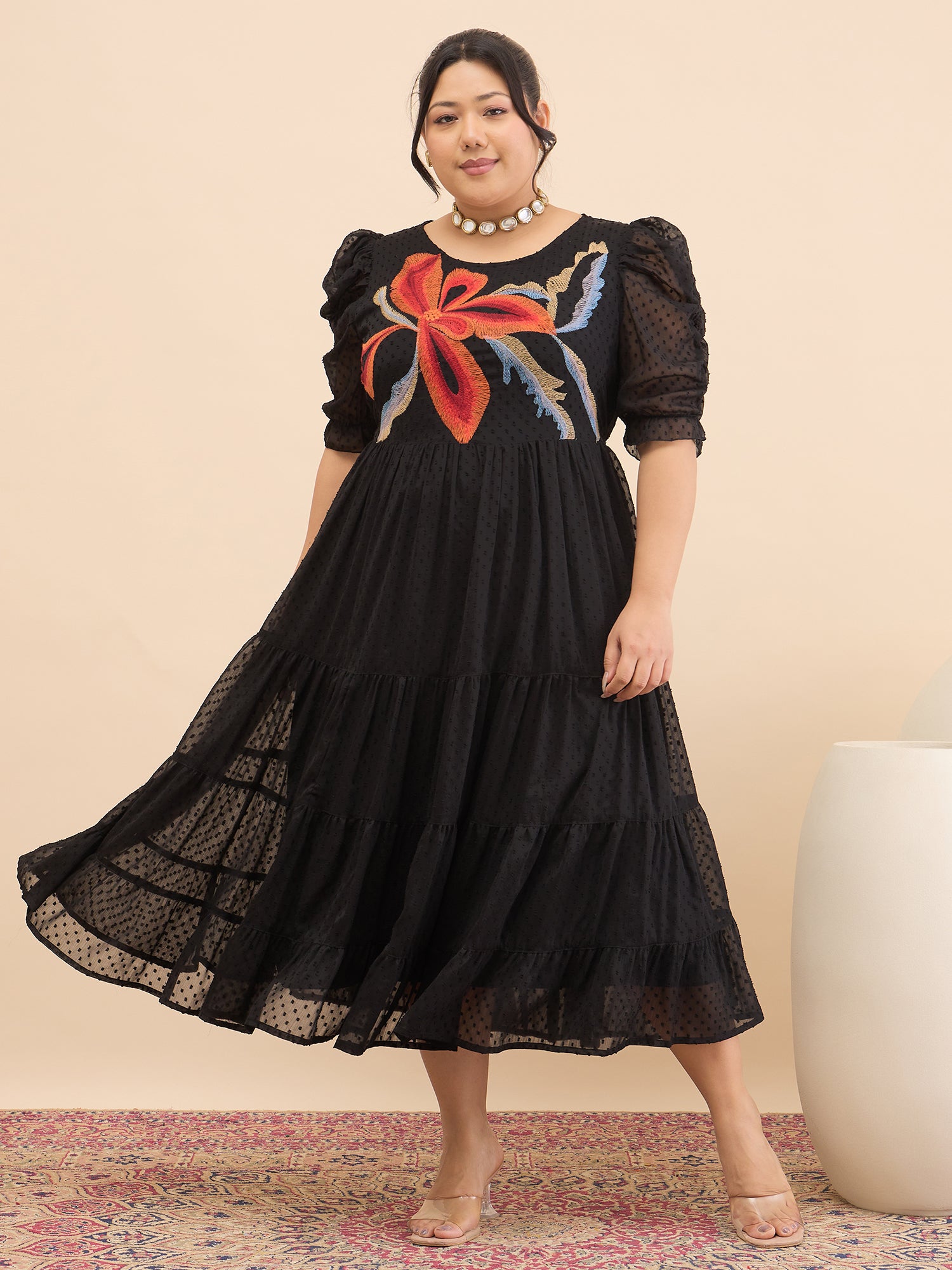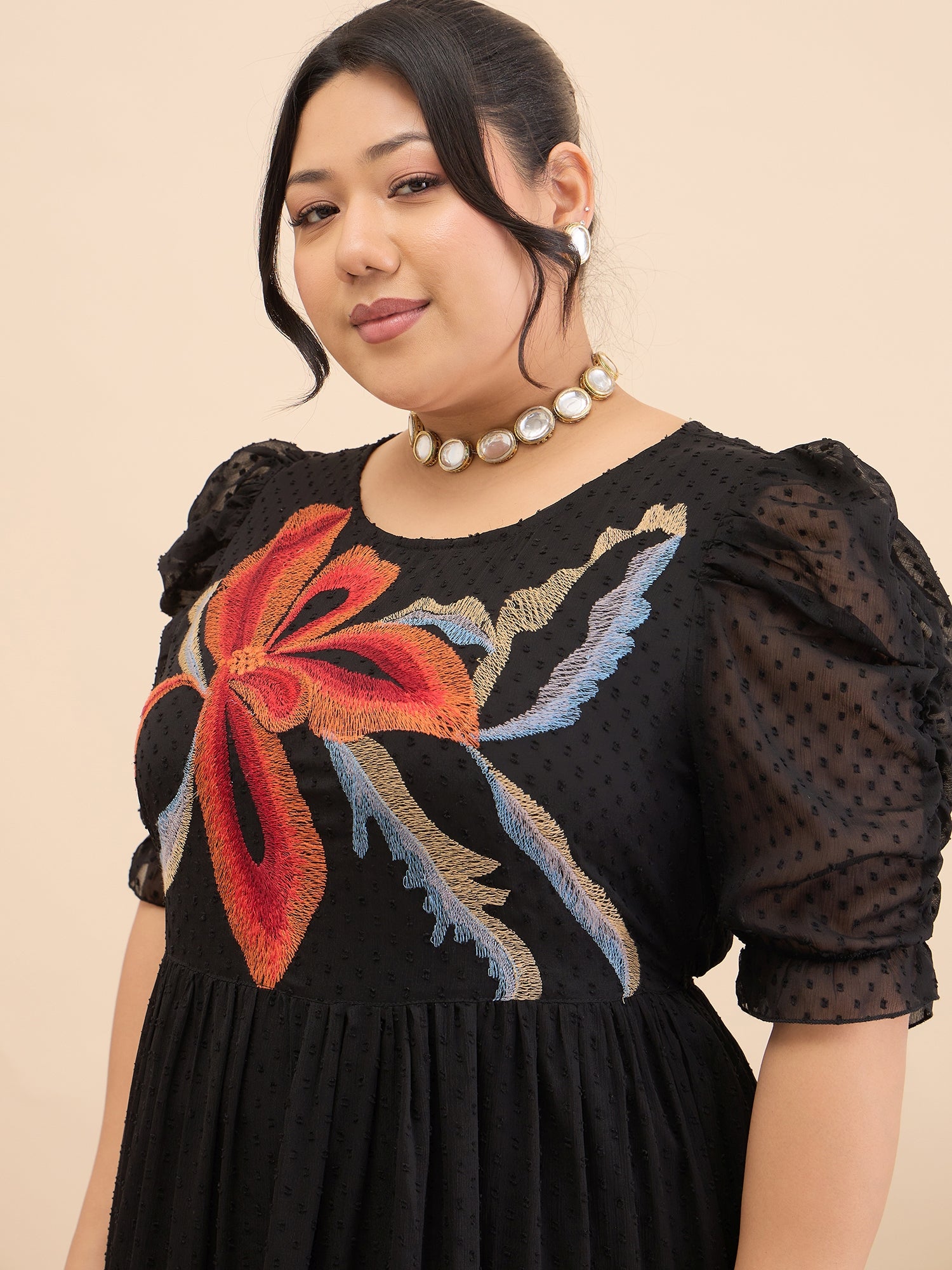 Antheaa Curve Embroidered Puff Sleeve Chiffon Fit & Flare Midi Dress