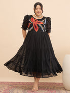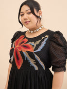 - Black and black abstract embroidered fit & flare dress