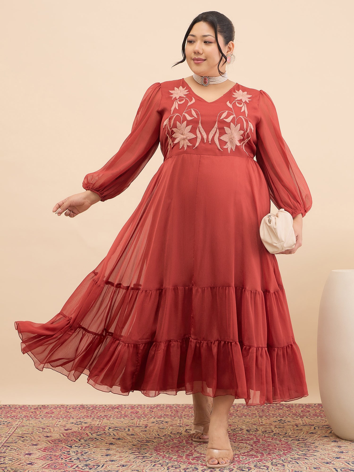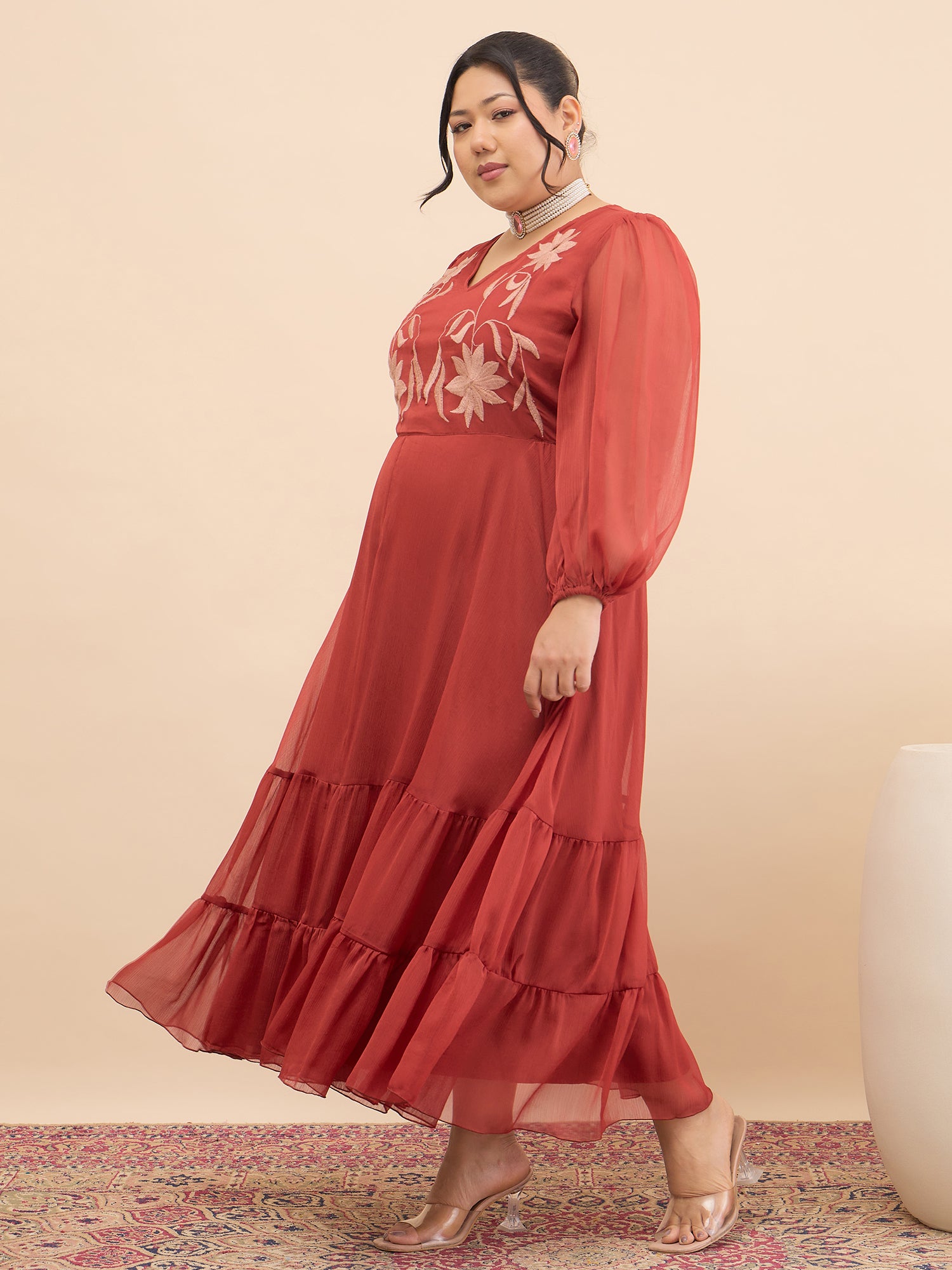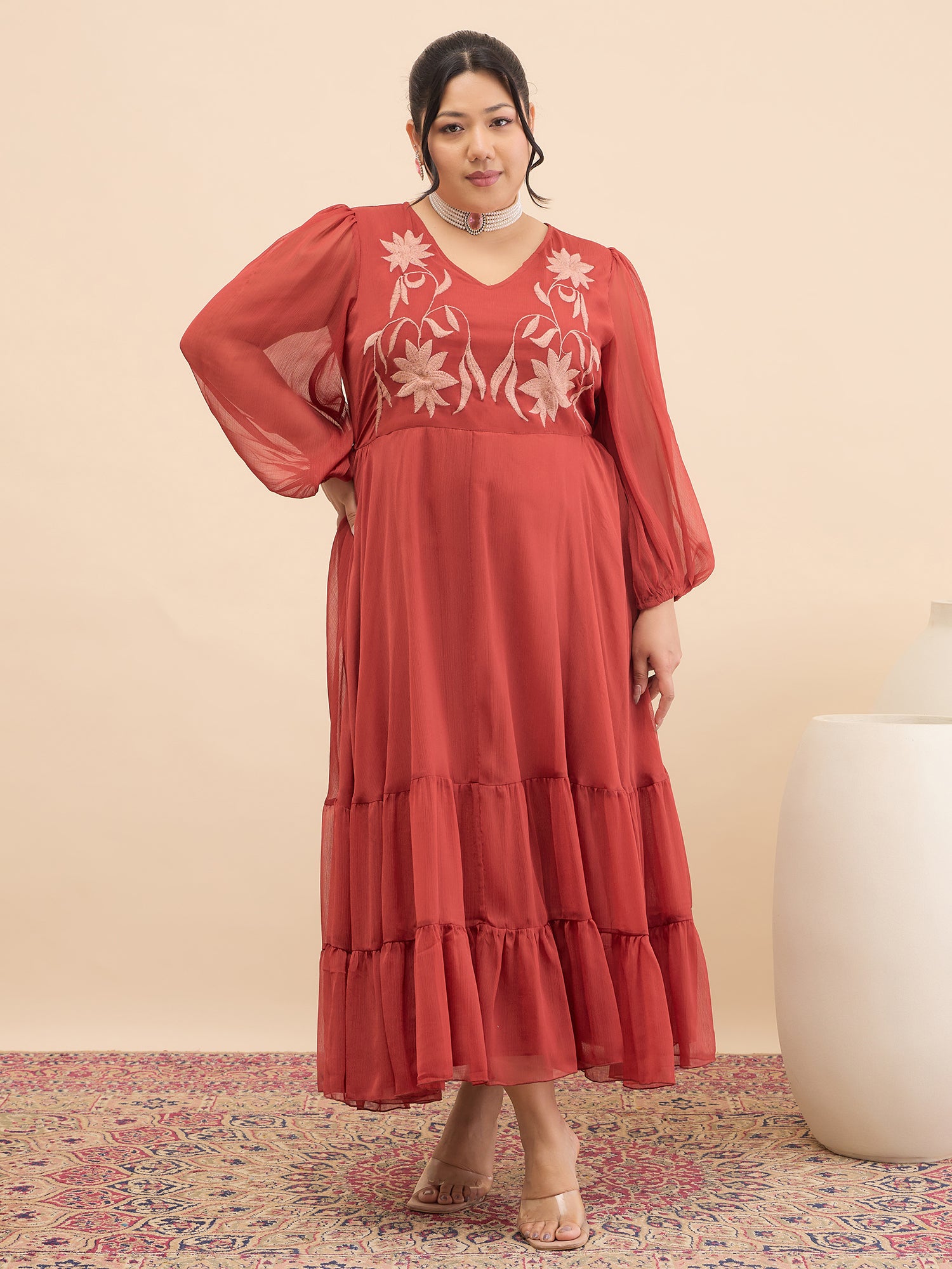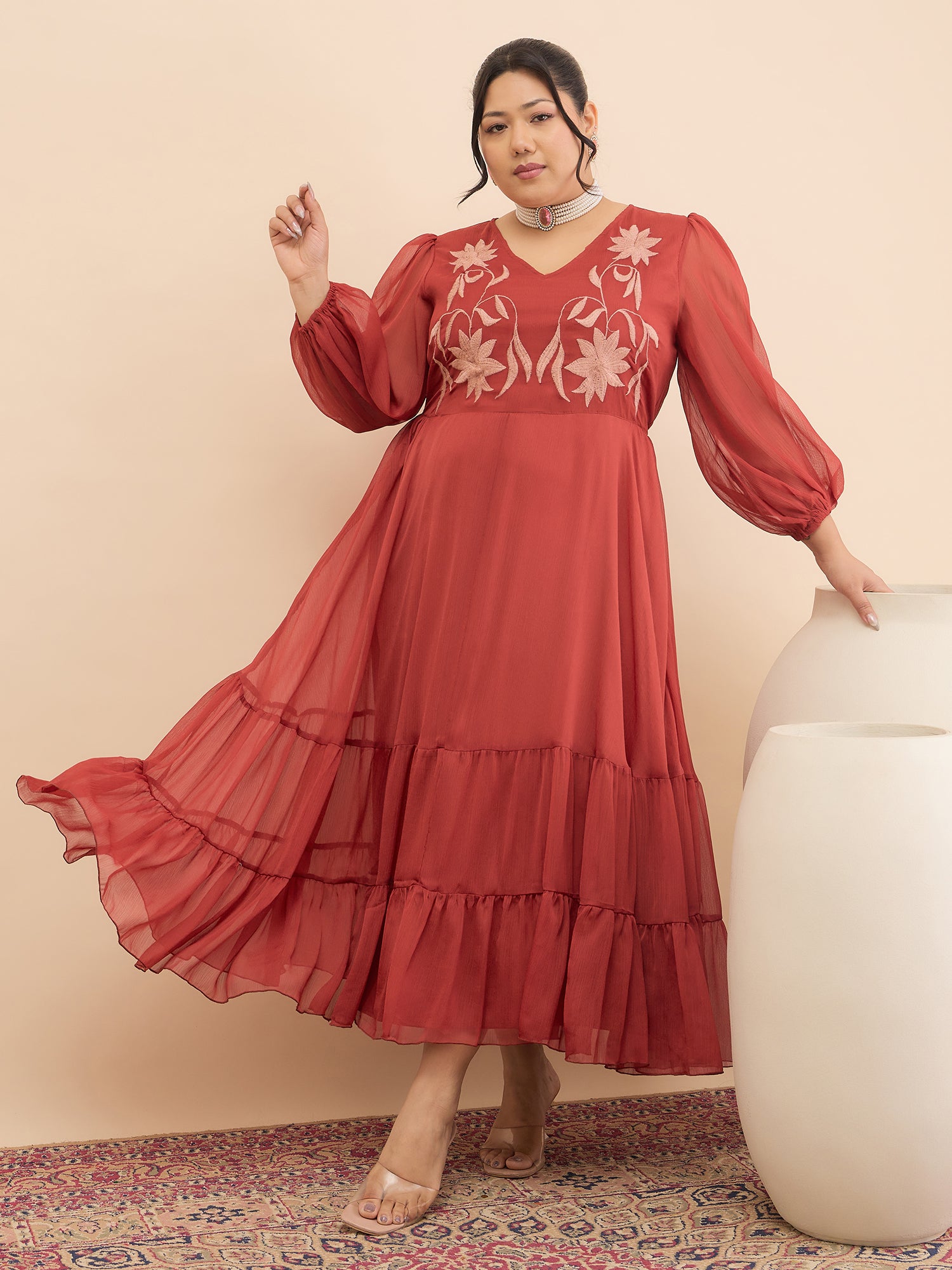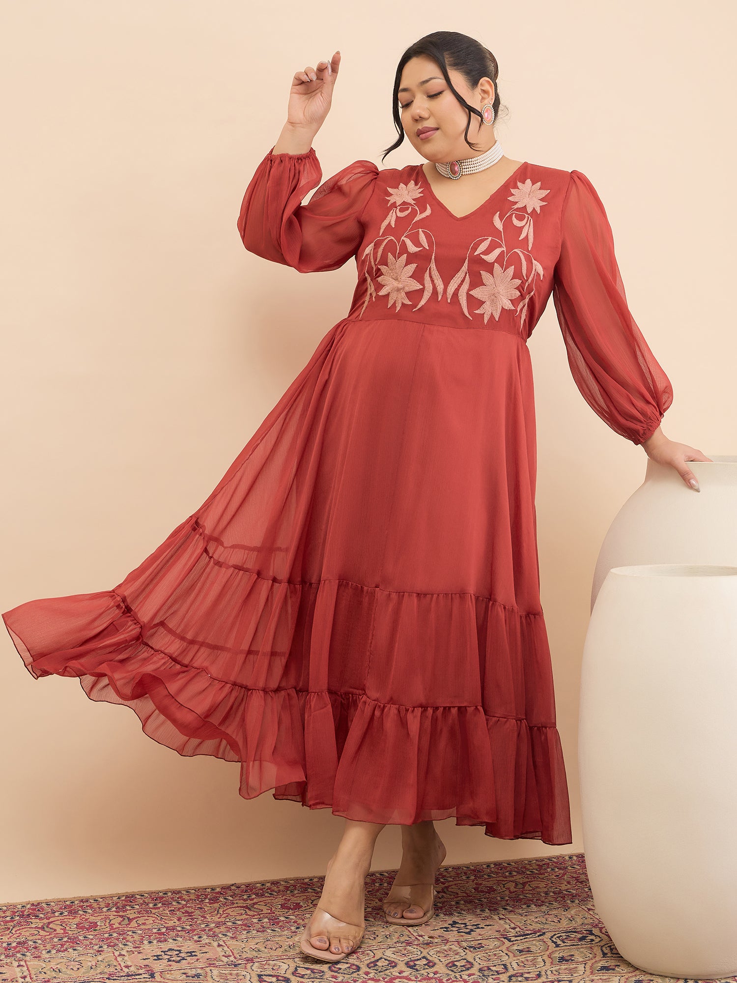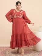 Antheaa Curve Floral Embroidered Chiffon Fit & Flare Maxi Dress