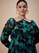 - Teal and black abstract print fit & flare dress