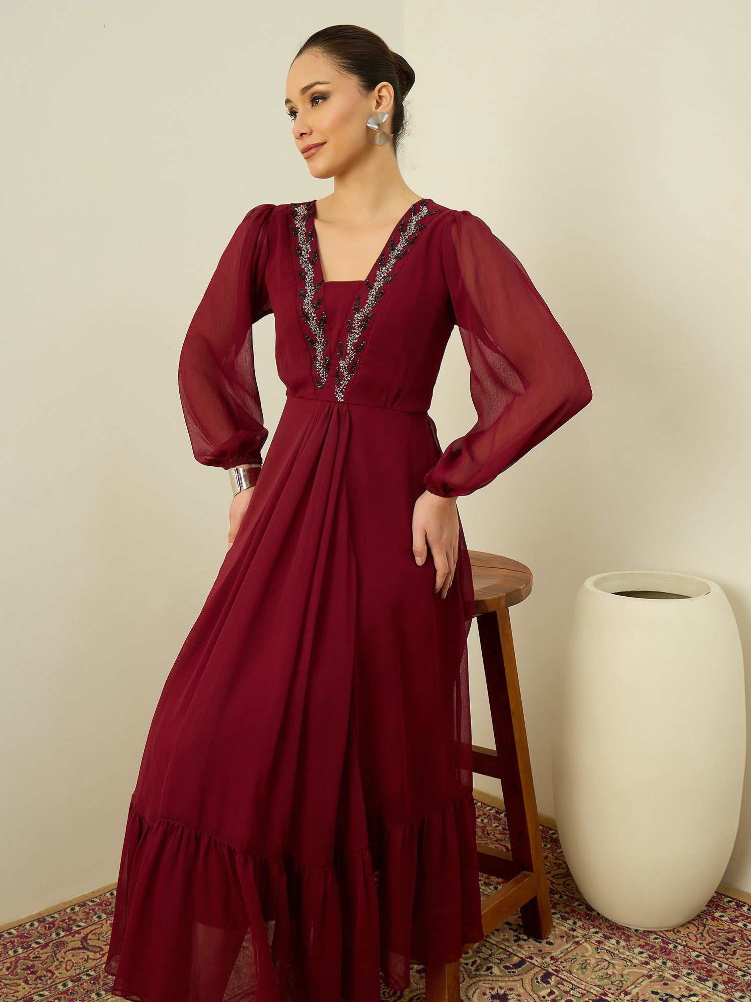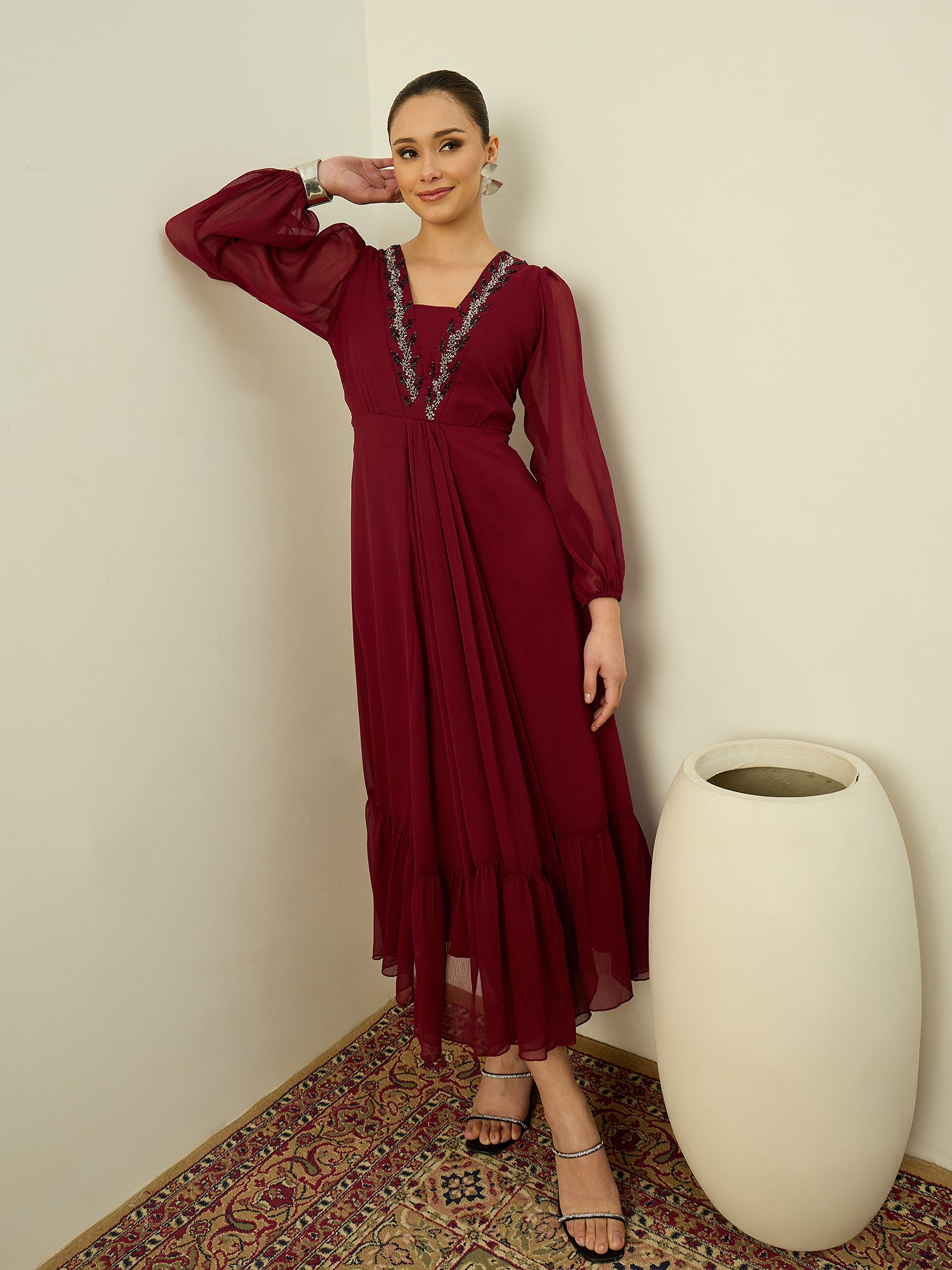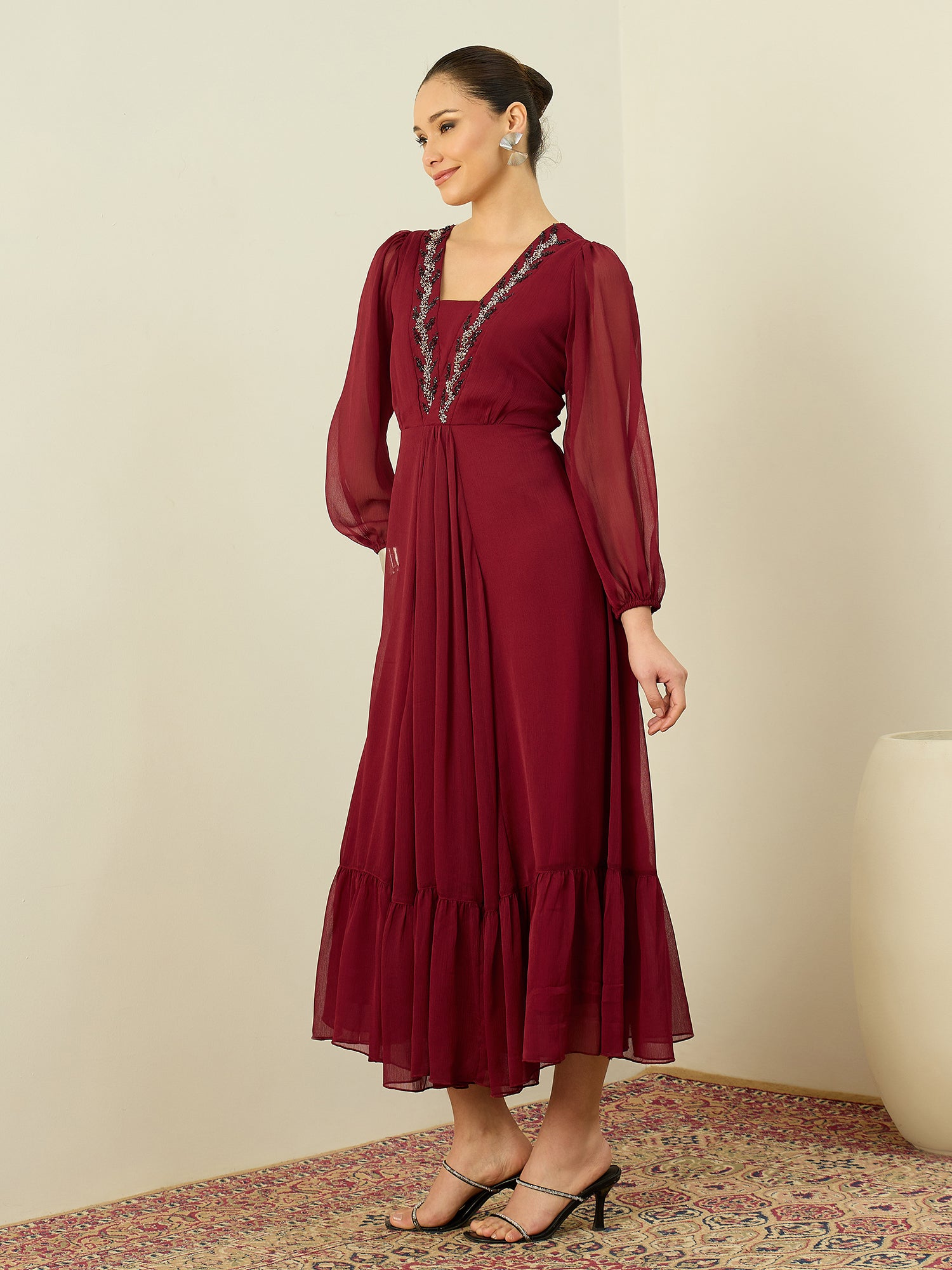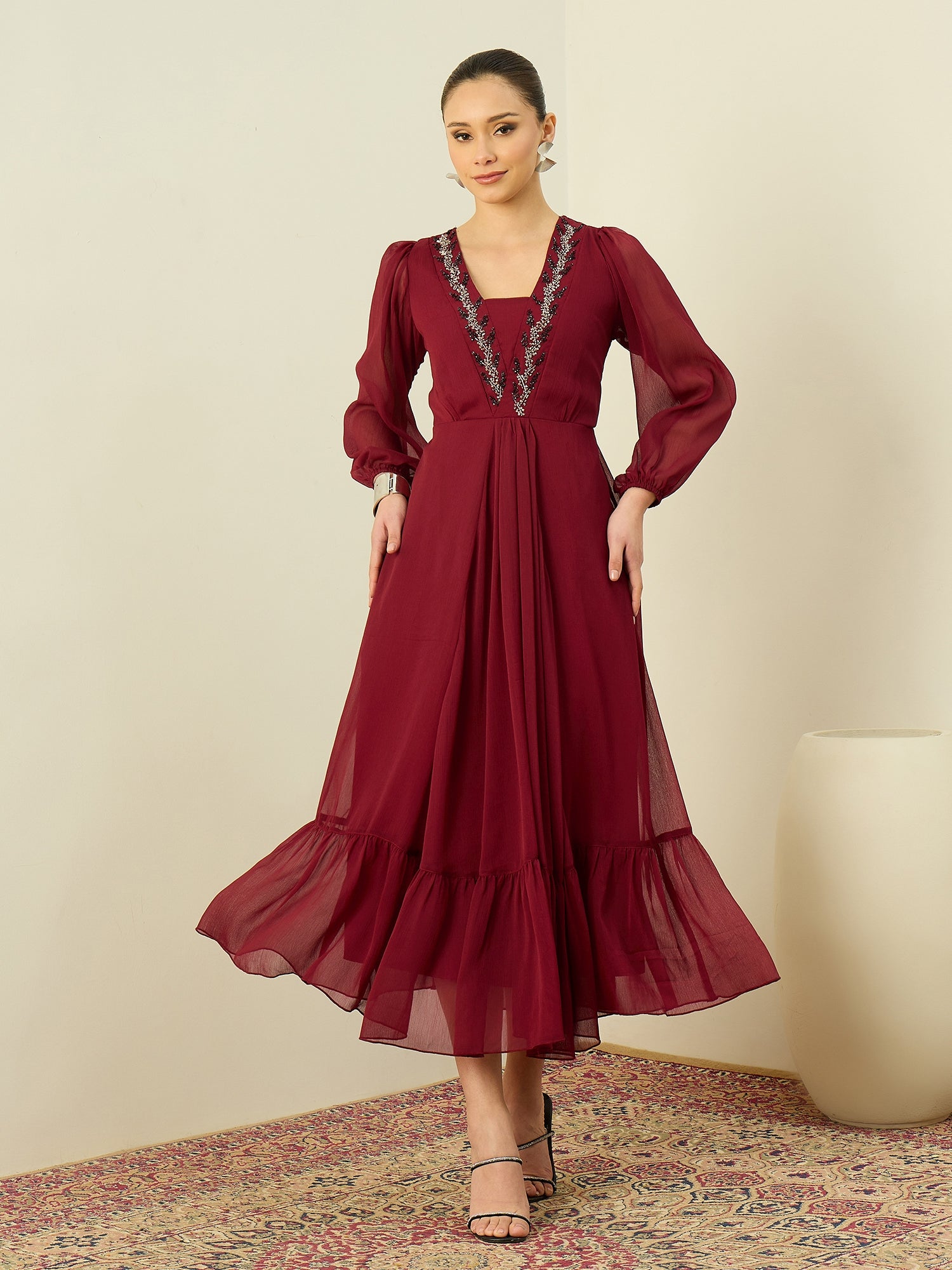 Antheaa Embellished Chiffon Fit & Flare Midi Dress