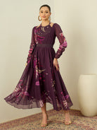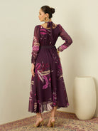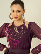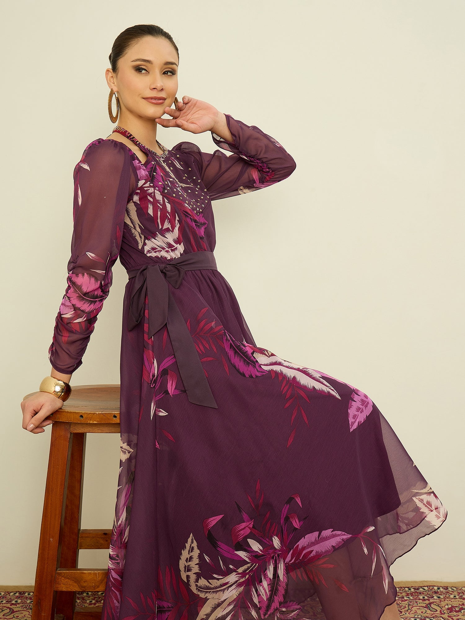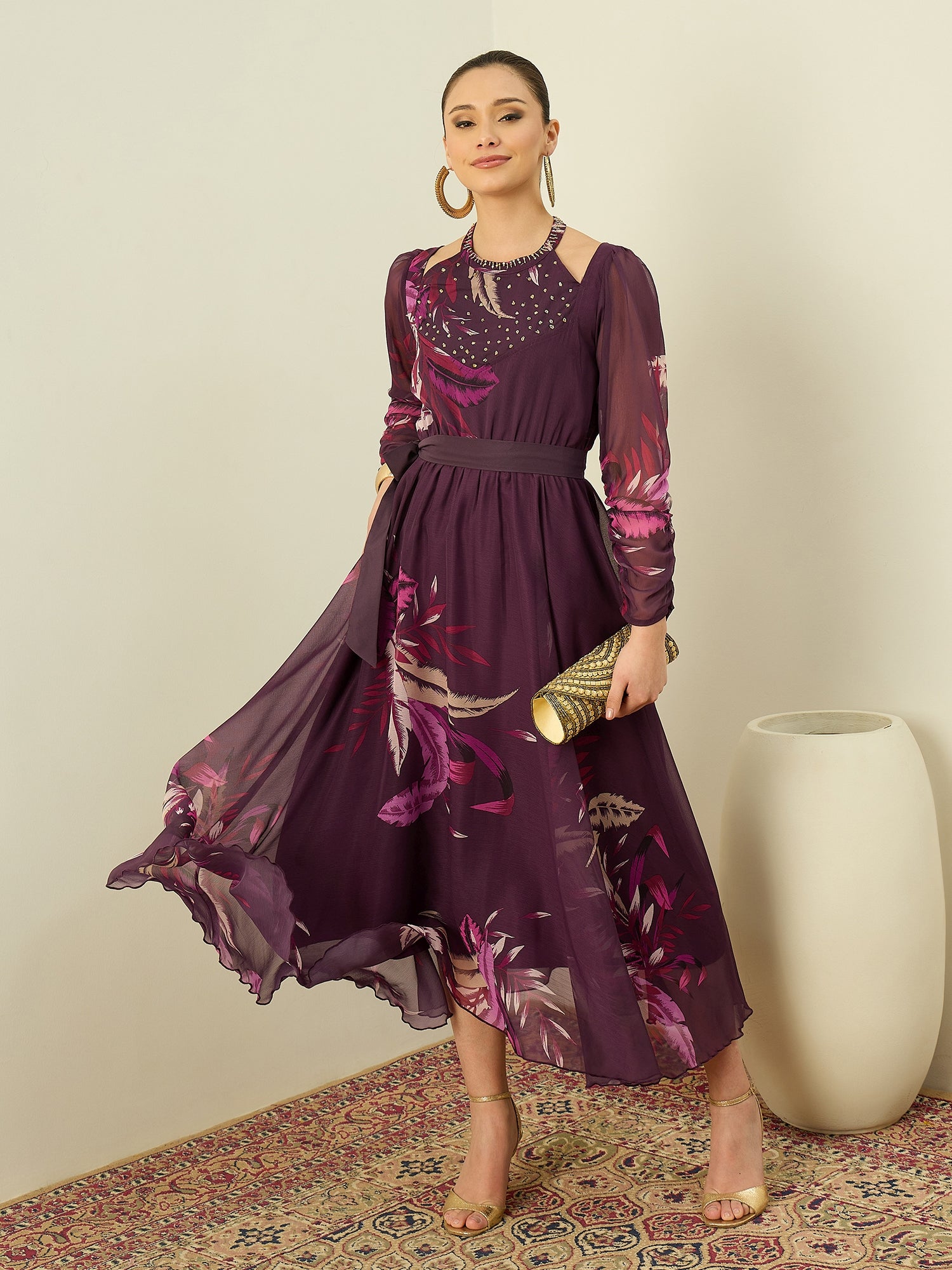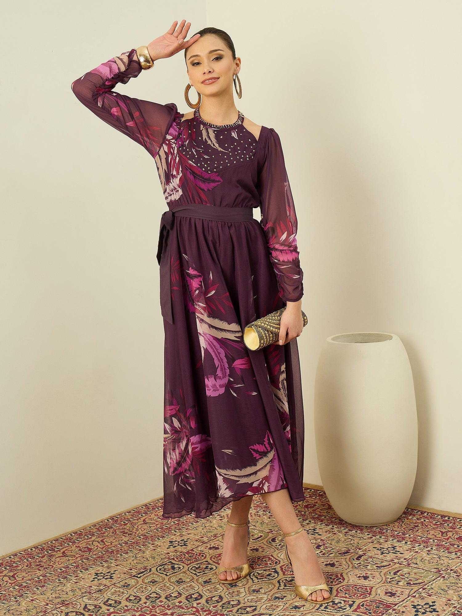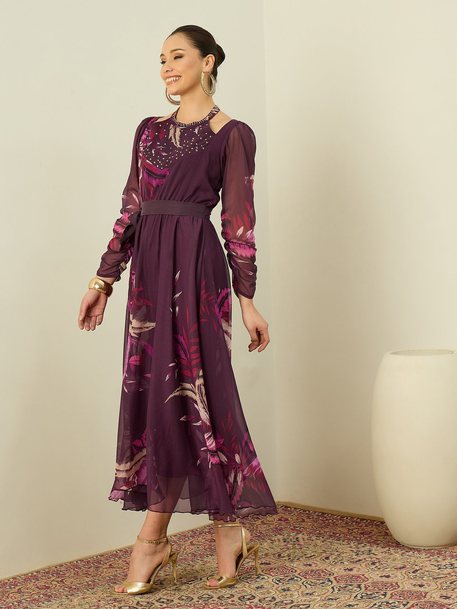 Antheaa Embellished Floral Print Halter Neck Chiffon Midi Dress