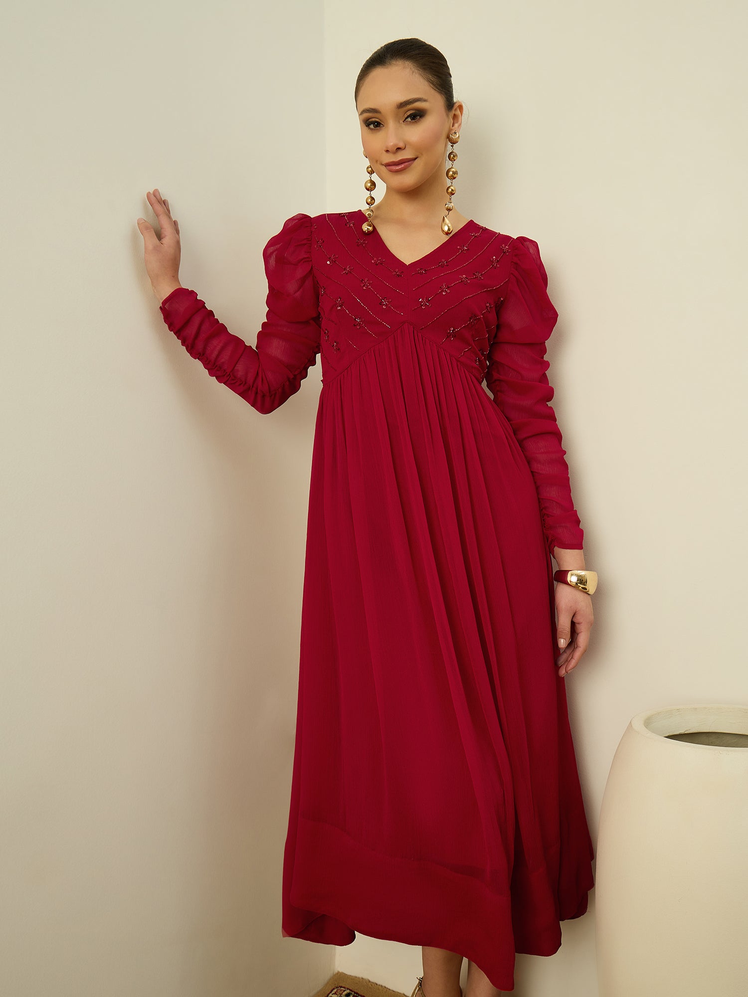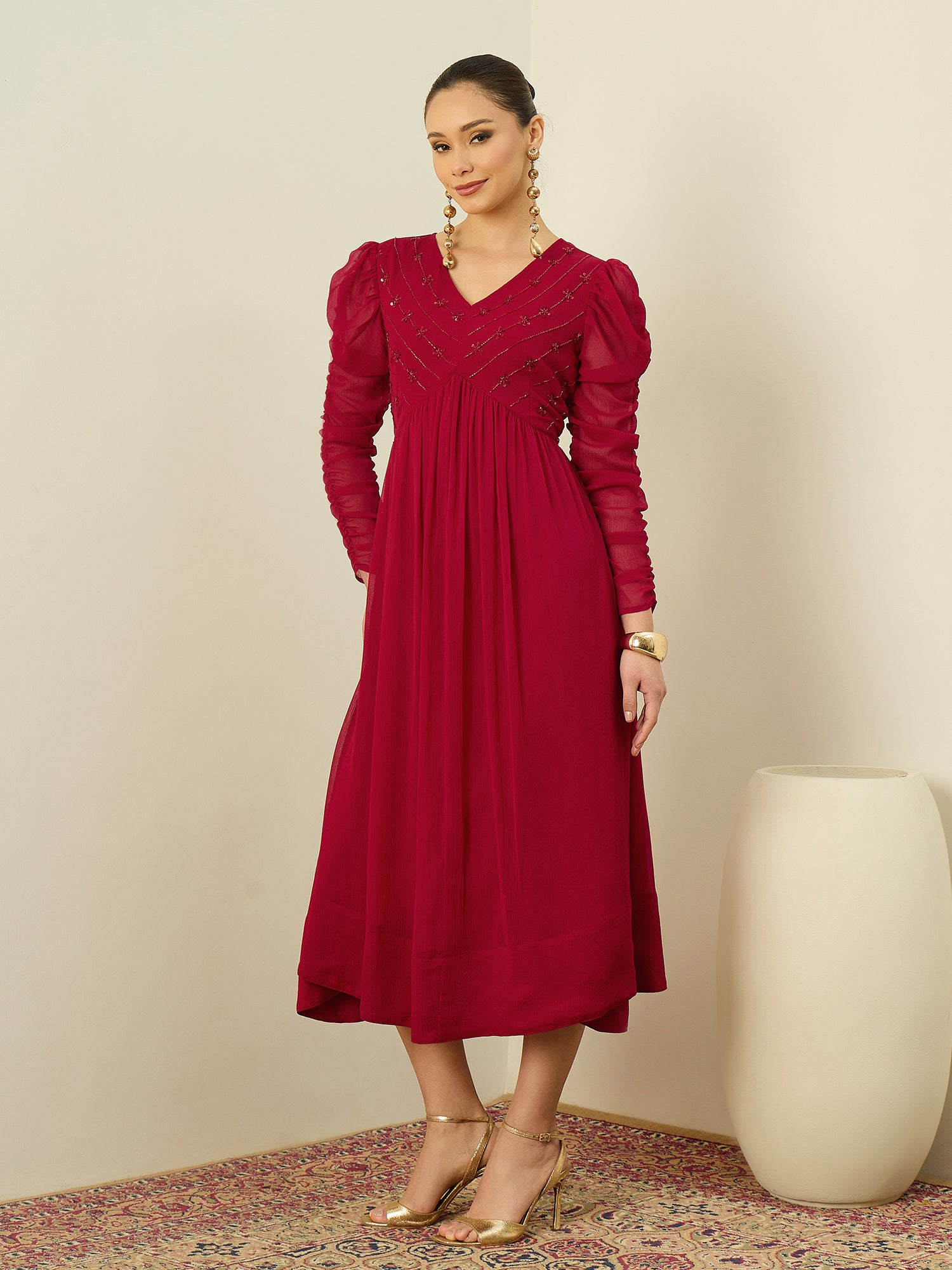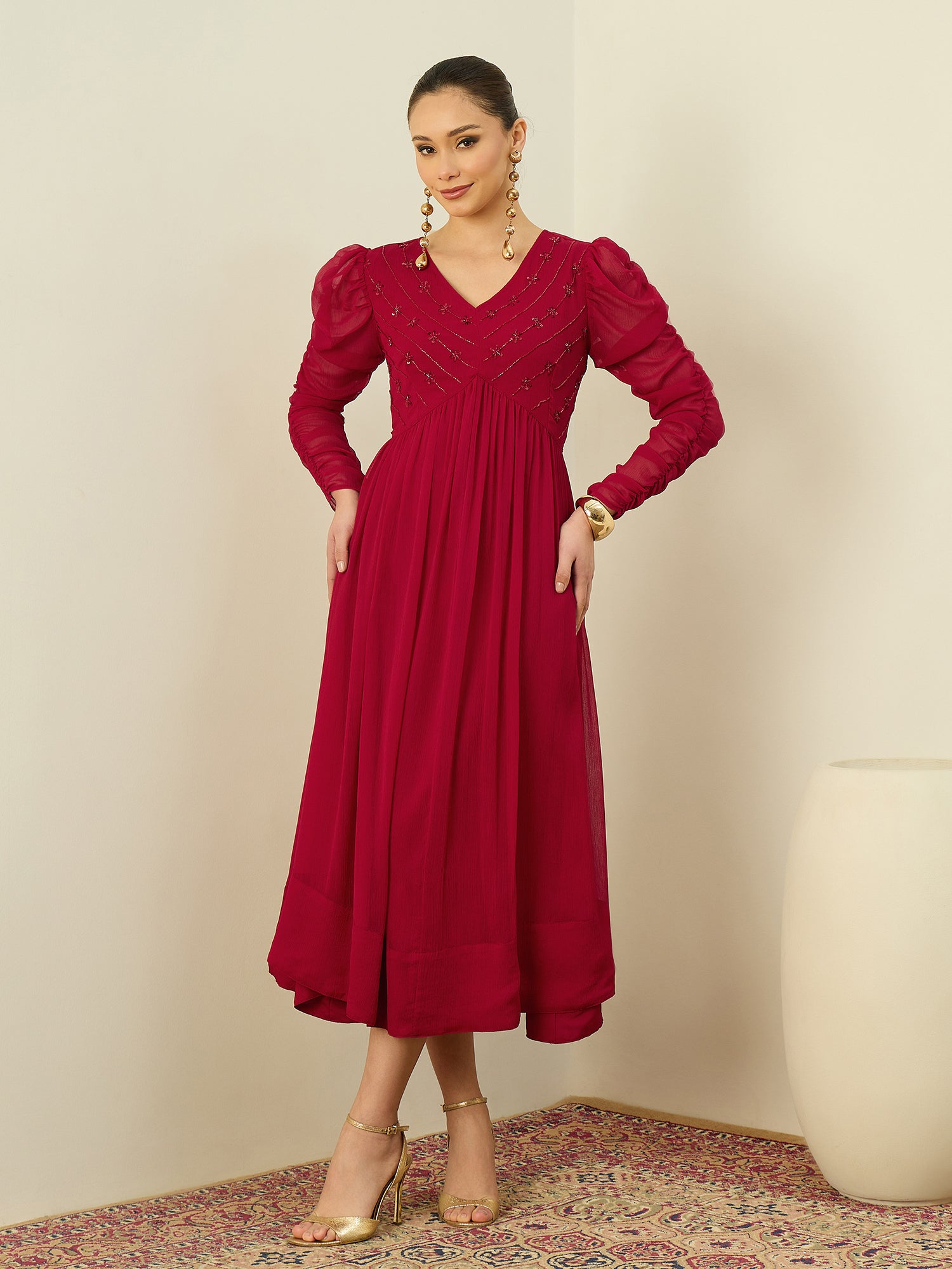 Antheaa Embellished Puff Sleeve Chiffon Fit & Flare Midi Dress