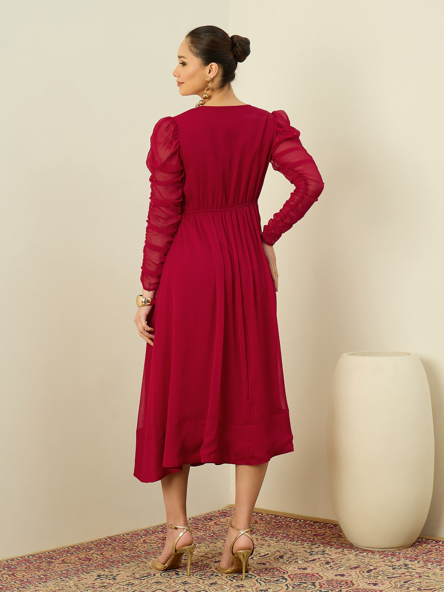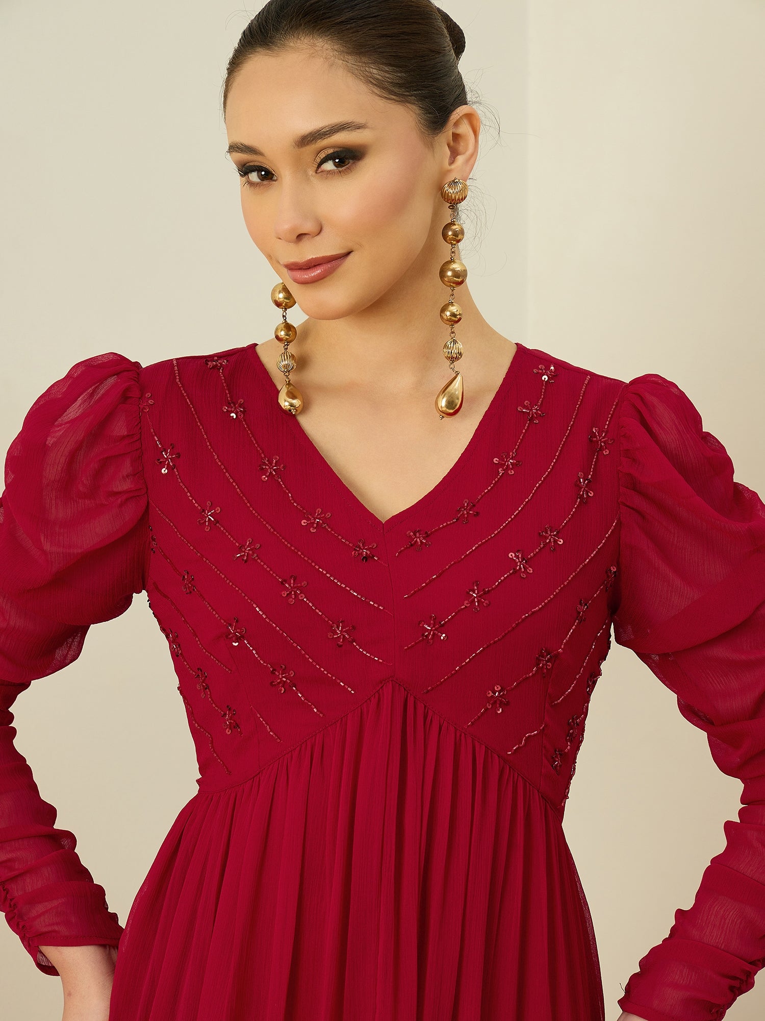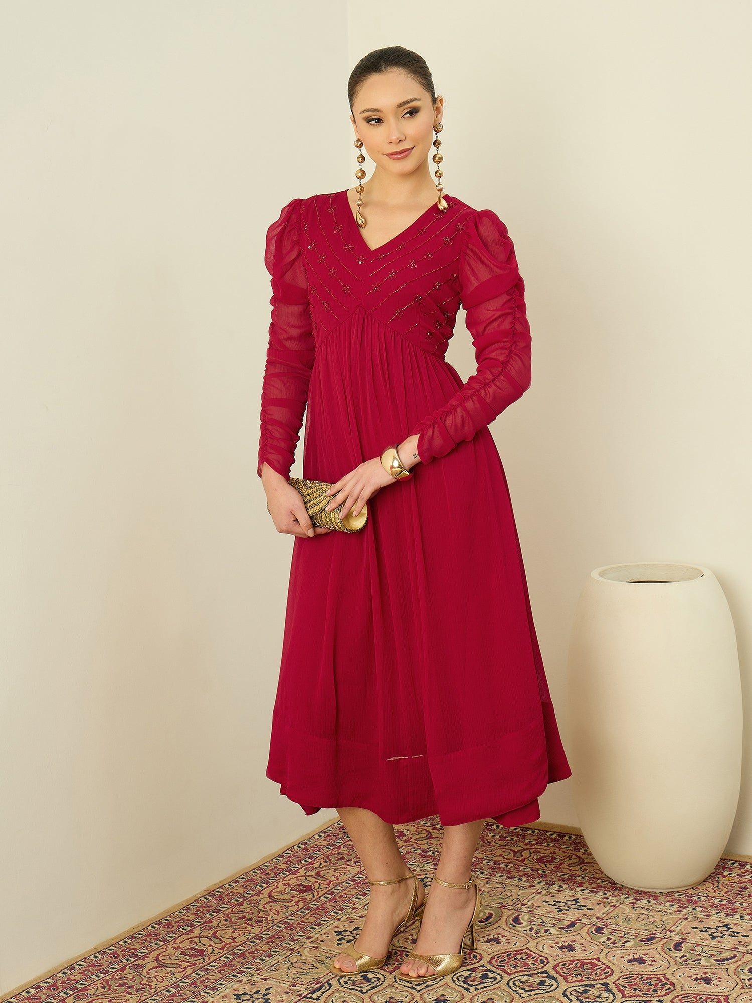 Antheaa Embellished Puff Sleeve Chiffon Fit & Flare Midi Dress