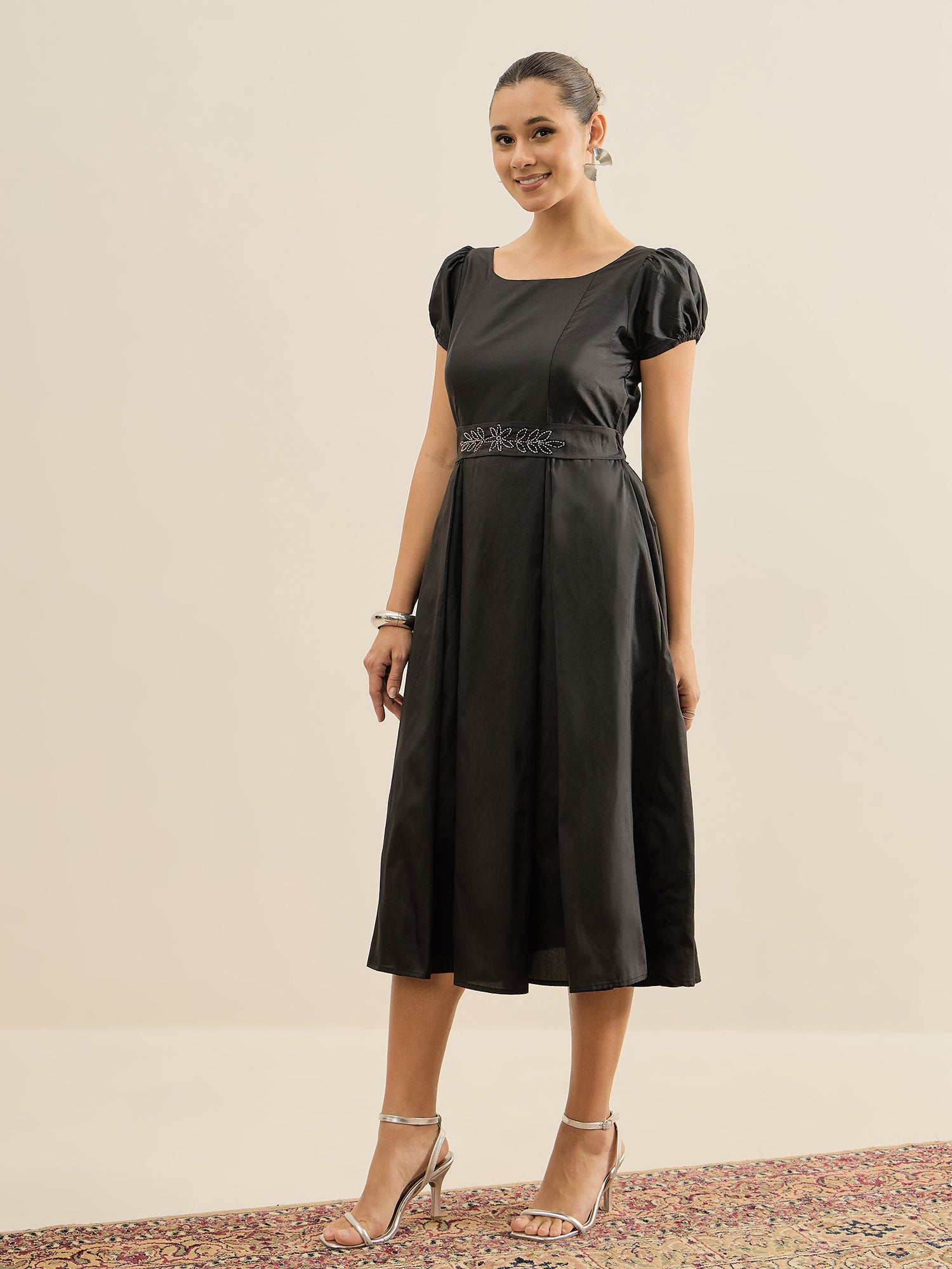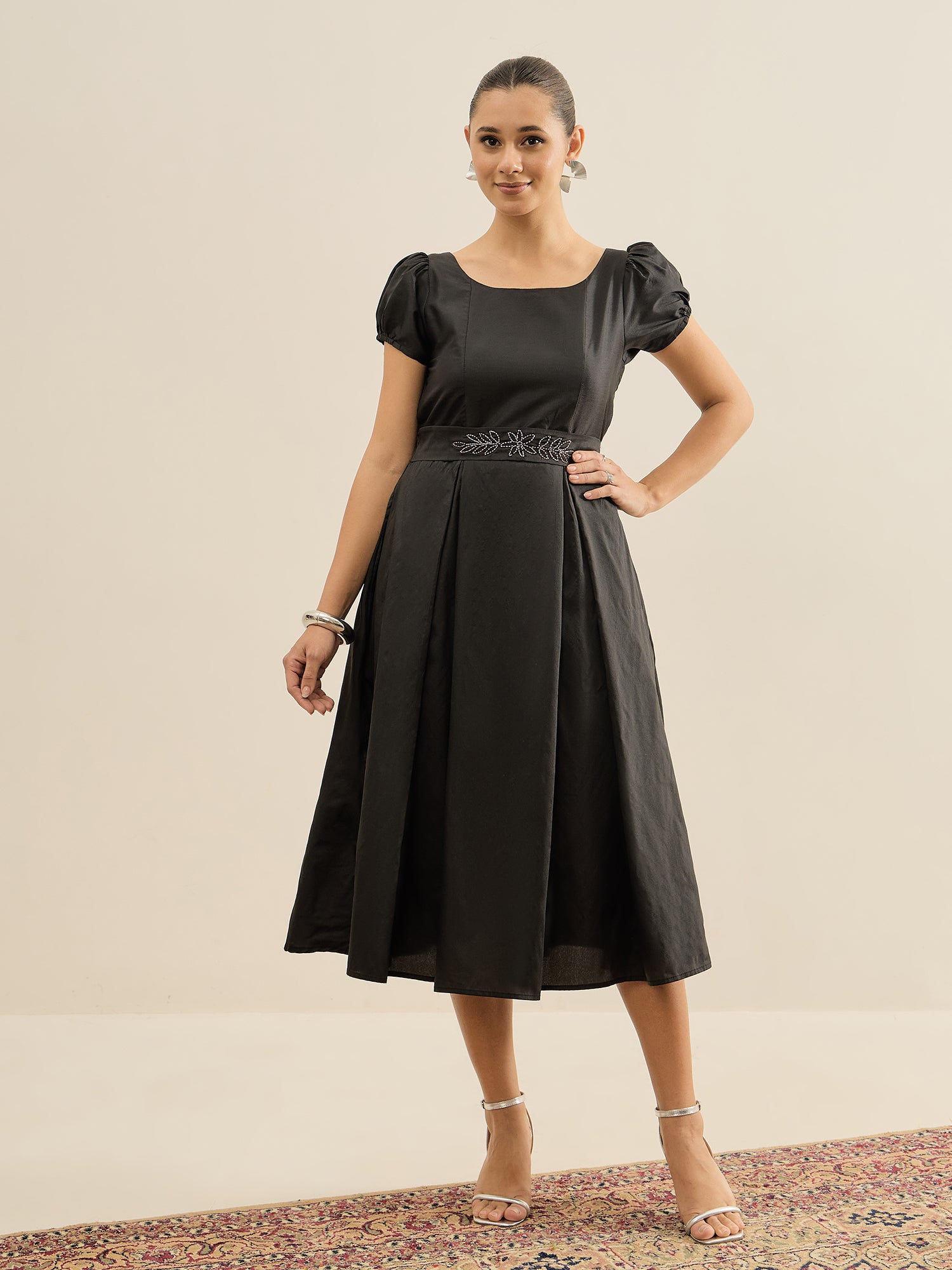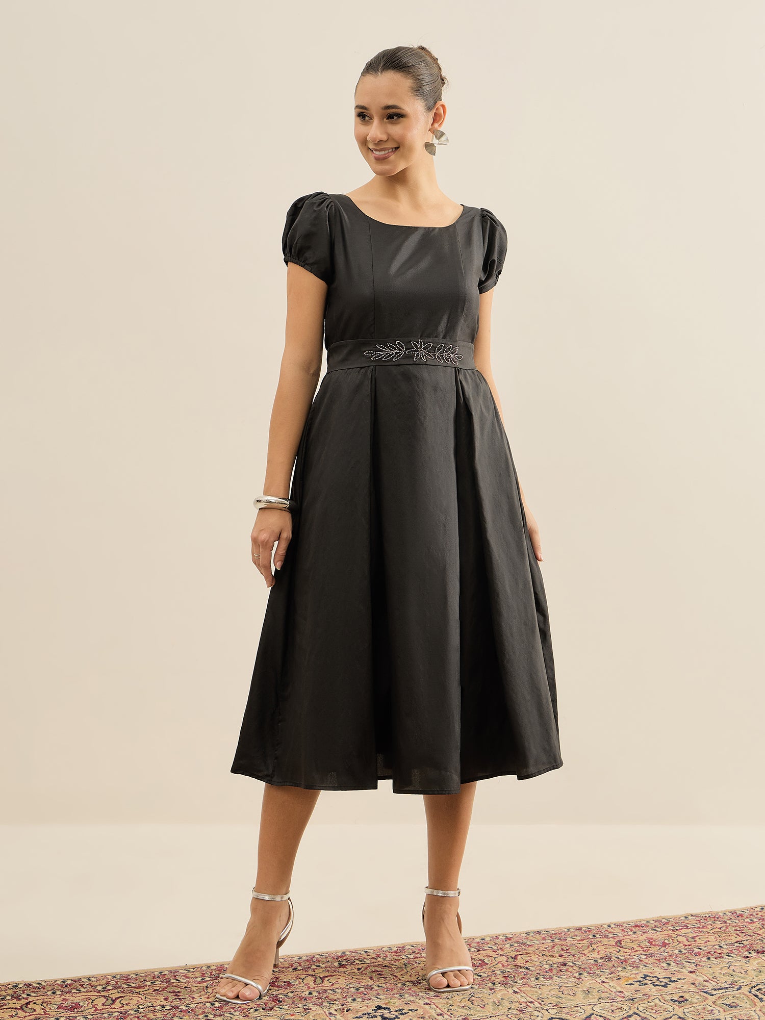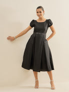 Antheaa Embellished Puff Sleeve Fit & Flare Midi Dress