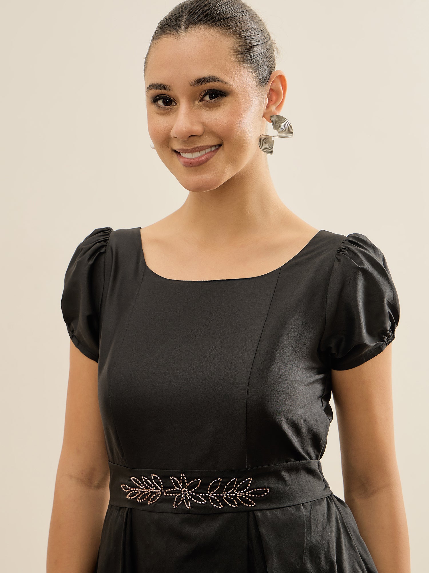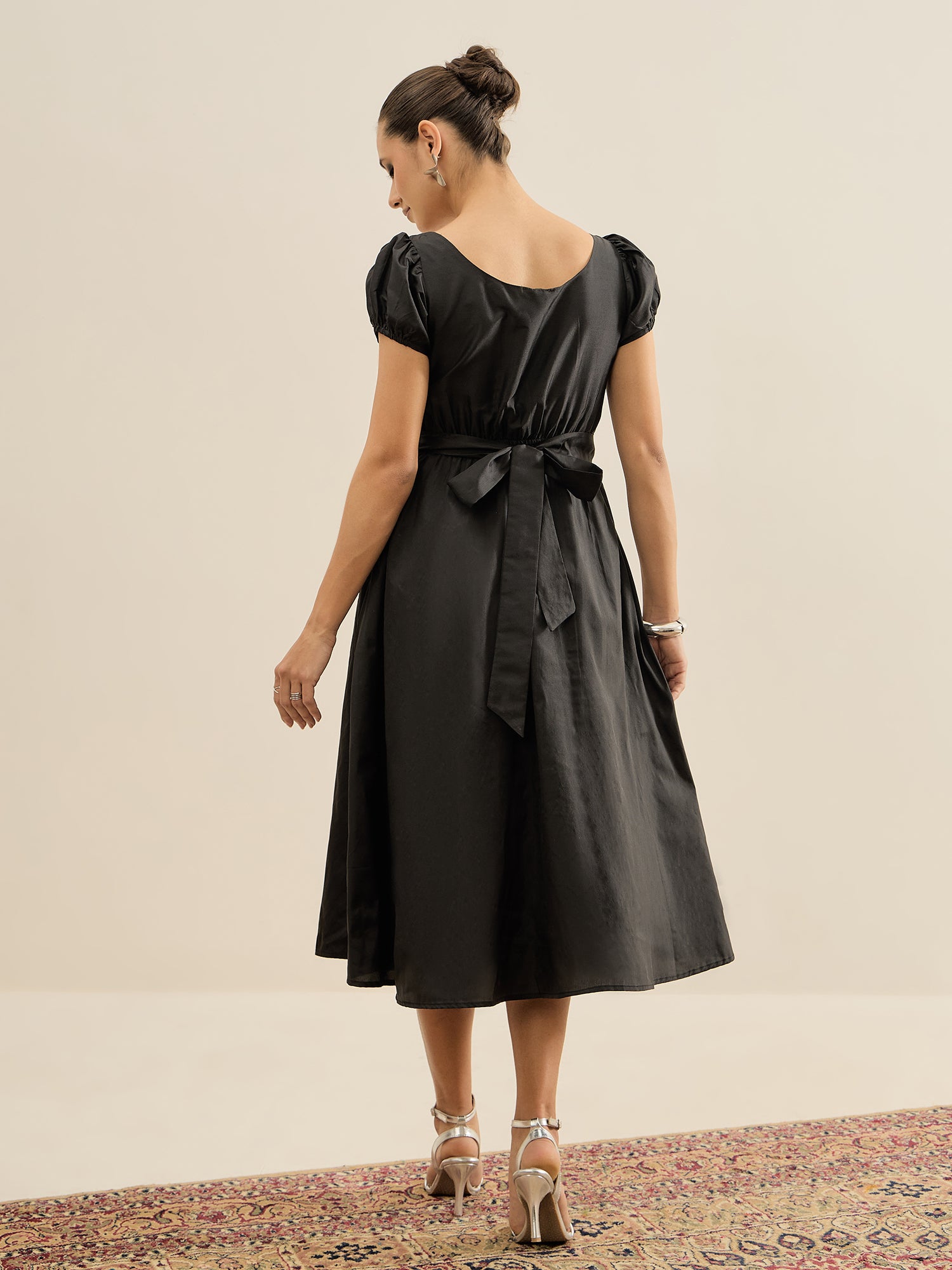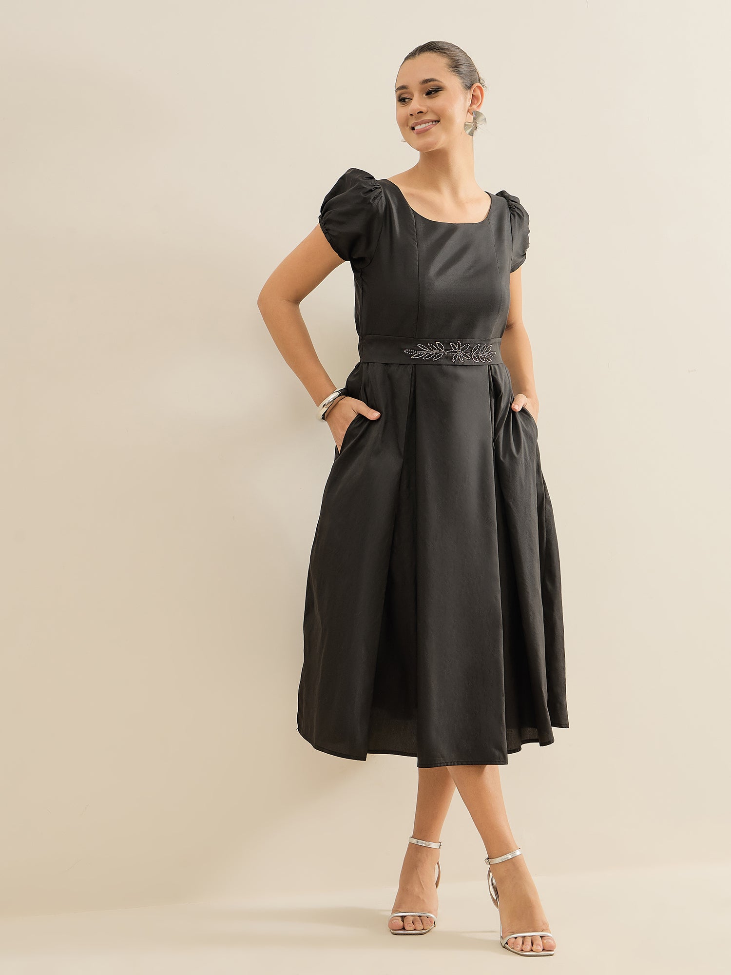 Antheaa Embellished Puff Sleeve Fit & Flare Midi Dress